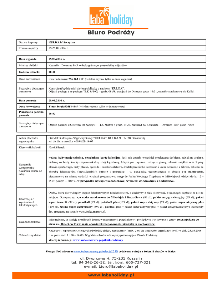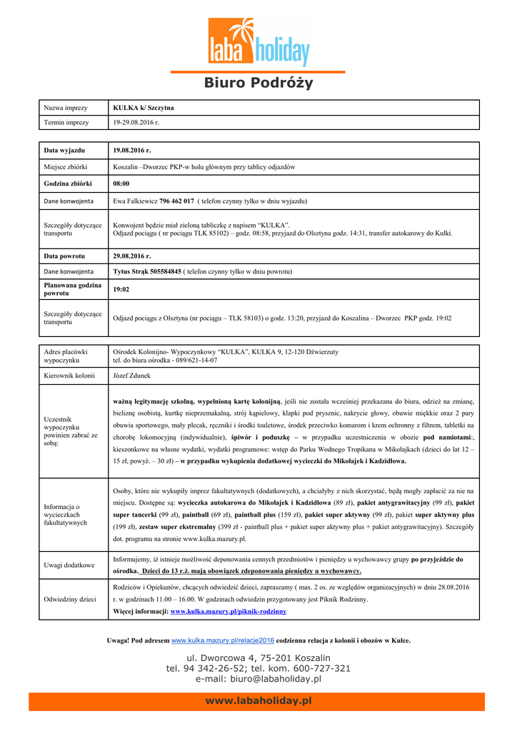Biuro Podróży Nazwa imprezy KULKA k/ Szczytna Termin imprezy 19-29.08.2016 r. Data wyjazdu 19.08.2016 r. Miejsce zbiórki Koszalin –Dworzec PKP-w holu głównym przy tablicy odjazdów Godzina zbiórki 08:00 Dane konwojenta Ewa Falkiewicz 796 462 017 ( telefon czynny tylko w dniu wyjazdu) Szczegóły dotyczące transportu Konwojent będzie miał zieloną tabliczkę z napisem “KULKA”. Odjazd pociągu ( nr pociągu TLK 85102) – godz. 08:58, przyjazd do Olsztyna godz. 14:31, transfer autokarowy do Kulki. Data powrotu 29.08.2016 r. Dane konwojenta Tytus Strąk 505584845 ( telefon czynny tylko w dniu powrotu) Planowana godzina powrotu 19:02 Szczegóły dotyczące transportu Odjazd pociągu z Olsztyna (nr pociągu – TLK 58103) o godz. 13:20, przyjazd do Koszalina – Dworzec PKP godz. 19:02 Adres placówki wypoczynku Ośrodek Kolonijno- Wypoczynkowy “KULKA”, KULKA 9, 12-120 Dźwierzuty tel. do biura ośrodka - 089/621-14-07 Kierownik kolonii Józef Zdunek ważną legitymację szkolną, wypełnioną kartę kolonijną, jeśli nie została wcześniej przekazana do biura, odzież na zmianę, Uczestnik wypoczynku powinien zabrać ze sobą: bieliznę osobistą, kurtkę nieprzemakalną, strój kąpielowy, klapki pod prysznic, nakrycie głowy, obuwie miękkie oraz 2 pary obuwia sportowego, mały plecak, ręczniki i środki toaletowe, środek przeciwko komarom i krem ochronny z filtrem, tabletki na chorobę lokomocyjną (indywidualnie), śpiwór i poduszkę – w przypadku uczestniczenia w obozie pod namiotami:, kieszonkowe na własne wydatki, wydatki programowe: wstęp do Parku Wodnego Tropikana w Mikołajkach (dzieci do lat 12 – 15 zł, powyż. – 30 zł) – w przypadku wykupienia dodatkowej wycieczki do Mikołajek i Kadzidłowa. Osoby, które nie wykupiły imprez fakultatywnych (dodatkowych), a chciałyby z nich skorzystać, będą mogły zapłacić za nie na Informacja o wycieczkach fakultatywnych miejscu. Dostępne są: wycieczka autokarowa do Mikołajek i Kadzidłowa (89 zł), pakiet antygrawitacyjny (99 zł), pakiet super tancerki (99 zł), paintball (69 zł), paintball plus (159 zł), pakiet super aktywny (99 zł), pakiet super aktywny plus (199 zł), zestaw super ekstremalny (399 zł - paintball plus + pakiet super aktywny plus + pakiet antygrawitacyjny). Szczegóły dot. programu na stronie www.kulka.mazury.pl. Uwagi dodatkowe Informujemy, iż istnieje możliwość deponowania cennych przedmiotów i pieniędzy u wychowawcy grupy po przyjeździe do ośrodka. Dzieci do 13 r.ż. mają obowiązek zdeponowania pieniędzy u wychowawcy. Rodziców i Opiekunów, chcących odwiedzić dzieci, zapraszamy ( max. 2 os. ze względów organizacyjnych) w dniu 28.08.2016 Odwiedziny dzieci r. w godzinach 11.00 – 16.00. W godzinach odwiedzin przygotowany jest Piknik Rodzinny. Więcej informacji: www.kulka.mazury.pl/piknik-rodzinny Uwaga! Pod adresem www.kulka.mazury.pl/relacje2016 codzienna relacja z kolonii i obozów w Kulce. ul. Dworcowa 4, 75-201 Koszalin tel. 94 342-26-52; tel. kom. 600-727-321 e-mail: [email protected] www.labaholiday.pl