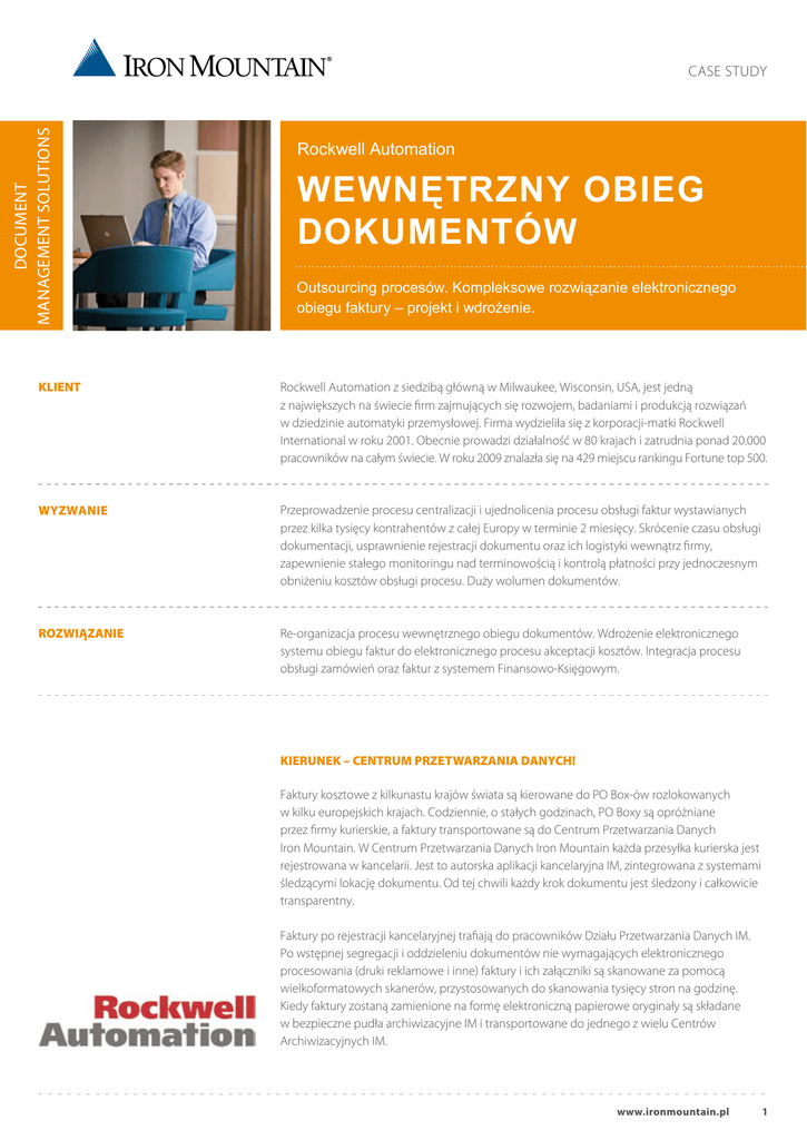 DOCUMENT MANAGEMENT SOLUTIONS CASE STUDY Rockwell Automation WEWNĘTRZNY OBIEG DOKUMENTÓW Outsourcing procesów. Kompleksowe rozwiązanie elektronicznego obiegu faktury – projekt i wdrożenie. KLIENT Rockwell Automation z siedzibą główną w Milwaukee, Wisconsin, USA, jest jedną z największych na świecie firm zajmujących się rozwojem, badaniami i produkcją rozwiązań w dziedzinie automatyki przemysłowej. Firma wydzieliła się z korporacji-matki Rockwell International w roku 2001. Obecnie prowadzi działalność w 80 krajach i zatrudnia ponad 20.000 pracowników na całym świecie. W roku 2009 znalazła się na 429 miejscu rankingu Fortune top 500. WYZWANIE Przeprowadzenie procesu centralizacji i ujednolicenia procesu obsługi faktur wystawianych przez kilka tysięcy kontrahentów z całej Europy w terminie 2 miesięcy. Skrócenie czasu obsługi dokumentacji, usprawnienie rejestracji dokumentu oraz ich logistyki wewnątrz firmy, zapewnienie stałego monitoringu nad terminowością i kontrolą płatności przy jednoczesnym obniżeniu kosztów obsługi procesu. Duży wolumen dokumentów. ROZWIĄZANIE Re-organizacja procesu wewnętrznego obiegu dokumentów. Wdrożenie elektronicznego systemu obiegu faktur do elektronicznego procesu akceptacji kosztów. Integracja procesu obsługi zamówień oraz faktur z systemem Finansowo-Księgowym. KIERUNEK – CENTRUM PRZETWARZANIA DANYCH! Faktury kosztowe z kilkunastu krajów świata są kierowane do PO Box-ów rozlokowanych w kilku europejskich krajach. Codziennie, o stałych godzinach, PO Boxy są opróżniane przez firmy kurierskie, a faktury transportowane są do Centrum Przetwarzania Danych Iron Mountain. W Centrum Przetwarzania Danych Iron Mountain każda przesyłka kurierska jest rejestrowana w kancelarii. Jest to autorska aplikacji kancelaryjna IM, zintegrowana z systemami śledzącymi lokację dokumentu. Od tej chwili każdy krok dokumentu jest śledzony i całkowicie transparentny. Faktury po rejestracji kancelaryjnej trafiają do pracowników Działu Przetwarzania Danych IM. Po wstępnej segregacji i oddzieleniu dokumentów nie wymagających elektronicznego procesowania (druki reklamowe i inne) faktury i ich załączniki są skanowane za pomocą wielkoformatowych skanerów, przystosowanych do skanowania tysięcy stron na godzinę. Kiedy faktury zostaną zamienione na formę elektroniczną papierowe oryginały są składane w bezpieczne pudła archiwizacyjne IM i transportowane do jednego z wielu Centrów Archiwizacyjnych IM. www.ironmountain.pl 1 Rockwell Automation CO DALEJ? To jednak nie koniec pracy z samym dokumentem. Każda faktura - już w postaci elektronicznej - jest kategoryzowana pod kątem miejsca powstawania kosztów, jej typu oraz rodzaju. Następnie jest opisywana zestawem atrybutów biznesowych (numer faktury, kwoty, dane kontrahenta, data wystawienia i inne) pozwalających podjąć decyzję merytoryczną w kwestii płatności. Unikalny moduł do indeksacji danych pozwala zminimalizować niezgodności i sprawdza poprawność wprowadzonych danych. Zeskanowana faktura wraz z jej załącznikami oraz zestawem opisujących ją atrybutów jest następnie importowana do systemu IM Workflow, za pomocą bezpiecznych Web-service’ów sprawdzających kompletność i poprawność importowanych danych, otrzymując raporty zwrotne z systemu docelowego. SZYBCIEJ, TANIEJ, BEZPIECZNIEJ Dzięki współpracy z Iron Mountain Polska, firma Rockwell Automation zmniejszyła koszty obsługi obiegu dokumentów skracając kilkukrotnie czas obsługi jednej faktury „per capita” na pracownika firmy. Integracja elektronicznego obiegu dokumentów z bazą kontrahentów oraz procesem obsługi zamówień zapewniła pełną kontrolę wydatków przy jednoczesnym zapewnieniu terminowości płatności wynikających ze zobowiązań. Nie ma możliwości „przetrzymania” dokumentu na dnie szuflady biurka, bo jego papierowy oryginał spokojnie leży w archiwum, a pracownicy Rockwell Automation pracują na jego elektronicznej kopii. Każdy etap procesu obsługi faktur kosztowych, materiałowych oraz odpowiednich korekt wartościowych i ilościowych jest monitorowany i raportowany: od momentu wysłania faktury przez kontrahenta, wpłynięcia do firmy, przez poszczególne etapy jej akceptacji, aż do zamknięcia procesu, czyli płatności. Na podstawie obrazów faktur oraz wprowadzonych do systemów Klienta danych, pracownicy Działu Księgowego Rockwell Automation podejmują decyzje związane z płatnością danej faktury, przy zachowaniu pełnej transparentności procesu dekretacji i akceptacji. Następnie, dzięki zintegrowaniu systemu IM Workflow z bazami kontrahentów oraz systemem finansowo-księgowym Rockwell Automation, dokonują automatycznego księgowania pozycji kosztowych bezpośrednio w systemie Finansowo-Księgowym. KLUCZ DO SUKCESU Sukces wdrożenia jest wynikiem ścisłej współpracy pomiędzy Rockwell Automation i Iron Mountain. Konsultanci Iron Mountain zaproponowali rozwiązanie dopasowane do potrzeb Klienta i zgodne z jego wymaganiami. Mimo krótkiego czasu przeznaczonego na projekt i wdrożenie, zostało wypracowane rozwiązanie, które umożliwia sprawny monitoring zadań, jeszcze lepszą organizację pracy i zapewnia pełną kontrolę nad procesem. Po zaksięgowaniu faktury, dane potwierdzające koniec procesu są odnotowywane w systemie. Historia procesu akceptacji, jak również sam dokument, jest dostępny do wglądu dla uprawnionych użytkowników w celach raportowych, audytowych lub innych – bez potrzeby sięgania do papierowego oryginału – oraz ponoszenia kosztów i czasu związanych z jego odnalezieniem. Iron Mountain Polska Sp. z o.o. WARSZAWA ul. Regulska 2 Reguły k/Warszawy 05-820 Piastów O IRON MOUNTAIN. Iron Mountain Incorporated (NYSE: IRM) świadczy usługi zarządzania informacją, pomaga obniżać koszty, zmniejsza ryzyko utraty danych tradycyjnych i cyfrowych. Założona w 1951 roku, Iron Mountain zarz