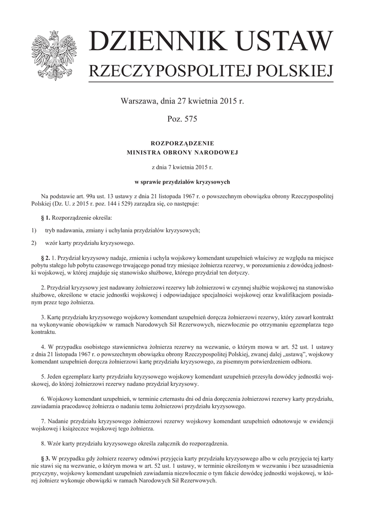 DZIENNIK USTAW RZECZYPOSPOLITEJ POLSKIEJ Warszawa, dnia 27 kwietnia 2015 r. Poz. 575 ROZPORZĄDZENIE MINISTRA OBRONY NARODOWEJ z dnia 7 kwietnia 2015 r. w sprawie przydziałów kryzysowych Na podstawie art. 99a ust. 13 ustawy z dnia 21 listopada 1967 r. o powszechnym obowiązku obrony Rzeczypospolitej Polskiej (Dz. U. z 2015 r. poz. 144 i 529) zarządza się, co następuje: § 1. Rozporządzenie określa: 1) tryb nadawania, zmiany i uchylania przydziałów kryzysowych; 2) wzór karty przydziału kryzysowego. § 2. 1. Przydział kryzysowy nadaje, zmienia i uchyla wojskowy komendant uzupełnień właściwy ze względu na miejsce pobytu stałego lub pobytu czasowego trwającego ponad trzy miesiące żołnierza rezerwy, w porozumieniu z dowódcą jednostki wojskowej, w której znajduje się stanowisko służbowe, którego przydział ten dotyczy. 2. Przydział kryzysowy jest nadawany żołnierzowi rezerwy lub żołnierzowi w czynnej służbie wojskowej na stanowisko służbowe, określone w etacie jednostki wojskowej i odpowiadające specjalności wojskowej oraz kwalifikacjom posiadanym przez tego żołnierza. 3. Kartę przydziału kryzysowego wojskowy komendant uzupełnień doręcza żołnierzowi rezerwy, który zawarł kontrakt na wykonywanie obowiązków w ramach Narodowych Sił Rezerwowych, niezwłocznie po otrzymaniu egzemplarza tego kontraktu. 4. W przypadku osobistego stawiennictwa żołnierza rezerwy na wezwanie, o którym mowa w art. 52 ust. 1 ustawy z dnia 21 listopada 1967 r. o powszechnym obowiązku obrony Rzeczypospolitej Polskiej, zwanej dalej „ustawą”, wojskowy komendant uzupełnień doręcza żołnierzowi kartę przydziału kryzysowego, za pisemnym potwierdzeniem odbioru. 5. Jeden egzemplarz karty przydziału kryzysowego wojskowy komendant uzupełnień przesyła dowódcy jednostki wojskowej, do której żołnierzowi rezerwy nadano przydział kryzysowy. 6. Wojskowy komendant uzupełnień, w terminie czternastu dni od dnia doręczenia żołnierzowi rezerwy karty przydziału, zawiadamia pracodawcę żołnierza o nadaniu temu żołnierzowi przydziału kryzysowego. 7. Nadanie przydziału kryzysowego żołnierzowi rezerwy wojskowy komendant uzupełnień odnotowuje w ewidencji wojskowej i książeczce wojskowej tego żołnierza. 8. Wzór karty przydziału kryzysowego określa załącznik do rozporządzenia. § 3. W przypadku gdy żołnierz rezerwy odmówi przyjęcia karty przydziału kryzysowego albo w celu przyjęcia tej karty nie stawi się na wezwanie, o którym mowa w art. 52 ust. 1 ustawy, w terminie określonym w wezwaniu i bez uzasadnienia przyczyny, wojskowy komendant uzupełnień zawiadamia niezwłocznie o tym fakcie dowódcę jednostki wojskowej, w której żołnierz wykonuje obowiązki w ramach Narodowych Sił Rezerwowych. Dziennik Ustaw –2– Poz. 575 § 4. Dowódca jednostki wojskowej po otrzymaniu karty przydziału kryzysowego lub zawiadomienia, o którym mowa w § 3, stwierdza w rozkazie dziennym jednostki wojskowej fakt nadania przydziału kryzysowego żołnierzowi rezerwy albo wygaśnięcia kontraktu. § 5. 1. Doręczenie karty przydziału kryzysowego żołnierzowi rezerwy odbywającemu ćwiczenia wojskowe może nastąpić za pośrednictwem dowódcy jednostki wojskowej, w której odbywają się te ćwiczenia. 2. W celu doręczenia karty przydziału kryzysowego żołnierzowi rezerwy odbywającemu ćwiczenia wojskowe wojskowy komendant uzupełnień przesyła dowódcy jednostki wojskowej, w której odbywają się te ćwiczenia, za potwierdzeniem odbioru, trzy egzemplarze karty przydziału kryzysowego. 3. Potwierdzenie odbioru zawiera informację o liczbie egzemplarzy karty przydziału kryzysowego oraz jej serię i numer. 4. Dowódca jednostki wojskowej, w której odbywają się ćwiczenia wojskowe, niezwłocznie po otrzymaniu karty przydziału kryzysowego, jednak nie później niż w ostatnim dniu odbywania tych ćwiczeń, doręcza pierwszy jej egzemplarz żołnierzowi rezerwy odbywającemu ćwiczenia wojskowe, a drugi egzemplarz włącza do akt sprawy. 5. Po doręczeniu karty przydziału kryzysowego dowódca jednostki wojskowej, w której odbywają się ćwiczenia wojskowe, przesyła wojskowemu komendantowi uzupełnień trzeci egzemplarz karty przydziału kryzysowego, na którym żołnierz rezerwy odbywający ćwiczenia wojskowe potwierdził jej odbiór. 6. W przypadku odmowy przyjęcia w określonym terminie karty przydziału kryzysowego przez żołnierza rezerwy odbywającego ćwiczenia wojskowe lub braku możliwości jej doręczenia dowódca jednostki wojskowej, w której odbywają się te ćwiczenia, zwraca niezwłocznie wojskowemu komendantowi uzupełnień wszystkie egzemplarze karty przydziału kryzysowego. § 6. 1. W przypadku zaistnienia okoliczności, o których mowa w art. 99a ust. 9 pkt 2–6 ustawy, dowódca jednostki wojskowej przesyła do wojskowego komendanta uzupełnień wniosek o zmianę przydziału kryzysowego wraz z uzasadnieniem. 2. W przypadku rozformowania jednostki wojskowej dowódca jednostki wojskowej może ograniczyć uzasadnienie wniosku o zmianę przydziału kryzysowego do stwierdzenia konieczności zmiany tego przydziału w związku z rozformowaniem jednostki wojskowej. Do wniosku dowódca jednostki wojskowej dołącza pisemną zgodę żołnierza rezerwy na wykonywanie obowiązków na stanowisku służbowym w innej niż dotychczasowa jednostce wojskowej. 3. W przypadku gdy o zmianę przydziału kryzysowego wnioskuje żołnierz rezerwy, dowódca jednostki wojskowej niezwłocznie, jednak nie później niż w terminie siedmiu dni od dnia złożenia wniosku, przesyła ten wniosek wraz z aktami sprawy i adnotacją o propozycji jego rozpatrzenia wojskowemu komendantowi uzupełnień. 4. Zmiana przydziału kryzysowego, o ile nie dotyczy stanowisk służbowych określonych w kontrakcie, wymaga uprzedniej zmiany kontraktu. 5. Decyzję o zmianie przydziału kryzysowego lub o odmowie zmiany przydziału kryzysowego wojskowy komendant uzupełnień