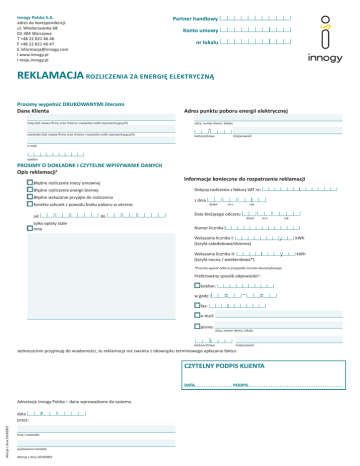 innogy Polska S.A. adres do korespondencji: ul. Włodarzewska 68 02-384 Warszawa T +48 22 821 46 46 F +48 22 821 46 47 E [email protected] I www.innogy.pl I moje.innogy.pl Partner handlowy Konto umowy nr lokalu REKLAMACJA ROZLICZENIA ZA ENERGIĘ ELEKTRYCZNĄ Prosimy wypełnić DRUKOWANYMI literami Dane Klienta Adres punktu poboru energii elektrycznej imię (lub nazwa firmy oraz imiona i nazwiska osób reprezentujących) ulica, numer domu, lokalu nazwisko (lub nazwa firmy oraz imiona i nazwiska osób reprezentujących) kod pocztowy e-mail telefon PROSIMY O DOKŁADNE I CZYTELNE WPISYWANIE DANYCH Opis reklamacji1 Błędne rozliczenie mocy umownej Błędne rozliczenie energii biernej Błędne wskazanie przyjęte do rozliczenia Korekta zaliczek z powodu braku poboru w okresie: od miejscowość Informacje konieczne do rozpatrzenia reklamacji Dotyczy rozliczenia z faktury VAT nr: do tylko opłaty stałe Inne z dnia dzień m-c rok Data bieżącego odczytu dzień m-c rok Numer licznika Wskazania licznika I: (taryfa całodobowa/dzienna) kWh Wskazania licznika II: (taryfa nocna / weekendowa*) kWh *Prosimy wpisać tylko w przypadku licznika dwutaryfowego. Preferowany sposób odpowiedzi1: telefon: – w godz: fax: e-mail: pismo: ulica, numer domu, lokalu kod pocztowy miejscowość Jednocześnie przyjmuję do wiadomości, że reklamacja nie zwalnia z obowiązku terminowego opłacania faktur. CZYTELNY PODPIS KLIENTA DATA. . . . . . . . . . . . . . . . . PODPIS. . . . . . . . . . . . . . . . . . . . . . . . . . . . . . . . . . . . . . . . . . Adnotacje innogy Polska – dane wprowadzone do systemu Wersja z dnia 20160902 data przez: imię i nazwisko wystawiono korektę Wersja z dnia 20160902