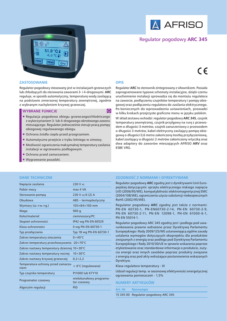 Regulator pogodowy ARC 345 ZASTOSOWANIE OPIS Regulator pogodowy stosowany jest w instalacjach grzewczych lub chłodzących do sterowania zaworami 3- i 4-drogowymi. ARC reguluje, w sposób automatyczny, temperaturę wody zasilającą na podstawie zmierzonej temperatury zewnętrznej, zgodnie z wybranym nachyleniem krzywej grzewczej. Regulator ARC to sterownik zintegrowany z siłownikiem. Posiada zaprogramowane typowe schematy instalacyjne, dzięki czemu uruchomienie instalacji sprowadza się do montażu regulatora na zaworze, podłączeniu czujników temperatury i pompy obiegowej oraz podłączeniu regulatora do zasilania elektrycznego. Po koniecznych do wprowadzenia ustawieniach, prowadzi w kilku krokach przejrzyste graficzne menu w języku polskim. WYBRANE FUNKCJE ■■ Regulacja pogodowa obiegu grzewczego/chłodniczego z wykorzystaniem 3- lub 4-drogowego obrotowego zaworu mieszającego. Regulator jednocześnie steruje pracą pompy obiegowej regulowanego obiegu. ■■ Ochrona źródła ciepła przed przegrzaniem. ■■ Automatyczne przejście z trybu letniego w zimowy. ■■ Możliwość ograniczenia maksymalnej temperatury zasilania instalacji w ogrzewaniu podłogowym. W skład zestawu wchodzi: regulator pogodowy ARC 345, czujnik temperatury zewnętrznej, czujnik przylgowy na rurę z przewodem o długości 3 metrów, czujnik zanurzeniowy z przewodem o długości 3 metrów, kabel elektryczny zasilający pompę obiegową o długości 0,6 metra zakończony kostką przyłączeniową, kabel zasilający o długości 2 metrów zakończony wtyczką oraz dwa adaptery do zaworów mieszających AFRISO ARV oraz ESBE VRG. ■■ Ochrona przed zamarzaniem. ■■ Wygrzewanie posadzki. DANE TECHNICZNE ZGODNOŚĆ Z NORMAMI I DYREKTYWAMI Napięcie zasilania 230 V ac Pobór mocy max 4 VA Sterowanie pompą 230 V ac /4 (2) A Obudowa ABS – termoplastyczny Wymiary (sz.×w.×g.) 105×84×100 mm Waga 900 g Kolor/materiał ciemnoszary/PC Stopień ochronności IP42 wg PN-EN 60529 Klasa ochronności II wg PN-EN 60730-1 Typ przełączania Typ 1B wg PN-EN 60730-1 Zakres temperatury otoczenia 0÷40°C Zakres temperatury przechowywania -20÷70°C Zakres nastawy temperatury dziennej 10÷30°C Zakres nastawy temperatury nocnej 10÷30°C Zakres nastawy krzywej grzewczej 0,2÷2,2 Temperatura ochrony przed zamarza+ 6°C (regulowana) niem Typ czujnika temperatury Pt1000 lub KTY10 Programator czasowy wielokanałowy programator czasowy Algorytm regulacji PID Regulator pogodowy ARC zgodny jest z dyrektywami Unii Europejskiej dotyczącymi: sprzętu elektrycznego niskiego napięcia LVD (2006/95/WE), kompatybilności elektromagnetycznej EMC (2004/108/WE), ograniczenia użycia substancji niebezpiecznych RoHS (2002/95/WE). Regulator pogodowy ARC zgodny jest także z normami: PN-EN 60730-1, PN-EN60730-2-14, PN-EN 60730‑2-9, PN-EN 60730-2-11, PN-EN 12098-1, PN-EN 61000-6-1, PN-EN 55014‑1. Regulator pogodowy ARC 345 zgodny jest i podlega pod uwarunkowania prawne wdrożone przez Dyrektywę Parlamentu Europejskiego i Rady 2009/125/WE ustanawiającą ogólne zasady ustalania wymogów dotyczących ekoprojektu dla produktów związanych z energią oraz podlega pod Dyrektywę Parlamentu Europejskiego i Rady 2010/30/UE w sprawie wskazania poprzez etykietowanie oraz standardowe informacje o produkcie, zużycia energii oraz innych zasobów poprzez produkty związane z energią oraz pod akty wdrażające postanowienia wskazanych Dyrektyw. Klasa regulatora temperatury - III Udział regulacji temp. w sezonowej efektywności energetycznej ogrzewania pomieszczeń - 1,5% NUMERY ARTYKUŁÓW Art.‑Nr Nazwa/opis 15 345 00 Regulator pogodowy ARC 345