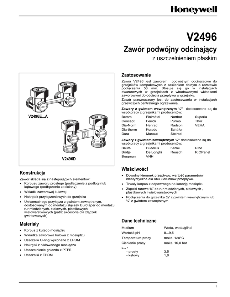 V2496 Zawór podwójny odcinający z uszczelnieniem płaskim Zastosowanie Zawór V2496 jest zaworem podwójnym odcinającym do grzejników kompaktowych z zasilaniem dolnym o rozstawie podłączenia 50 mm. Stosuje się go w instalacjach dwururowych w grzejnikach z wbudowanymi wkładkami zaworowymi do odcięcia przepływu w grzejniku. Zawór przeznaczony jest do zastosowania w instalacjach grzewczych centralnego ogrzewania. Zawory z gwintem wewnętrznym ½” dostosowane są do współpracy z grzejnikami producentów: Bemm Finimètal Northor Superia Concept Ferroli Purmo Thor Dia-Norm Henrad Radson VEHA Dia-therm Korado Schäfer Dura Manaut Stelrad V2496E...A V2496D Konstrukcja Zawór składa się z następujących elementów: Korpusu zaworu prostego (podłączenie z podłogi) lub kątowego (podłączenie ze ściany) Wkładki zaworowej kulowej Nakrętek przyłączeniowych do grzejnika Uniwersalnego przyłącza z gwintem zewnętrznym, dostosowanym do montażu złączek Eurotaper do montażu rur miedzianych, stalowych, plastikowych i wielowarstwowych (patrz akcesoria dla złączek gwintowanych) Materiały Korpus z kutego mosiądzu Wkładka zaworowa kulowa z mosiądzu Uszczelki O-ring wykonane z EPDM Nakrętki z niklowanego mosiądzu Uszczelnienie gniazda z PTFE Uszczelki z EPDM Zawory z gwintem zewnętrznym ¾” dostosowane są do współpracy z grzejnikami producentów: Baufa Buderus Kermi Ribe Brötje De Longhi Reusch RIOPanel Brugman VNH Właściwości Dowolny kierunek przepływu; wartość parametrów identyntyczna dla obu kierunków przepływu. Trwały korpus z odpowrnego na korozję mosiądzu Złączki rurowe ¾” do rur miedzianych, stalowych , plastikowych i wielowarstwowych Podłączenia do grzejnika ½” z gwintem wewnętrznym lub ¾” z gwintem zewnętrznym Dane techniczne Medium Woda, woda/glikol Wartość pH 8...9,5 Temperatura pracy maks. 120°C Ciśnienie pracy maks. 10,0 bar kvs : - prosty - kątowy 3,5 1,8 1 VERAFIX VKE (V2496) Zasada działania Zasilanie lub powrót grzejnika może być odcięte poprzez przekręcenie śrobokrętem wkładki zaworowej kulowej w pozycję poziomą. Zawory są fabrycznie otwarte. Wymiary Rys. 1. Zawór Verafix-VKE kątowy z płaską uszczelką i stożkiem Rys. 2. Zawór Verafix-VKE kątowy z płaską uszczelką i redukcją ¾”x ½” Rys. 3. Zawór Verafix-VKE prosty z płaską uszczelką i stożkiem Rys. 4. Zawór Verafix-VKE prosty z płaską uszczelką i redukcją ¾”x ½” UWAGA: Jeśli nie podano inaczej wszystkie wymiary w mm. Oznaczenia do zamawiania Typ Podłączenie do instalacji Przyłącze grzejnika DN kvs Numer katalogowy Kątowy z uszczelnieniem płaskim i stożkiem 3/4” gw. zewn. 3/4” gw. zewn. 15 1,8 V2496EX020A Kątowy z uszczelnieniem płaskim i redukcją ¾”x ½” 3/4” gw. zewn. 1/2” gw. wewn. 15 1,8 V2496EY015A Prosty z uszczelnieniem płaskim i stożkiem 3/4” gw. zewn. 3/4” gw. zewn. 15 3,5 V2496DX020 Prosty z uszczelnieniem płaskim i redukcją ¾”x ½” 3/4” gw. zewn. 1/2” gw. wewn. 15 3,5 V2496DY015 2 VERAFIX VKE (V2496) Akcesoria Złączki do rur miedzianych i ze stali miękkiej Zestaw składa się z nakrętki zaciskowej, pierścienia zaciskowego i wkładki oporowej; dla przyłączy z gwintem zewnętrznym 3/4”, 2 kpl. na opakowanie Wielkość zaworu Średnica przewodu 3/4” (DN20) 10 mm VA7200A010 12 mm VA7200A012 14 mm VA7200A014 15 mm VA7200A015 16 mm VA7200A016 18 mm VA7200A018 Złaczki do rur typu PE-X Zestaw składa się z nakrętki zaciskowej, pierścienia zaciskowego i wkładki oporowej; dla przyłączy z gwintem zewnętrznym 3/4”, 2 kpl. na opakowanie Wielkość zaworu Średnica przewodu wszystkie wielkości 14 x 2 mm OT112M—3/4D 16 x 2 mm OT112M—3/4F Złaczki do rur kompozytowych Zestaw składa się z nakrętki zaciskowej, pierścienia zaciskowego i wkładki oporowej; dla przyłączy z gwintem zewnętrznym 3/4”, 2 kpl. na opakowanie Wielkość zaworu Średnica przewodu wszystkie wielkości 14 x 2 mm 16 x 2 mm 18 x 2 mm Złączki do rur miedzianych z uszczelnieniem miękkim Zestaw składa się z nakrętki zaciskowej i pierścienia gumowego; dla przyłączy z gwintem zewnętrznym 3/4”, 2 kpl. na opakowanie Wielkość zaworu Średnica przewodu 3/4” (DN20) 10 mm OT114M-3/4B 12 mm OT114M-3/4C 14 mm OT114M-3/4D 15 mm OT114M-3/4E 16 mm OT114M-3/4F 18 mm OT114M-3/4H 16 x 2,2 mm OT112M—3/4F2 17 x 2 mm OT112M—3/4G 18 x 2 mm OT112M—3/4H OT113M—3/4D OT113M—3/4F OT113M—3/4H Nypel redukcyjny 3/4“ x 1/2“ (2 szt.) dla wszystkich V2496 VS3296A015 Płaska uszczelka tylko dla V2496 VA5096A015 Stożek i płaska uszczelka (2 kpl.) tylko dla V2496 VA5096B015 Przykład instalacji Rys. 5. Instalacja dwururowa z rozdzielaczem i zaworami Verafix-VKE Uwaga: • W celu uniknięcia osadzania się kamienia oraz powstawania korozji medium powinno spełniać wymagania określone w normie VDO 2035. • Stosowane dodatki w instalacji nie mogą działać szkodliwie na uszczelnienie EPDM. • Instalacja przed uruchomieniem powinna być dokładnie przepłukana przy całkowicie otwartych zaworach. • W przypadku nie stosowania się do powyższych zasad firma Honeywell nie będzie akceptowała reklamacji oraz zwrotów kosztów. 3 VERAFIX VKE (V2496) Wykres przepływu V2496E (kątowy) Litry/min. p (bar) 5 10 15 20 25 30 35 40 0.01 0.07 0.20 0.39 0.63 1.00 1.45 1.92 Wykres przepływu V2496D (prosty) Litry/min. p (bar) 20 25 30 35 40 45 50 55 60 0.07 0.13 0.2 0.29 0.38 0.5 0.62 0.76 0.91 Honeywell Sp. z o.o. ul. Domaniewska 39b, 02-672 Warszawa Tel.: (48)(22) 606 09 00; Fax(:48)(22) 606 09 83 http://www.honeywell.com.pl/automatyka_domow 4 v2496a-k-pl01rMW0412