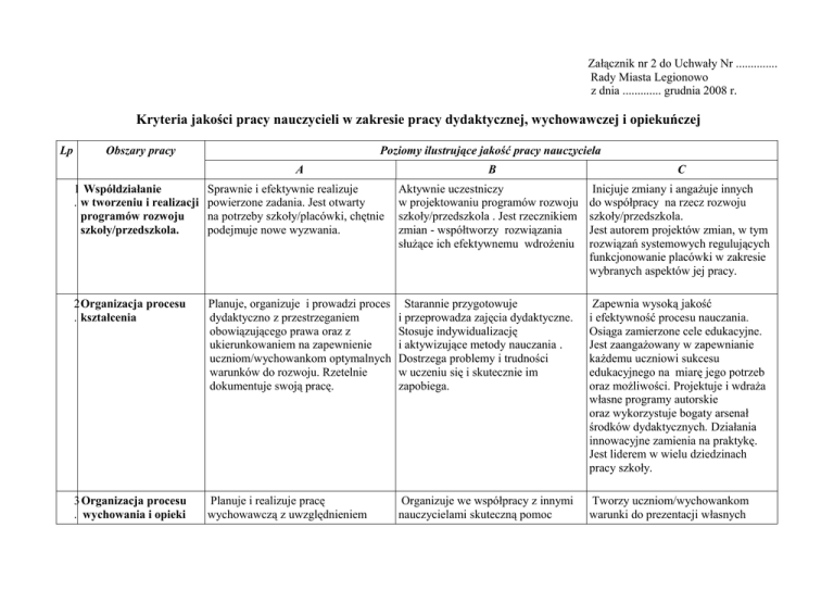 Załącznik nr 2 do Uchwały Nr .............. Rady Miasta Legionowo z dnia ............. grudnia 2008 r. Kryteria jakości pracy nauczycieli w zakresie pracy dydaktycznej, wychowawczej i opiekuńczej Lp Obszary pracy Poziomy ilustrujące jakość pracy nauczyciela A B C 1 Współdziałanie . w tworzeniu i realizacji programów rozwoju szkoły/przedszkola. Sprawnie i efektywnie realizuje powierzone zadania. Jest otwarty na potrzeby szkoły/placówki, chętnie podejmuje nowe wyzwania. Aktywnie uczestniczy w projektowaniu programów rozwoju szkoły/przedszkola . Jest rzecznikiem zmian - współtworzy rozwiązania służące ich efektywnemu wdrożeniu Inicjuje zmiany i angażuje innych do współpracy na rzecz rozwoju szkoły/przedszkola. Jest autorem projektów zmian, w tym rozwiązań systemowych regulujących funkcjonowanie placówki w zakresie wybranych aspektów jej pracy. 2 Organizacja procesu . kształcenia Planuje, organizuje i prowadzi proces dydaktyczno z przestrzeganiem obowiązującego prawa oraz z ukierunkowaniem na zapewnienie uczniom/wychowankom optymalnych warunków do rozwoju. Rzetelnie dokumentuje swoją pracę. Starannie przygotowuje i przeprowadza zajęcia dydaktyczne. Stosuje indywidualizację i aktywizujące metody nauczania . Dostrzega problemy i trudności w uczeniu się i skutecznie im zapobiega. Zapewnia wysoką jakość i efektywność procesu nauczania. Osiąga zamierzone cele edukacyjne. Jest zaangażowany w zapewnianie każdemu uczniowi sukcesu edukacyjnego na miarę jego potrzeb oraz możliwości. Projektuje i wdraża własne programy autorskie oraz wykorzystuje bogaty arsenał środków dydaktycznych. Działania innowacyjne zamienia na praktykę. Jest liderem w wielu dziedzinach pracy szkoły. 3 Organizacja procesu . wychowania i opieki Planuje i realizuje pracę wychowawczą z uwzględnieniem Organizuje we współpracy z innymi nauczycielami skuteczną pomoc Tworzy uczniom/wychowankom warunki do prezentacji własnych Lp Obszary pracy Poziomy ilustrujące jakość pracy nauczyciela A B C prawa, potrzeb szkoły/przedszkola oraz potrzeb wychowanków, których zaspokojenie warunkuje zwiększenie ich szans edukacyjnych. wychowankom oraz monitoruje jej rezultaty. Jest zaangażowany w służenie interesom wychowanków. Integruje społeczność uczniowską. Dostarcza wychowankom różnorodnych i bogatych doświadczeń sprzyjających kształtowaniu pożądanych postaw. Tworzy przyjazne i bezpieczne relacje. poglądów i opinii w sprawach ważnych dla ich rozwoju. Postawy i zachowania jego wychowanków świadczą iż zostały ukształtowane z troską o przestrzeganie wartości uniwersalnych, o których mowa w jak Jest autorytetem w wymiarze osobowym i zawodowym zarówno wśród uczniów i ich rodziców. 4 Rozwój zawodowy . Systematycznie, odpowiednio do potrzeb szkoły/przedszkola oraz potrzeb związanych z własną praktyką wzbogaca wiedzę i doświadczenie zawodowe. Obserwuje pracę innych i korzysta z ich doświadczenia. Wykorzystuje szkolenia do doskonalenia własnej praktyki. Uczestniczy w szkoleniach zewnętrznych oraz jest aktywnym uczestnikiem szkoleń wewnętrznych. Uzyskuje nowe kwalifikacje oraz stopnie awansu zawodowego. Dzieli się swoją wiedzą i doświadczeniem z innymi nauczycielami – upowszechnia swój dorobek zawodowy, umożliwia obserwację własnej pracy, organizuje i przeprowadza szkolenia dla nauczycieli. Poszerza swoją wiedzę zarówno przez osobistą refleksję jak i współdziałając z nauczycielami z innych szkół. 5 Rozwój zainteresowań . i uzdolnień uczniów oraz wspomaganie uczniów napotykających na trudności w nauce Rozpoznaje potrzeby i możliwości oraz zainteresowania i uzdolnienia uczniów/wychowanków. Organizuje i prowadzi zajęcia odpowiednie do zdiagnozowanych potrzeb. Uczniowie mają możliwość atrakcyjnego spędzenia czasu wolnego. Z wysoką trafnością odkrywa indywidualne talenty oraz zapewnia im efektywny proces rozwoju. Uczniom z trudnościami w nauce zapewnia skuteczną pomoc w nauce i usprawnianiu dysfunkcji. Oferta zajęć pozalekcyjnych jest atrakcyjna zarówno pod względem treści Uczniowie osiągają sukces edukacyjny na miarę swoich potrzeb, możliwości zainteresowań i uzdolnień. Nauczyciel stwarza im warunki do prezentacji wiedzy i umiejętności oraz zainteresowań. Promuje ich osiągnięcia. Lp Obszary pracy Poziomy ilustrujące jakość pracy nauczyciela A B C kształcenia jak i metod pracy z uczniem. 6 Osiągnięcia Osiągnięcia uczniów/wychowanków . uczniów/wychowanków świadczą o opanowaniu wiedzy i umiejętności ustalonych w podstawie programowej nauczanego przedmiotu. Osiągnięcia niektórych uczniów wykraczają poza podstawę programową nauczanego przez nauczyciela przedmiotu. Osiągnięcia wielu uczniów świadczą o trwałym zaangażowaniu i zainteresowaniu rozwojem wiedzy i umiejętności w zakresie nauczanego przez nauczyciela przedmiotu. 7 Współpraca . z rodzicami oraz środowiskiem lokalnym Systematycznie współpracuje z rodzicami uczniów/wychowanków przestrzegając postanowień statutu placówki w tym zakresie. Diagnozuje oczekiwania i potrzeby rodziców oraz ustala zakres i sposób ich realizacji. Rodzice współtworzą programy pracy wychowawczej i aktywnie włączają się do jego realizacji. Systematycznie badana jest opinia rodziców o jakości pracy, służąca jej doskonaleniu. 8 Troska o jakość pracy . własnej. Terminowo i rzetelnie wykonuje powierzone zadania przestrzegając obowiązującego prawa oraz postanowień statutu. szkoły/przedszkola. Jest krytycznym obserwatorem własnej pracy . Systematycznie monitoruje i ocenia realizację programów nauczania i osiągnięcia uczniów oraz podejmuje działania korygujące i doskonalące. Pozyskuje opinie o własnej pracy. Bada własne nauczanie i umiejętności potrzebne do niego. Ocenia swój dorobek i współpracuje z innymi w tym zakresie.