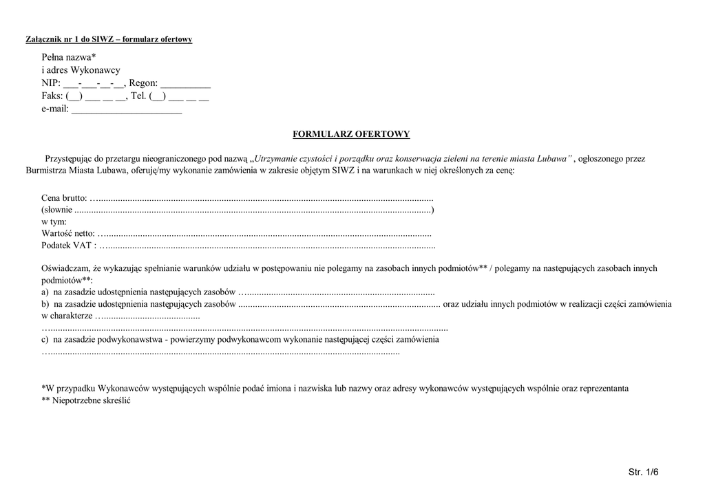 Załącznik nr 1 do SIWZ – formularz ofertowy Pełna nazwa* i adres Wykonawcy NIP: ___-___-__-__, Regon: __________ Faks: (__) ___ __ __, Tel. (__) ___ __ __ e-mail: ______________________ FORMULARZ OFERTOWY Przystępując do przetargu nieograniczonego pod nazwą „Utrzymanie czystości i porządku oraz konserwacja zieleni na terenie miasta Lubawa” , ogłoszonego przez Burmistrza Miasta Lubawa, oferuję/my wykonanie zamówienia w zakresie objętym SIWZ i na warunkach w niej określonych za cenę: Cena brutto: …........................................................................................................................................... (słownie ....................................................................................................................................................) w tym: Wartość netto: …....................................................................................................................................... Podatek VAT : …........................................................................................................................................ Oświadczam, że wykazując spełnianie warunków udziału w postępowaniu nie polegamy na zasobach innych podmiotów** / polegamy na następujących zasobach innych podmiotów**: a) na zasadzie udostępnienia następujących zasobów ….............................................................................. b) na zasadzie udostępnienia następujących zasobów .................................................................................... oraz udziału innych podmiotów w realizacji części zamówienia w charakterze …........................................ …..................................................................................................................................................................... c) na zasadzie podwykonawstwa - powierzymy podwykonawcom wykonanie następującej części zamówienia …................................................................................................................................................. *W przypadku Wykonawców występujących wspólnie podać imiona i nazwiska lub nazwy oraz adresy wykonawców występujących wspólnie oraz reprezentanta ** Niepotrzebne skreślić Str. 1/6 Lp. Rodzaj czynności Przewidywana Jedn. ilość prac w ciągu trwania umowy 1 Oczyszczanie jezdni (dróg) oraz parkingów – usługa polega na mechanicznym oczyszczaniu jezdni z błota, piasku oraz innych zanieczyszczeń zamiatarką na całej jej szerokości, ze szczególnym uwzględnieniem terenu przy krawężnikach oraz terenu wokół kratki wpustu ulicznego. Usługa obejmuje również ręczne doczyszczanie odcinków, gdzie oczyszczanie 1. mechaniczne nie było możliwe oraz usuwanie zanieczyszczeń typu: butelki, puszki, papiery, folie, kartony, liście, wyłamane przez wiatr gałęzie itp. łącznie z usuwaniem chwastów z krawężników oraz powierzchni jezdni i parkingu, wraz z wywozem zebranych odpadów do miejsca ich unieszkodliwiania. km 600 Oczyszczanie chodników oraz parkingów – usługa polega na oczyszczaniu chodników i parkingów z zalegających zanieczyszczeń (błota, piasku itp.) przy użyciu zamiatarek mechanicznych. Przy oczyszczaniu mechanicznym należy uwzględnić doczyszczanie ręczne 2. odcinków, gdzie oczyszczanie mechaniczne było niemożliwe oraz usuwanie zanieczyszczeń typu: butelki, puszki, papiery, folie, kartony, liście, wyłamane przez wiatr gałęzie itp. łącznie z usuwaniem chwastów z obrzeży krawężników oraz z powierzchni chodników i parkingów włącznie z przystankami. m2 606 732 Cena jednostkowa netto Podatek VAT Cena jednostkowa brutto Wartość brutto 2 3 4=2+3 5=4x1 Str. 2/6 Opróżnianie koszy ulicznych, usługa obejmuje: opróżnianie wszystkich koszy ulicznych na terenie miasta Lubawa z częstotliwością cztery razy w tygodniu – wtorek, czwartek, sobota, niedziela oczyszczanie terenu wokół koszy w trakcie ich opróżniania w promieniu 2 m, łącznie z zamieceniem lub wygrabieniem, ustawianie przewróconych lub przestawionych koszy, informowanie Zamawiającego o zniszczeniu lub kradzieży koszy. Zakładanie flag państwowych na budynki oraz słupy oświetleniowe na czas świąt lokalnych i państwowych – koszt zakupu flag ponosi Zamawiający. 3. miesiąc (ryczałt) Usuwanie padłych zwierząt z terenu objętego zamówieniem oraz transport i przekazanie do utylizacji zgodnie z przepisami sanitarnymi do podmiotu posiadającego stosowne zezwolenie. 24 Bieżące utrzymywanie porządku na terenie Cmentarza Armii Radzieckiej oraz Miejsc Pamięci. Bieżące oczyszczanie słupów ogłoszeniowych: zerwanie wszystkich ogłoszeń, wyczyszczenie powierzchni słupa z kleju. Bieżące oczyszczanie wiat przystankowych oraz ławek z wszelkich zanieczyszczeń: plakatów, ulotek, naklejek. Umycie pod ciśnieniem czyszczącym środkiem chemicznym - w miarę potrzeb. 4. Chemiczne usuwanie plam olejowych z chodników, parkingów z kostki brukowej i betonowej. r-g 20 Usuwanie nielegalnych skupisk odpadów włącznie z odpadami wielkogabarytowymi, w tym koszt utylizacji. godz. pracy 15 6. Inne niż wymienione powyżej praca związana z oczyszczaniem miasta i utrzymaniem zieleni r-g 50 7. Inne niż wymienione powyżej praca związana z oczyszczaniem miasta i utrzymaniem zieleni m-g 50 5. Str. 3/6 Koszenie trawników – wysokość koszenia ustala się na 5 – 7 cm; skoszoną trawę należy wygrabić, zebrać w pryzmy, i wywozić do miejsca utylizacji na bieżąco; nie dopuszcza się zalegania skoszonej lub spryzmowanej trawy w miejscu objętym przedmiotem zamówienia musi być ona zebrana i wywieziona najpóźniej do godz. 11 dnia następnego po koszeniu. Koszenie trawników obejmuje także usuwanie samosiewów, odrostów korzeniowych i pniowych z drzew rosnących na utrzymywanych trawnikach, chwastów wokół drzew, krzewów, lamp, znaków drogowych, barie