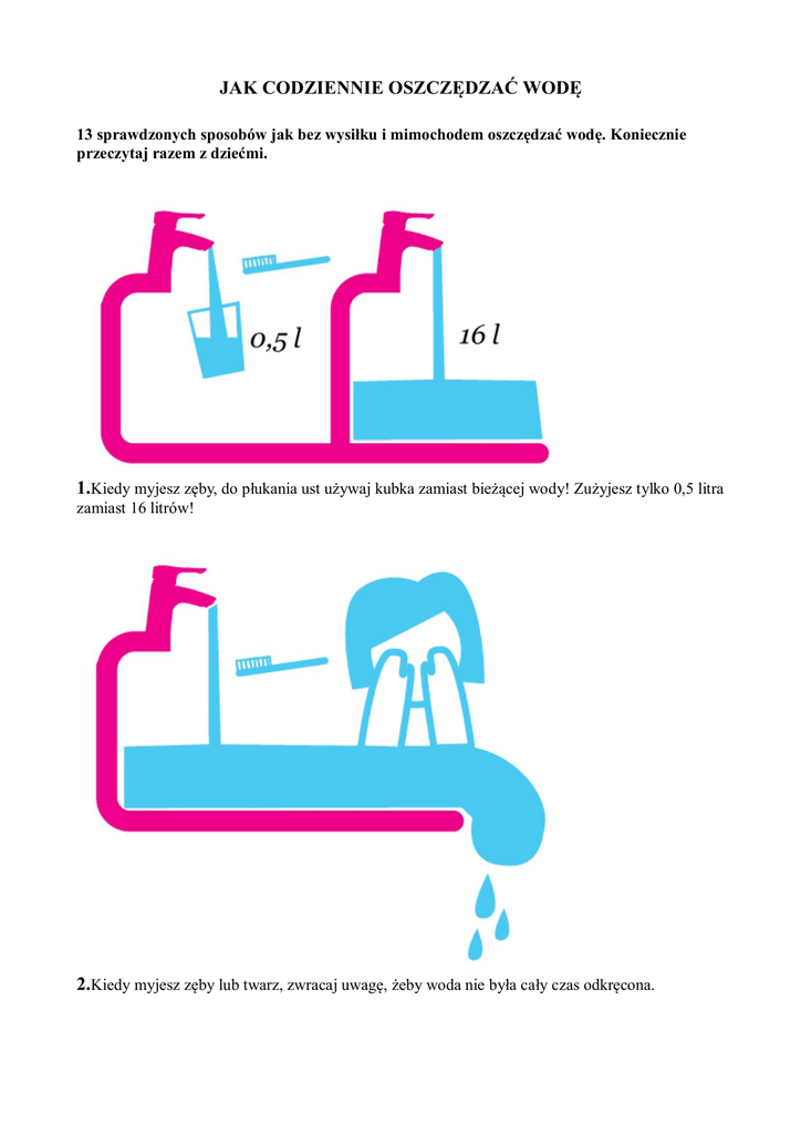 JAK CODZIENNIE OSZCZĘDZAĆ WODĘ 13 sprawdzonych sposobów jak bez wysiłku i mimochodem oszczędzać wodę. Koniecznie przeczytaj razem z dziećmi. 1.Kiedy myjesz zęby, do płukania ust używaj kubka zamiast bieżącej wody! Zużyjesz tylko 0,5 litra zamiast 16 litrów! 2.Kiedy myjesz zęby lub twarz, zwracaj uwagę, żeby woda nie była cały czas odkręcona. 3. Kiedy myjesz ręce, strumień wody nie musi wypływać z maksymalną siłą. 4. Bierz szybki prysznic zamiast kąpać się w wannie! Pełna wanna to około 180 litrów wody, podczas gdy jedna minuta kąpieli pod prysznicem to około 10 litrów wody. 5. Jeżeli kąpiesz się w wannie, nie nalewaj wody do pełna. Napełniaj wannę w 1/3 pojemności. Pamiętaj, żeby najpierw zatkać odpływ korkiem. To nic, że przez pierwsze kilka sekund leci zimna woda: ogrzeje się, gdy dodasz gorącej. 6. Pamiętaj, że nie musisz za każdym razem spuszczać całej wody ze spłuczki w toalecie. Zazwyczaj spłuczka ma dwa przyciski mniejszy i większy. Zawsze najpierw użyj mniejszego. 7. Unikaj zbędnego spłukiwania toalety. Chusteczki itp. wrzucaj do kosza, nie do toalety. Do rodziców 8. Napraw kapiące krany. Jeżeli kran kapie z częstotliwością „kropla na sekundę‟, to rocznie może wykapać 11935 litrów wody! 9. Zmień wszystkie krany na takie, które będą oszczędzać wodę. Wystarczy zainstalować perlatory, czyli siatki o drobnych oczkach, które napowietrzają wypływającą wodę. Dzięki temu strumień będzie silniejszy. 10. Używaj jednouchwytowych baterii – dzięki nim szybciej uregulujesz temperaturę i zmarnujesz mniej wody niż kręcąc dwoma kurkami. 11. Używaj zmywarki i pralki tylko wtedy, kiedy są już pełne. 12. Nie myj naczyń pod bieżącą wodą. Kiedy zmywasz ręcznie, napełnij jedną komorę zlewu (lub miskę) wodą z płynem. Spłukuj szybko pod niewielkim strumieniem bieżącej wody. 13. Nie wylewaj wody, jeśli możesz jej użyć np. do podlewania kwiatów, czy do sprzątania.
