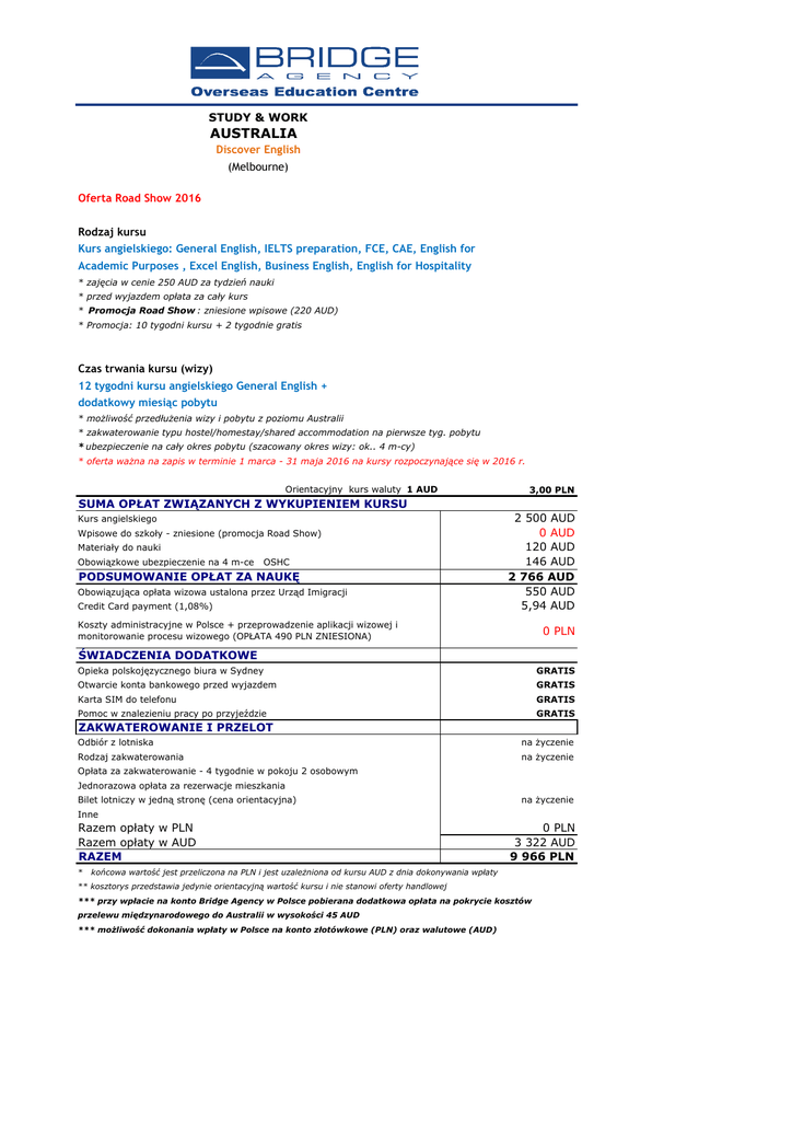 STUDY & WORK AUSTRALIA Discover English (Melbourne) Oferta Road Show 2016 Rodzaj kursu Kurs angielskiego: General English, IELTS preparation, FCE, CAE, English for Academic Purposes , Excel English, Business English, English for Hospitality * zajęcia w cenie 250 AUD za tydzień nauki * przed wyjazdem opłata za cały kurs * Promocja Road Show : zniesione wpisowe (220 AUD) * Promocja: 10 tygodni kursu + 2 tygodnie gratis Czas trwania kursu (wizy) 12 tygodni kursu angielskiego General English + dodatkowy miesiąc pobytu * możliwość przedłużenia wizy i pobytu z poziomu Australii * zakwaterowanie typu hostel/homestay/shared accommodation na pierwsze tyg. pobytu * ubezpieczenie na cały okres pobytu (szacowany okres wizy: ok.. 4 m-cy) * oferta ważna na zapis w terminie 1 marca - 31 maja 2016 na kursy rozpoczynające się w 2016 r. Orientacyjny kurs waluty 1 AUD 3,00 PLN SUMA OPŁAT ZWIĄZANYCH Z WYKUPIENIEM KURSU Kurs angielskiego Wpisowe do szkoły - zniesione (promocja Road Show) Materiały do nauki Obowiązkowe ubezpieczenie na 4 m-ce OSHC PODSUMOWANIE OPŁAT ZA NAUKĘ Obowiązująca opłata wizowa ustalona przez Urząd Imigracji Credit Card payment (1,08%) 2 500 AUD 0 AUD 120 AUD 146 AUD 2 766 AUD 550 AUD 5,94 AUD Koszty administracyjne w Polsce + przeprowadzenie aplikacji wizowej i monitorowanie procesu wizowego (OPŁATA 490 PLN ZNIESIONA) 0 PLN ŚWIADCZENIA DODATKOWE Opieka polskojęzycznego biura w Sydney GRATIS Otwarcie konta bankowego przed wyjazdem GRATIS Karta SIM do telefonu GRATIS Pomoc w znalezieniu pracy po przyjeździe GRATIS ZAKWATEROWANIE I PRZELOT Odbiór z lotniska na życzenie Rodzaj zakwaterowania na życzenie Opłata za zakwaterowanie - 4 tygodnie w pokoju 2 osobowym Jednorazowa opłata za rezerwacje mieszkania Bilet lotniczy w jedną stronę (cena orientacyjna) na życzenie Inne Razem opłaty w PLN Razem opłaty w AUD RAZEM * 0 PLN 3 322 AUD 9 966 PLN końcowa wartość jest przeliczona na PLN i jest uzależniona od kursu AUD z dnia dokonywania wpłaty ** kosztorys przedstawia jedynie orientacyjną wartość kursu i nie stanowi oferty handlowej *** przy wpłacie na konto Bridge Agency w Polsce pobierana dodatkowa opłata na pokrycie kosztów przelewu międzynarodowego do Australii w wysokości 45 AUD *** możliwość dokonania wpłaty w Polsce na konto złotówkowe (PLN) oraz walutowe (AUD)