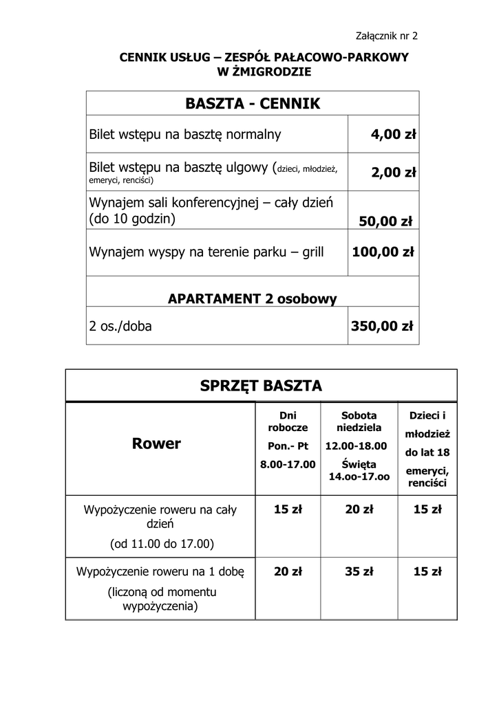 Załącznik nr 2 CENNIK USŁUG – ZESPÓŁ PAŁACOWO-PARKOWY W ŻMIGRODZIE BASZTA - CENNIK Bilet wstępu na basztę normalny 4,00 zł Bilet wstępu na basztę ulgowy (dzieci, młodzież, 2,00 zł emeryci, renciści) Wynajem sali konferencyjnej – cały dzień (do 10 godzin) 50,00 zł Wynajem wyspy na terenie parku – grill 100,00 zł APARTAMENT 2 osobowy 2 os./doba 350,00 zł propozycja SPRZĘT BASZTA Dni robocze Rower Wypożyczenie roweru na cały dzień Pon.- Pt Sobota niedziela 12.00-18.00 Dzieci i młodzież do lat 18 8.00-17.00 Święta 14.oo-17.oo 15 zł 20 zł 15 zł 20 zł 35 zł 15 zł emeryci, renciści (od 11.00 do 17.00) Wypożyczenie roweru na 1 dobę (liczoną od momentu wypożyczenia) Dni robocze Pon.- Pt 11.00-17.00 Lornetka i Luneta Sobota niedziela 13.00-18.00 Święta 14.oo-17.oo Wypożyczenie lornetki lub lunety na cały dzień Dzieci i młodzież do lat 18 emeryci, renciści 6 zł 8 zł 5 zł 10 zł 12 zł 8 zł (od 11.00 do 17.00) Wypożyczenie lornetki lub lunety na 1 dobę (liczoną od momentu wypożyczenia) sesja foto - pałac, park do 2 godz. 50 zł sesja foto - baszta wnętrza - 1 godz. 30 zł Rezerwacja sprzętu z baszty pod nr telefonu 71-385-39-31