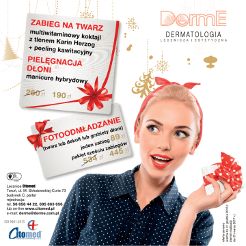 ZABIEG NA TWAR Z multiwitamin owy koktajl z tlenem Ka rin Herzog + peeling ka witacyjny PIELĘGNAC JA DŁONI manicure hy brydowy 260 zł 190 z ł ANIEi) Z D MŁA rzbiety dłon D O g O 9 zł FOT ekolt lub ieg 8 bd b ów n za bieg jede a z ciu zł 5 sześ 4 t 4 e i k pa Lecznice Citomed Toruń, ul. M. Skłodowskiej-Curie 73 budynek C, parter rejestracja: tel. 56 658 44 22, 695 663 656 lub on-line www.citomed.pl e-mail: [email protected] ISO 9001:2015 534 zł oferta cenowa ważna do 31 grudnia 2016 r. (termin realizacji do 31 marca 2017 r.) rz lu (twa RELAKS I KOMPLEKSOWA PIELĘGNACJA MULTIWITAMINOWY KOKTAJL + PEELING KAWITACYJNY + MANICURE HYBRYDOWY ZABIEG ŁĄCZY W SOBIE PIELĘGNACJĘ TWARZY, PRZY UŻYCIU WYSOKIEJ KLASY SZWAJCARSKICH KOSMETYKÓW MARKI KARIN HERZOG, ORAZ DŁONI, NA AMERYKAŃSKICH KOSMETYKACH MARKI O.P.I. Jeżeli: • jesteś w ciągłym biegu, • narzekasz na brak czasu, • chcesz aby podczas jednej wizyty zadbano o Ciebie kompleksowo, • oczekujesz efektu natychmiastowego Cena: 199zł MULTIWITAMINOWY KOKTAJL Z TLENEM Zabieg przeznaczony do każdego typu cery. Witaminowy koktajl dla cery ZMĘCZONEJ, WYMAGAJĄCEJ UKOJENIA i ROZŚWIETLENIA. • masaż relaksacyjny wykonany na specjalnym olejku z wyciągiem z moreli działa relaksująco i odżywczo • maska z 2% tlenem i olejkami cytrusowymi działa bakteriobójczo i przeciwzapalnie, nawilża i dotlenia skórę Ten zabieg jest dla Ciebie! FOTOODMŁADZANIE ZABIEG POLEGA NA ODDZIAŁYWANIU NA SKÓRĘ WIĄZKĄ ŚWIATŁA. URZĄDZENIE IPL CZYLI INTENSYWNE PULSUJĄCE ŚWIATŁO EMITUJE W TYM SAMYM MOMENCIE RÓŻNEJ DŁUGOŚCI FALE WE WSZYSTKICH KIERUNKACH. DZIĘKI TEMU MOŻNA LIKWIDOWAĆ WIELE EFEKTÓW FOTOSTARZENIA. Jeśli chcesz usunąć: Cena: • drobne zmarszczki jednego zabiegu 89zł • przebarwienia posłoneczne pakiet sześciu zabiegów 445 zł •piegi • rozszerzone naczynka • rumień twarzy • rozszerzone pory • inne efekty fotouszkodzeń skóry
