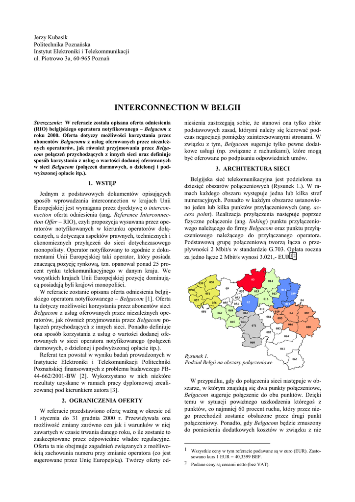 Jerzy Kubasik Politechnika Poznańska Instytut Elektroniki i Telekommunikacji ul. Piotrowo 3a, 60-965 Poznań INTERCONNECTION W BELGII Streszczenie: W referacie została opisana oferta odniesienia (RIO) belgijskiego operatora notyfikowanego – Belgacom z roku 2000. Oferta dotyczy możliwości korzystania przez abonentów Belgacomu z usług oferowanych przez niezależnych operatorów, jak również przyjmowania przez Belgacom połączeń przychodzących z innych sieci oraz definiuje sposób korzystania z usług o wartości dodanej oferowanych w sieci Belgacom (połączeń darmowych, o dzielonej i podwyższonej opłacie itp.). 1. WSTĘP Jednym z podstawowych dokumentów opisujących sposób wprowadzania interconnection w krajach Unii Europejskiej jest wymagana przez dyrektywę o interconnection oferta odniesienia (ang. Reference Interconnection Offer – RIO), czyli propozycja wysuwana przez operatorów notyfikowanych w kierunku operatorów dołączanych, a dotycząca aspektów prawnych, technicznych i ekonomicznych przyłączeń do sieci dotychczasowego monopolisty. Operator notyfikowany to zgodnie z dokumentami Unii Europejskiej taki operator, który posiada znaczącą pozycję rynkową, tzn. opanował ponad 25 procent rynku telekomunikacyjnego w danym kraju. We wszystkich krajach Unii Europejskiej pozycję dominującą posiadają byli krajowi monopoliści. W referacie zostanie opisana oferta odniesienia belgijskiego operatora notyfikowanego – Belgacom [1]. Oferta ta dotyczy możliwości korzystania przez abonentów sieci Belgacom z usług oferowanych przez niezależnych operatorów, jak również przyjmowania przez Belgacom połączeń przychodzących z innych sieci. Ponadto definiuje ona sposób korzystania z usług o wartości dodanej oferowanych w sieci operatora notyfikowanego (połączeń darmowych, o dzielonej i podwyższonej opłacie itp.). Referat ten powstał w wyniku badań prowadzonych w Instytucie Elektroniki i Telekomunikacji Politechniki Poznańskiej finansowanych z problemu badawczego PB44-662/2001-BW [2]. Wykorzystano w nich niektóre rezultaty uzyskane w ramach pracy dyplomowej zrealizowanej pod kierunkiem autora [3]. 2. OGRANICZENIA OFERTY W referacie przedstawiono ofertę ważną w okresie od 1 stycznia do 31 grudnia 2000 r. Przewidywała ona możliwość zmiany zarówno cen jak i warunków w niej zawartych w czasie trwania danego roku, o ile zostanie to zaakceptowane przez odpowiednie władze regulacyjne. Oferta ta nie obejmuje zagadnień związanych z możliwością zachowania numeru przy zmianie operatora (co jest sugerowane przez Unię Europejską). Twórcy oferty od- niesienia zastrzegają sobie, że stanowi ona tylko zbiór podstawowych zasad, którymi należy się kierować podczas negocjacji pomiędzy zainteresowanymi stronami. W związku z tym, Belgacom sugeruje tylko pewne dodatkowe usługi (np. związane z rachunkami), które mogą być oferowane po podpisaniu odpowiednich umów. 3. ARCHITEKTURA SIECI Belgijska sieć telekomunikacyjna jest podzielona na dziesięć obszarów połączeniowych (Rysunek 1.). W ramach każdego obszaru występuje jedna lub kilka stref numeracyjnych. Ponadto w każdym obszarze ustanowiono jeden lub kilka punktów przyłączeniowych (ang. access point). Realizacja przyłączenia następuje poprzez fizyczne połączenie (ang. linking) punktu przyłączeniowego należącego do firmy Belgacom oraz punktu przyłączeniowego należącego do przyłączanego operatora. Podstawową grupę połączeniową tworzą łącza o przepływności 2 Mbit/s w standardzie G.703. Opłata roczna za jedno łącze 2 Mbit/s wynosi 3.021,- EUR1,2. 03 050 059 09 058 053 057 056 056 055 069 068 013 04 012 010 019 067 081 065 089 016 02 054 011 015 052 051 014 04 064 086 071 087 085 083 080 082 084 060 061 Rysunek 1. Podział Belgii na obszary połączeniowe 063 W przypadku, gdy do połączenia sieci następuje w obszarze, w którym znajdują się dwa punkty połączeniowe, Belgacom sugeruje połączenie do obu punktów. Dzięki temu w sytuacji poważnego uszkodzenia któregoś z punktów, co najmniej 60 procent ruchu, który przez niego przechodził zostanie obsłużone przez drugi punkt połączeniowy. Ponadto, gdy Belgacom będzie zmuszony do poniesienia dodatkowych kosztów w związku z nie 1 Wszystkie ceny w tym referacie podawane są w euro (EUR). Zastosowano kurs 1 EUR = 40,3399 BEF. 2 Podane ceny są cenami netto (bez VAT). przyłączeniem się operatora do obydwu punktów, a wynikających z konieczności zapewnienia odpowiedniej jakości usług (ang. quality of service), będzie on domagać się zwrotu tych kosztów. 4. POŁĄCZENIA DO STREF NUMERACYJNYCH Operatorzy niezależni mają dostęp do abonentów sieci Belgacom poprzez punkty przyłączeniowe. Dotyczy to zarówno rozmów inicjowanych w sieci Belgacom i kierowanych do sieci operatora niezależnego jak i połączeń realizowanych w odwrotnym kierunku. Adresat połączenia realizowanego z sieci niezależnej do sieci Belgacom może znajdować się w innym obszarze przyłączeniowym niż ten, w którym znajduje się punkt przyłączeniowy, w którym nastąpiło przejęcie połączenia przez Belgacom. Mówimy w takim przypadku o połączeniu zewnętrznym. W sytuacji, gdy zarówno inicjator jak i adresat połączenia znajdują się w obrębie jednego obszaru przyłączeniowego mówimy o połączeniu wewnętrznym. Rozróżnienie to ma istotne znaczenie, gdyż w zależności od typu połączenia (zewnętrzne, wewnętrzne) występują różne opłaty. Zostało to pokazane w Tabeli 1. Tabela 1. Wysokość opłat przyłączeniowych za połączenia do stref numeracyjnych sieci Belgacom3. Typ połączenia wewnętrzne zewnętrzne za zestawienie połączenia poza szczyt szczytem 0,0061 0,0036 0,0079 0,0047 za minutę rozmowy poza szczyt szczytem 0,0128 0,0077 0,0165 0,0099 Opłata za połączenia jest dwuczęściowa: opłata za zestawienie połączenia (ang. set-up charge) jest kwotą stałą pobieraną z
