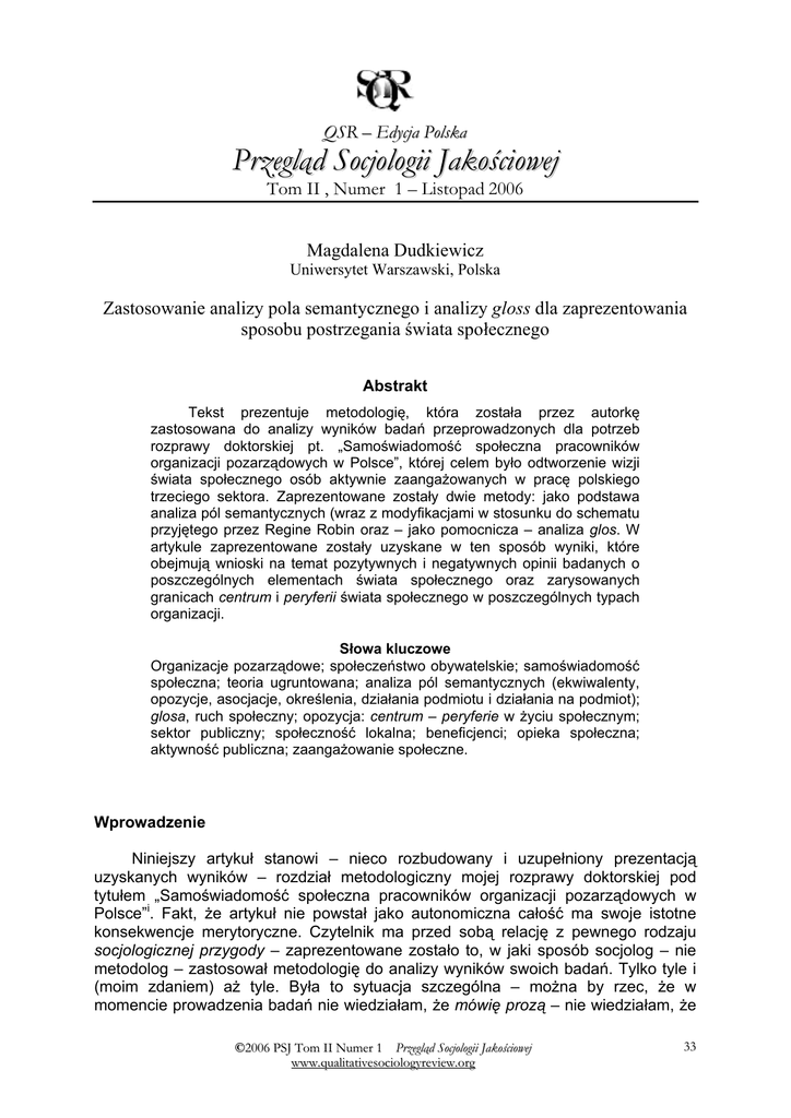 QSR – Edycja Polska Przegląd Socjologii Jakościowej Tom II , Numer 1 – Listopad 2006 Magdalena Dudkiewicz Uniwersytet Warszawski, Polska Zastosowanie analizy pola semantycznego i analizy gloss dla zaprezentowania sposobu postrzegania świata społecznego Abstrakt Tekst prezentuje metodologię, która została przez autorkę zastosowana do analizy wyników badań przeprowadzonych dla potrzeb rozprawy doktorskiej pt. „Samoświadomość społeczna pracowników organizacji pozarządowych w Polsce”, której celem było odtworzenie wizji świata społecznego osób aktywnie zaangażowanych w pracę polskiego trzeciego sektora. Zaprezentowane zostały dwie metody: jako podstawa analiza pól semantycznych (wraz z modyfikacjami w stosunku do schematu przyjętego przez Regine Robin oraz – jako pomocnicza – analiza glos. W artykule zaprezentowane zostały uzyskane w ten sposób wyniki, które obejmują wnioski na temat pozytywnych i negatywnych opinii badanych o poszczególnych elementach świata społecznego oraz zarysowanych granicach centrum i peryferii świata społecznego w poszczególnych typach organizacji. Słowa kluczowe Organizacje pozarządowe; społeczeństwo obywatelskie; samoświadomość społeczna; teoria ugruntowana; analiza pól semantycznych (ekwiwalenty, opozycje, asocjacje, określenia, działania podmiotu i działania na podmiot); glosa, ruch społeczny; opozycja: centrum – peryferie w życiu społecznym; sektor publiczny; społeczność lokalna; beneficjenci; opieka społeczna; aktywność publiczna; zaangażowanie społeczne. Wprowadzenie Niniejszy artykuł stanowi – nieco rozbudowany i uzupełniony prezentacją uzyskanych wyników – rozdział metodologiczny mojej rozprawy doktorskiej pod tytułem „Samoświadomość społeczna pracowników organizacji pozarządowych w Polsce”i. Fakt, że artykuł nie powstał jako autonomiczna całość ma swoje istotne konsekwencje merytoryczne. Czytelnik ma przed sobą relację z pewnego rodzaju socjologicznej przygody – zaprezentowane zostało to, w jaki sposób socjolog – nie metodolog – zastosował metodologię do analizy wyników swoich badań. Tylko tyle i (moim zdaniem) aż tyle. Była to sytuacja szczególna – można by rzec, że w momencie prowadzenia badań nie wiedziałam, że mówię prozą – nie wiedziałam, że ©2006 PSJ Tom II Numer 1 Przegląd Socjologii Jakościowej www.qualitativesociologyreview.org 33 spełniam, być może podstawowy, postulat teorii ugruntowanej, tzn. że uzyskawszy bardzo obszerny materiał empiryczny dostosowuję do niego metody analizy. Konsekwencją takiego stanu rzeczy jest pewna – jak ujął to jeden z Recenzentów mojego tekstu – niespójność teoretyczna: stwierdził on, że „nie bardzo wiadomo, co łączy” zastosowane przez mnie metody. Zasadne wydaje mi się zatem postawienie w tym miejscu kropki nad „i”: łączy je cel dla którego zostały użyte – mój doktorat nie stanowi rozprawy o metodzie, metodologia została w nim potraktowana usługowo – celem było odtworzenie samoświadomości personelu polskich organizacji pozarządowych. Z tego samego powodu niniejszy artykuł nie może spełnić wspólnego postulatu zgłaszanego przez obu Recenzentów: za bezcelowe uważam przywoływanie w nim nowszej literatury na temat zastosowanych przez mnie technik. Analizując wyniki swoich badań nie znałam wszak innej literatury, więc w prezentowanym tekście odniesienia te nie miałyby racji bytu. Za drugi argument niech posłuży w tym miejscu fakt, metodologia nie jest moją specjalnością, ani podstawowym kierunkiem zainteresowań – zajmuję się kwestią społeczeństwa obywatelskiego, a węziej – tzw. trzeciego sektora. Podsumowując: prezentowany tekst nie jest przeglądem metod i technik przydatnych do analizy materiału badawczego. Jest jedynie (?) relacją socjologa z jego socjologicznego doświadczenia, z tego, jak uzyskawszy konkretny bogaty materiał empiryczny, w konkretnym momencie zastosował do niego konkretne metody analizy. I co z tego wynikło. W swojej rozprawie doktorskiej podjęłam próbę odtworzenia wizji świata społecznego osób aktywnie zaangażowanych w pracę polskiego trzeciego sektora Do badań przystępowałam z dwoma podstawowymi założeniami: − po pierwsze, przedmiotem mojego zainteresowania byli ludzie, a nie organizacje traktowane jako sieci relacji formalnych lub jako struktury społeczne; − po drugie, interesowały mnie poglądy osób faktycznie działających, a nie tych, którzy głównie tworzą pozarządową ideologię i wytyczają drogi rozwoju trzeciego sektora. Z tego powodu w organizacjach badałam personel średniego szczebla. Moim celem była zatem analiza codziennego, potocznego obrazu świata społecznego, a nie jego wizji głoszonej przez ideologów czy liderów trzeciego sektora. Istotnym utrudnieniem, z którym musiałam sobie poradzić przystępując do badań, było moje wieloletnie zaangażowanie w działania polskiego trzeciego sektora – musiałam dołożyć szczególnych starań, by spełnić, Weberowski w swej istocie, postulat uwolnienia się od wartości, a więc zapomnieć o tym, co przed przystąpieniem do badań sądziłam o tym środowisku. Jak pisze Zdzisław Krasnodębski (2002: 304), referując poglądy Maxa Webera: „Naukowiec nie tylko dlatego powinien unikać ocen i wartościowań, iż oceny nie wynikają z faktów, lecz także dlatego, że oceny w ogóle nie są racjonalnie uzasadnialne, ostatecznie są kwestią osobistego wyboru”. Doskonale zdawałam sobie sprawę z komplikacji, która może wynikać z takiego „współanimowania badanych zjawisk lub procesów społecznych” i „dwoistości roli społecznej”, jak pisze o takiej sytuacji Anna Wyka (1999: 77-78), czyli bycia jednocześnie uczestnikiem i badaczem zjawiska społecznego. Obawiałam się, że sytuacja, w jakiej się znalazłam, może mnie skłaniać do z góry pozytywnej i nazbyt zaangażowanej int