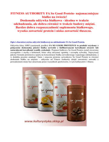 FITNESS AUTHORITY FA So Good Protein- najsmaczniejsze białko na świecie! Doskonała odżywka białkowa - idealna w trakcie odchudzania, ale dobra również w trakcie budowy mięśni. Bardzo dobra rozpuszczalność suplementu białkowego, wysoka zawartość protein i niska zawartość tłuszczu. Opis i charakterystyka odżywki białkowej na odchudzanie FA So Good Protein. Odżywka klasy MRP (zamiennik posiłku) FA SO GOOD PROTEIN!® to produkt uzyskany z połączenia doskonałej jakości białka serwatki z liofilizowanymi kawałkami owoców lub naturalnymi kawałkami wanilii, czekolady. Preparat białkowy So Good Protein został stworzony szczególnie z myślą o kobietach, które chcą utrzymać zgrabną i szczupłą sylwetkę. Najwyższej jakości formuła proteinowa oparta na koncentracie białka serwatkowego wspomaga odchudzanie, a w dodatku pysznie smakuje! Tanie i smaczne proteiny serwatkowe So Good Protein to również doskonałe białko na mięśnie - odżywka od Fitness Authority dzięki zawartości serwatki z powodzeniem może być stosowana przez wszystkich sportowców, w tym kulturystów i fitness. FA So Good Protein to 100% najwyższej klasy protein serwatkowych Białko serwatki posiada najwyższą wartość odżywczą i aktywność biologiczną spośród wszystkich białek pokarmowych dostępnych na rynku. Charakteryzuje się łatwością trawienia i bardzo dobrym zestawem aminokwasów, dzięki czemu jego wartość odżywcza jest tak wysoka. Ze względu na fakt iż białka przyczyniają się do wzrostu masy mięśniowej i pomagają w jej utrzymaniu oraz pomagają w utrzymaniu zdrowych kości spożywanie produktów dostarczających białka zapewnia prawidłowy przebieg wielu procesów metabolicznych, szczególnie przy ćwiczeniach fizycznych oraz w okresach zwiększonego zapotrzebowania na spożycie białka podczas odchudzania. • • • • • Największe zalety SO GOOD! PROTEIN to: doskonale uzupełnia braki białka w organizmie, aż 26g białka w porcji, doskonały smak wzbogacony owocami, nie zawiera aspartamu, wspomaga regenerację powysiłkową. Liofiliozowane owoce gwarancją pysznego smaku i wysokiej wartości odżywczej preparatu FA So Good Protein! Liofilizowane owoce dostarczają w skondensowanej formie naturalne witaminy i minerały oraz zestaw antyoksydantów niezbędnych człowiekowi dla zachowania zdrowia. Witaminy i minerały w odpowiednich dawkach są potrzebne dla utrzymania zdrowia oraz wzmocnienia funkcji układu odpornościowego. Antyoksydanty to substancje, które pomagają redukować wolne rodniki, łącząc się z mini, usuwają je z organizmu lub neutralizują ich niekorzystne działanie na organizm. Liofilizacja to specjalny proces technologiczny polegający na suszeniu żywności nieodpornej na działanie wysokich temperatur w obniżonej temperaturze i pod zmniejszonym ciśnieniem. Liofilizacja jest jedną z najlepszych metod utrwalania żywności, zabezpiecza się w ten sposób skutecznie produkty przed zepsuciem a dodatkowo zachowuje ich wartość odżywczą. Podczas tego procesu nie dochodzi do istotnych strat witamin, składników mineralnych, białek, węglowodanów i tłuszczów, substancji biologicznie czynnych takich jak polifenole oraz nie ulegają zmienia cechy organoleptyczne czyli smak, aromat, barwa. Specjalne połączenie białek serwatki z liofilizowanymi kawałkami owoców czy kawałkami czekolady, wanilii to nowoczesna formuła odżywczego i pełnowartościowego posiłku wysokobiałkowego. To smaczny, naturalny i zdrowy koktajl białkowy dla każdego człowieka dbającego o swoje zdrowie. Ta nowatorska formuła może stanowić zastępstwo posiłku gdyż zawiera odpowiednią ilość białka oraz zbilansowany zestaw składników odżywczych. Dawkowanie oraz sposób użycia proteiny serwatkowej dla sportowców So Good Protein: Zalecany sposób spożycia: Wymieszać 2 miarki proszku (40 g) z 250 ml wody lub mleka. Pić porcję produktu przed i po treningu lub jako przekąskę miedzy posiłkami. Opis i charakterystyka FA So Good Protein: • 1 porcja = 40gram protein serwatkowych • Ilość porcji w opakowaniu: 23 • Zawartość opakowania: 908 gram odżywki wysokobiałkowej Skład produktu So Good Protein: Zawartość: w 100 g w jednej porcji (40g) Wartość energetyczna 1624 kJ / 385 kcal2,3,4,5, 1568 kJ / 650 kJ / 154 kcal2,3,4,5, 627 kJ / 393 kcal1 132 kcal1 Białko 70 g2,3,4,5, 65 g1 28 g2,3,4,5, 26 g1 Węglowodany 7 g2,3,4,5, 14 g1 2,8 g2,3,4,5, 5, 6 g1 - w tym cukry 2,5 g2,3,4,5, 4 g1 1 g2,3,4,5, 1,6 g1 Tłuszcz 8,5 g 3,4 g - w tym kwasy tłuszczowe 5g 2g nasycone Błonnik 1g 0,4 g Sód 0,4 g 0,1 g 1 Czekolada, 2 Wanilia, 3 Pina Colada, 4 Truskawka, 5 Biała czekolada Składniki: Kompleks białek z mleka [koncentrat białka serwatkowego (Carbelac®), izolat białka serwatkowego (Isolac®), hydrolizat białka serwatkowego (Optipep™), zhydrolizowana kazeina (PeptoPro®)], kakao1, aromaty, kawałki owoców(2-2,8%)2,3,4,5, substancja zagęszczająca (guma ksantanowa), kawałki czekolady 2%1, sól1, regulator kwasowości (kwas cytrynowy)4, barwnik (sproszkowany korzeń buraka)4,5, substancja słodząca (sukraloza), barwnik (karoten). www.kulturystyka.sklep.pl