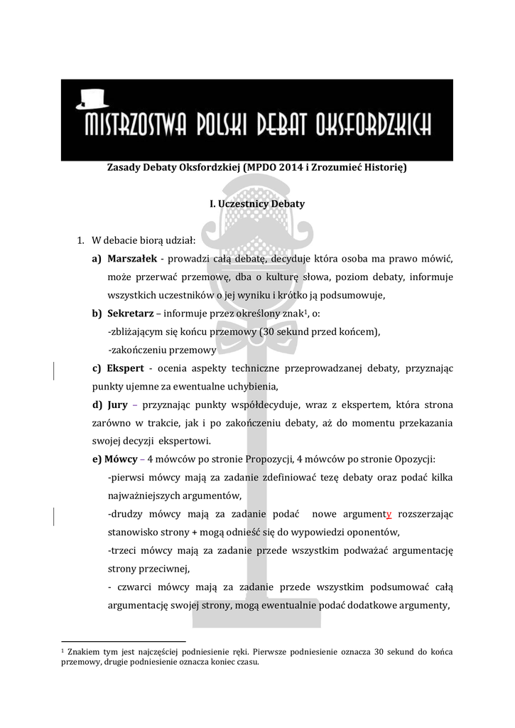 Zasady Debaty Oksfordzkiej (MPDO 2014 i Zrozumieć Historię) I. Uczestnicy Debaty 1. W debacie biorą udział: a) Marszałek - prowadzi całą debatę, decyduje która osoba ma prawo mówić, może przerwać przemowę, dba o kulturę słowa, poziom debaty, informuje wszystkich uczestników o jej wyniku i krótko ją podsumowuje, b) Sekretarz – informuje przez określony znak1, o: -zbliżającym się końcu przemowy (30 sekund przed końcem), -zakończeniu przemowy c) Ekspert - ocenia aspekty techniczne przeprowadzanej debaty, przyznając punkty ujemne za ewentualne uchybienia, d) Jury – przyznając punkty współdecyduje, wraz z ekspertem, która strona zarówno w trakcie, jak i po zakończeniu debaty, aż do momentu przekazania swojej decyzji ekspertowi. e) Mówcy – 4 mówców po stronie Propozycji, 4 mówców po stronie Opozycji: -pierwsi mówcy mają za zadanie zdefiniować tezę debaty oraz podać kilka najważniejszych argumentów, -drudzy mówcy mają za zadanie podać nowe argumenty rozszerzając stanowisko strony + mogą odnieść się do wypowiedzi oponentów, -trzeci mówcy mają za zadanie przede wszystkim podważać argumentację strony przeciwnej, - czwarci mówcy mają za zadanie przede wszystkim podsumować całą argumentację swojej strony, mogą ewentualnie podać dodatkowe argumenty, Znakiem tym jest najczęściej podniesienie ręki. Pierwsze podniesienie oznacza 30 sekund do końca przemowy, drugie podniesienie oznacza koniec czasu. 1 II. Przebieg Debaty 1. Debata toczy się wokół określonej tezy, której broni strona Propozycji, a którą próbuje obalić strona Opozycji. Teza powinna być jasno i jednoznacznie sprecyzowana2. 2. Struktura debaty: a) Debatę zawsze rozpoczyna 1 mówca strony Propozycji. Następnie, naprzemiennie wypowiadają się mówcy poszczególnych stron (1 mówca P->1 mówca O -> 1 mówca P-> 2 mówca O etc.) Debatę zawsze kończy 4 mówca strony Opozycji. b) Każdy z mówców ma 4 minuty na swoje wystąpienie. W tym czasie musi wygłosić swoją przemowę oraz przyjąć odpowiednią liczbę pytań/informacji. Czas nie jest zatrzymywany. c) Ostatnie 30 sekund każdego z wystąpień jest tak zwanym "czasem chronionym". Oznacza to, że od momentu wskazania przez sekretarza, że do końca wystąpienia zostało pół minuty, mówcy nie można zadawać kolejnych pytań/informacji. Jeśli chęć wprowadzenia pytania/informacji zostanie zasygnalizowana wcześniej, mówca ma obowiązek udzielania głosu oponentowi (jeśli nie uczynił tego wcześniej dwukrotnie). W sytuacji, w której sygnalizacja zostanie poczyniona wcześniej, a mówca przeczeka do czasu chronionego i nie przyjmie pytania, zostanie ukarany punktami ujemnymi. d) Każda przemowa musi rozpocząć się krótką inwokacją skierowaną do marszałka, strony przeciwnej i publiczności (wszystkie trzy podmioty powinny zostać powitane. Rozpoczynając od marszałka, a następnie w dowolnej kolejności) np.: "Panie Marszałku, Szanowni Oponenci, wspaniała publiczności" lub "Panie Marszałku, droga Publiczności, szanowni Oponenci". e) Każdy mówca podczas swojej wypowiedzi musi przyjąć co najmniej 2 pytania/informacje od strony przeciwnej (jeżeli takowe padną)3. Orator komunikuje chęć zadania pytania/informacji poprzez podniesienie ręki. Teza nie może przyjąć formy pytania (czy studia są potrzebne?) czy być formą wyboru (studia czy praca). Teza musi opowiadać się za konkretną postawą (Studia są najlepszą drogą rozwoju osobistego). 3 Nie podlega ograniczeniom liczba pytań/informacji zaprezentowanych przez mówców z własnej drużyny. 2 2 Podczas swojej przemowy, to mówca decyduje od kogo chce przyjąć pytanie/informację poprzez wskazanie ręką odpowiedniej osoby. Wyznaczona osoba wstaje i rozpoczyna krótką inwokacją: "Panie Marszałku pytanie/informacja". Następnie zadaje pytanie lub podaje informację (krótko – maksymalnie 2 zdania4). Jeżeli mówca, który zadał pytanie, chce odnieść się do wypowiedzi osoby spytanej musi ponownie podnieść rękę5. f) Na mówcy spoczywa obowiązek śledzenia chęci zadania pytania/informacji przez stronę przeciwną. Oznacza to, że w sytuacji, w której mówca dostrzega, że oponent waha się, czy wprowadzić pytanie/informację bezpieczniej jest udzielić głosu stronie przeciwnej. Niekiedy oponenci nie są wytrwali w utrzymywaniu rąk w górze, robiąc to zbyt krótko, by przemawiający mógł zareagować/dokończyć rozpoczęte zdanie. W takich sytuacjach mówca powinien zachować czujność, zapamiętując nawet krótko sygnalizowaną chęć zadania mu pytania/informacji przez przeciwników. Reakcja nie musi być natychmiastowa - mówca może po zakończeniu danej części swojej przemowy zapytać oponentów, np. „miał Pan do mnie jakieś pytanie?" g) Mówca udziela głosu tylko stronie przeciwnej (tym samym nie jest możliwe zgłaszanie pytań i informacji oraz udzielanie głosu zawodnikom swojej drużyny). 3. Po zakończonej debacie następuje przerwa, podczas której poszczególni jurorzy przyznają punkty, które sumuje później ekspert przy uwzględnieniu przyznanych przez siebie punktów ujemnych. 4. Marszałek kończy i ogłasza wynik debaty. III. Wynik i punktacja 1. Decyzja o wyniku debaty podejmowana jest przez jury oraz eksperta. W przypadku zbyt długiego pytania/informacji marszałek może przerwać wypowiedź (W sytuacji, w której wygłaszana jest informacja/pytanie i jest ono w odczuciu marszałka dłuższe niż krótka wypowiedź marszałek wygłasza formułę "dziękuję Panu/Pani" (lub inną, sygnalizującą odebranie głosu), co oznacza dla eksperta sygnał do obligatoryjnego odjęcia punktów za niewłaściwe sformułowanie pytania/informacji. 5 Nie może samowolnie wypowiedzieć się podczas przemowy przeciwnika (polemika spowoduje przyznanie punktów ujemnych). 4 3 2. W skład jury wchodzą 3 osoby6. Każdy z jurorów ma do rozdysponowania 10 pkt, które rozdziela pomiędzy dwie