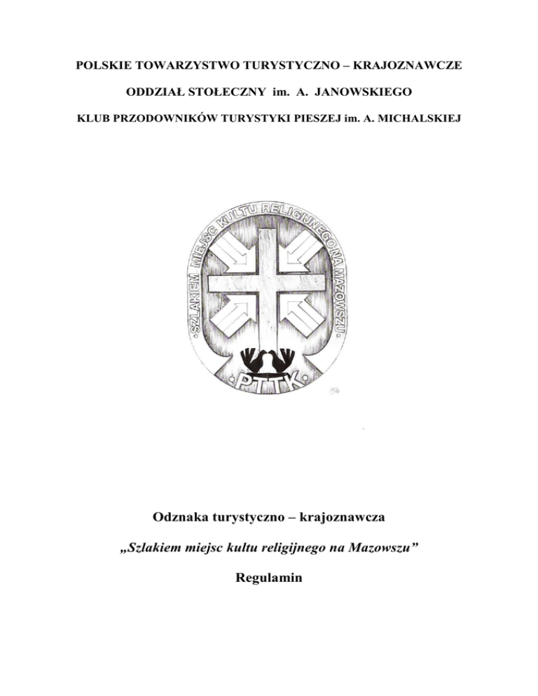 POLSKIE TOWARZYSTWO TURYSTYCZNO – KRAJOZNAWCZE ODDZIAŁ STOŁECZNY im. A. JANOWSKIEGO KLUB PRZODOWNIKÓW TURYSTYKI PIESZEJ im. A. MICHALSKIEJ Odznaka turystyczno – krajoznawcza „Szlakiem miejsc kultu religijnego na Mazowszu” Regulamin Postanowienia ogólne. 1. Odznaka krajoznawcza „Szlakiem miejsc kultu religijnego na Mazowszu” została ustanowiona przez klub Przodowników Turystyki Pieszej im. A. Michalskiej w Warszawie. 2. Celem odznaki jest popularyzacja miejsc kultu religijnego na Mazowszu. 3. Odznaka jest jednostopniowa. Warunki zdobywania i weryfikacja odznaki. 1. Zdobywanie odznaki rozpoczyna się od dnia 1.01.2004 roku. 2. NaleŜy odwiedzić 10 miejsc kultu religijnego poza miejscem zamieszkania, wskazanych w załączonym wykazie. 3. Sposób zdobywania odznaki jest dowolny. 4. Odznakę moŜna zdobywać równolegle z odznakami krajoznawczymi i turystyki kwalifikowanej. 5. Czas zdobywania odznaki jest nieograniczony. 6. Podstawą do ubiegania o przyznanie odznaki jest kronika prowadzona w dowolnej formie przez zdobywającego. 7. Prowadzący kronikę musi udokumentować pieczęcią odwiedzenie miejsca kultu. 8. Potwierdzenia zwiedzanych miejsc mogą dokonać takŜe: przodownicy turystyki kwalifikowanej, przewodnicy, instruktorzy krajoznawstwa Polski i regionu, na terenie którego znajduje się miejsce kultu oraz kierownicy wycieczek. 9. Odznakę zdobywają turyści, którzy ukończyli 10 lat. 10. Odznakę przyznaje Referat Weryfikacyjny KTP Oddziału Stołecznego PTTK w Warszawie RYNEK STAREGO MIASTA 23. Wykaz miejsc kultu religijnego na Mazowsza L.p. Miejscowość 1 Białobrzegi k /Radomia – kościół parafialny Błotnica Stara k/ Radomia – sanktuarium Matki BoŜej Pocieszenia Ziemi Radomskiej Borowina k/Nowego Miasta n/Pilicą – kościół parafialny Brodowe Łąki k/Myszyńca – kościół parafialny Brochów k/ Sochaczewa – kościół parafialny Czerwińsk n/ Wisłą – bazylika Zwiastowania NMP – Sanktuarium MB Królowej Mazowsza – Zwycięskiej MB Pocieszenia Daniszewo k/ Płońska – kościół parafialny Długosiodło k/ Ostrowi Maz. – kościół parafialny Dobrzyków k/ Płocka – kościół parafialny Drogiszka k/ Ciechanowa – kościół parafialny Gielniów k/ Przysuchy Goślin k/ Garwolina – kościół parafialny Góra Kalwaria - kościół Niepokalanego Poczęcia NMP 2 3 4 5 6 7 8 9 10 11 12 13 Przedmiot kultu kult św. Rocha obraz Matki BoŜej Pocieszenia - Pani Ziemi Radomskiej z XV w. kult Przemienienia Pańskiego kult Przemienienia Pańskiego relikwie św. Rocha - obraz Matki BoŜej Królowej Mazowsza – Zwycięskiej Matki BoŜej Pocieszenia - relikwie św. Barbary kult Przemienienia Pańskiego figura św. Rocha z XIX w. obraz Matki BoŜej z XVII w. kult Przemienienia Pańskiego miejsce urodzenia bł. Ładysława z Gielniowa obraz Matki BoŜej Goślińskiej z XVII w. - obraz NMP Górskiej Łaskawej Matki Pocieszenia z XVII w. 14 15 16 17 18 19 20 21 22 23 24 25 26 27 28 29 30 31 32 33 34 35 36 37 38 39 40 41 42 43 - kaplica św. Antoniego Grudusk k/ Mławy – kościół parafialny Holubla k/ Siedlec – kościół parafialny Huszlew k/ Łosic – kościół parafialny Kazanów IłŜecki k/ Zwolenia – kościół parafialny Jarosławice k/ Radomia – kościół parafialny Kępa Polska k/ Płocka – kościół parafialny Koziebrody k/ RaciąŜa – kościół parafialny Krzynowłoga Wielka k/ Przasnysza – kościół parafialny Lewiczyn k/ Grójca – sanktuarium Matki BoŜej Patronki Ziemi Grójeckiej Loretto k/ Kamieńczyka - sanktuarium Matki BoŜej z Loretto Łęgonice DuŜe k/ Nowego Miasta n/ Pilicą – kościół na Górze Zgody Łopacin k/ Ciechanowa – kościół parafialny Miedniewice k/ śyrardowa – sanktuarium Miedniewickiej Pani Miedzna k/ Węgrowa – kościół parafialny Mokobody k/ Siedlec – kościół parafialny Mordy k/ Siedlec – kościół parafialny - sarkofag z relikwiami św. Waleriana patrona Ziemi Czerskiej - kult św. Antoniego obraz Matki BoŜej Gruduskiej z XVII w. obraz Matki BoŜej z XIX w. obraz św. Antoniego z XVII w. obraz Przemienienia Pańskiego z XVIII w. obraz koronacji Najświętszej Marii Panny obraz Matki BoŜej Kępskiej – Zwiastowania NMP obraz Matki BoŜej Koziebrodzkiej - kopia z XVII w. obraz Przemienienia Pańskiego z XVIII w. obraz Matki BoŜej z XVII w. figura Matki BoŜej Loretańskiej obraz św. Rocha obraz Matki BoŜej Łopacińskiej – współczesna kopia obrazu z XVII w. obraz Świętej Rodziny obraz Matki BoŜej Miedzwińskiej z XVII w. obraz Matki BoŜej Budziszyńskiej z XVII w. - kult Przemienienia Pańskiego - kult św. Rocha Niepokalanów – sanktuarium - miejsce Ŝycia i działalności św. MM Niepokalanego Poczęcia NMP Kolbego - figura MB Niepokalanej Nowe Miasto n/ Pilicą – kościół i klasztor - kopia obrazu MB Częstochowskiej oo. Kapucynów - grobowiec bł. O. H. Koźmińskiego OŜarów Maz. – sanktuarium Miłosierdzia obraz Miłosierdzia BoŜego BoŜego Pieczyska k/ Grójca – sanktuarium obraz Matki BoŜej Częstochowskiej – kopia z XV Narodzenia NMP w. Płock – katedra - figura Matki BoŜej z XVII w. - relikwie św. Zygmunta w relikwiarzu z XII w. - obraz Matki BoŜej Częstochowskiej kopia z XVIII w. Popowo Kościelne k/ Serocka – kościół obraz Matki BoŜej Popowskiej z XVII w.parafialny kopia obrazu Matki BoŜej Częstochowskiej Przasnysz – sanktuarium Matki BoŜej obraz Matki BoŜej Przasnyskiej z XVI w. – kopia Niepokalanej oo. Pasjonistów Matki BoŜej ŚnieŜnej z Rzymu Pułtusk – kaplica szpitala miejskiego obraz św. Stanisława Kostki Ratowo k/ Przasnysza – kościół obraz św. Antoniego z XVII w. parafialny Rokitno k/ Błonia – sanktuarium obraz Matki BoŜej Rokitniańskiej Wniebowzięcia NMP Rostkowo k/ Przasnysza miejsce urodzenia św. Stanisława Kostki Sadykierz k/ Pułtuska – kościół parafialny kult św. Rocha Secymin – Nowiny k /Brochowa – obraz Matki BoŜej Patronki Lasów Polskich sanktuarium MB