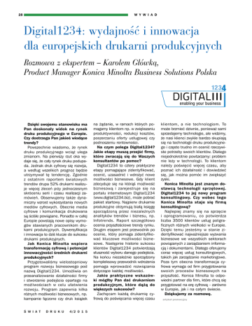 W Y W I A D 28 Digital1234: wydajność i innowacja dla europejskich drukarni produkcyjnych Rozmowa z ekspertem – Karolem Główką, Product Manager Konica Minolta Business Solutions Polska DIGITAL enabling your business Dzięki swojemu stanowisku ma Pan doskonały widok na rynek druku produkcyjnego w Europie. Czy dostrzega Pan jakieś wiodące trendy? Powszechnie wiadomo, że rynek druku produkcyjnego wciąż ulega zmianom. Na pierwszy rzut oka wydaje się, że cały rynek druku podupada. Jednak druk cyfrowy się rozwija, a według wszelkich prognoz będzie utrzymywał tę tendencję. Zgodnie z ostatnim raportem światowych trendów drupa 52% drukarni realizuje więcej zleceń przy jednoczesnym skróceniu serii i czasu realizacji zamówień. Obserwujemy także dynamiczny wzrost wykorzystania nowych mediów cyfrowych. Obecnie media cyfrowe i komunikacja drukowana są ściśle powiązane. Ponadto w całej Europie powstają nowe opisy wymogów stawianych pracownikom drukarni produkcyjnych. Dywersyfikacja i innowacja to dziś klucze do sukcesu drukarni produkcyjnych. Jak Konica Minolta wspiera transformację cyfrową i potencjał innowacyjności średnich drukarni produkcyjnych? Przygotowaliśmy wielostopniowy program rozwoju biznesowego pod nazwą Digital1234. Umożliwia on przeanalizowanie działalności firmy i stworzenie podejścia opartego na możliwościach w celu ułatwienia rozwoju. Program zapewnia kilka różnych możliwości biznesowych, np. kampanie łączone czy druk książek Ś W I A T D R U K U 4/2 0 1 5 na żądanie, w ramach których pomagamy klientom np. w zwiększaniu produktywności, redukcji kosztów, poszerzaniu oferty usługowej czy podnoszeniu rentowności. Na czym polega Digital1234? Jakie etapy muszą przejść firmy, które zwracają się do Waszych konsultantów po pomoc? Digital1234 to cztery praktyczne etapy pomagające zidentyfikować, ocenić, uzasadnić i wdrożyć nowe możliwości biznesowe. Gdy klient zdecyduje się na którąś możliwość biznesową i zarejestruje się na portalu internetowym Digital1234 (www.digital1234.biz), może pobrać pakiet startowy. Najpierw drukarnie produkcyjne otrzymują białą księgę sporządzoną przez niezależnych analityków trendów i biznesu, np. Infotrends. Raport szczegółowo ocenia przyszłościowe trendy rynku. Drugim etapem jest przewodnik po ocenie, który pomaga zidentyfikować kluczowe możliwości biznesowe. Następnie historie sukcesu klientów Digital1234 potwierdzają słuszność wyboru danego podejścia. Na końcu niezależnie sporządzony kompleksowy przewodnik wdrożenia pomaga wprowadzić rozwiązania dotyczące każdej możliwości. Jakie praktyczne wskazówki mógłby Pan dać drukarniom produkcyjnym, które dążą do większych sukcesów? Zachęcam każdą drukarnię cyfrową do poświęcania więcej czasu klientom, a nie technologiom. To może brzmieć dziwnie, ponieważ sami sprzedajemy technologie, ale widzimy, że nasi klienci zwykle bardzo skupiają się na technologii druku produkcyjnego i często trudno im ocenić rzeczywiste potrzeby swoich klientów. Dlatego niejednokrotnie powtarzamy: problem nie leży w technologii. To klientom należy poświęcić więcej czasu, aby poznać ich działalność i dowiedzieć się, jak można pomóc im zwiększyć zyski. Konica Minolta jest znanym dostawcą technologii sprzętowej. Digital1234 to jej nowy program konsultingowy. Czy wobec tego Konica Minolta staje się firmą konsultingową? Najlepiej znamy się na sprzęcie i oprogramowaniu, co potwierdza liczba 3500 klientów usług poligraficznych różnych wielkości w Europie. Dzięki temu jesteśmy w stanie zidentyfikować najważniejsze wyzwania biznesowe we wszystkich sektorach powiązanych z zarządzaniem informacją i dokumentami. Dlatego oferujemy coraz więcej usług konsultingowych, takich jak zarządzanie marketingowe. Poza tym obecna transformacja cyfrowa wymaga od firm przygotowania swoich procesów biznesowych na przyszłość. Konica Minolta to odpowiedni partner dla firm, które chcą się przygotować na erę cyfrową – zarówno w Europie, jak i na całym świecie. Dziękujemy za rozmowę. artykuł promocyjny