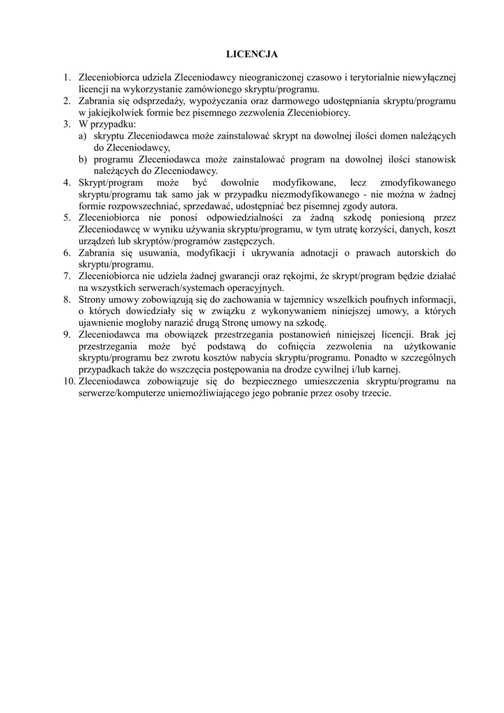 LICENCJA 1. Zleceniobiorca udziela Zleceniodawcy nieograniczonej czasowo i terytorialnie niewyłącznej licencji na wykorzystanie zamówionego skryptu/programu. 2. Zabrania się odsprzedaży, wypożyczania oraz darmowego udostępniania skryptu/programu w jakiejkolwiek formie bez pisemnego zezwolenia Zleceniobiorcy. 3. W przypadku: a) skryptu Zleceniodawca może zainstalować skrypt na dowolnej ilości domen należących do Zleceniodawcy, b) programu Zleceniodawca może zainstalować program na dowolnej ilości stanowisk należących do Zleceniodawcy. 4. Skrypt/program może być dowolnie modyfikowane, lecz zmodyfikowanego skryptu/programu tak samo jak w przypadku niezmodyfikowanego - nie można w żadnej formie rozpowszechniać, sprzedawać, udostępniać bez pisemnej zgody autora. 5. Zleceniobiorca nie ponosi odpowiedzialności za żadną szkodę poniesioną przez Zleceniodawcę w wyniku używania skryptu/programu, w tym utratę korzyści, danych, koszt urządzeń lub skryptów/programów zastępczych. 6. Zabrania się usuwania, modyfikacji i ukrywania adnotacji o prawach autorskich do skryptu/programu. 7. Zleceniobiorca nie udziela żadnej gwarancji oraz rękojmi, że skrypt/program będzie działać na wszystkich serwerach/systemach operacyjnych. 8. Strony umowy zobowiązują się do zachowania w tajemnicy wszelkich poufnych informacji, o których dowiedziały się w związku z wykonywaniem niniejszej umowy, a których ujawnienie mogłoby narazić drugą Stronę umowy na szkodę. 9. Zleceniodawca ma obowiązek przestrzegania postanowień niniejszej licencji. Brak jej przestrzegania może być podstawą do cofnięcia zezwolenia na użytkowanie skryptu/programu bez zwrotu kosztów nabycia skryptu/programu. Ponadto w szczególnych przypadkach także do wszczęcia postępowania na drodze cywilnej i/lub karnej. 10. Zleceniodawca zobowiązuje się do bezpiecznego umieszczenia skryptu/programu na serwerze/komputerze uniemożliwiającego jego pobranie przez osoby trzecie.