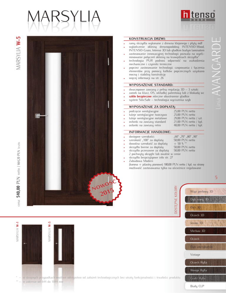 • • • • • • • • • • • • • • brutto • • cena: 540,00 PLN netto / 664,20 PLN • • • • N O OW ĚÈ 5 201 WYPOSAĹENIE STANDARD: dwuczopowe zawiasy z peănÇ regulacjÇ 3D – 3 sztuki zamek na klucz, OS, wkăadkÛ patentowÇ lub z blokadÇ wc szkăo bezpieczne mleczne obustronnie găadkie system SilicSafe – technologia wyciszenia szyb WYPOSAĹENIE ZA DOPĂATÆ: podciÛcie wentylacyjne 25,00 tuleje wentylacyjne tworzywo 25,00 tuleje wentylacyjne metalowe 29,00 osăonki na zawiasy standard 21,00 osăonki na zawiasy retro 48,00 PLN PLN PLN PLN PLN AVANGARDE • KONSTRUKCJA DRZWI: ramy skrzydăa wykonane z drewna klejonego i păyty mdf wykoączenie okleinÇ drewnopodobnÇ INTENSO-Wood, INTENSO-Grain, Intenso 3D lub găadkim biaăym laminatem zastosowanie innowacyjnej technologii pozwala na wyeliminowanie poăÇczeą okleiny na krawÛdziach skrzydăa* technologia PUR podnosi odpornoěÉ na uszkodzenia mechaniczne i czynniki termiczne poprzez zastosowanie technologii czopowania i ăÇczenia elementów przy pomocy koăków poprzecznych uzyskano mocnÇ i stabilnÇ konstrukcjÛ wiÛcej informacji na str. 26 netto netto netto / szt. netto / kpl. netto / kpl. INFORMACJE HANDLOWE: dostÛpne szerokoěci „60” „70” „80” „90” szerokoěÉ „100” za dopăatÇ 50,00 PLN netto dowolna szerokoěÉ za dopăatÇ + 50 % ** skrzydăo bierne za dopăatÇ 50,00 PLN netto skrzydăo przesuwne za dopăatÇ 50,00 PLN netto 2 pochwyty okrÇgăe lub owalne w cenie skrzydăo bezprzylgowe info str. 27 Zabudowa Modern (korona + pilastry pionowe) 180,00 PLN netto / kpl. na stronÛ moĺliwoěÉ zastosowania tylko na oěcieĺnice regulowane 5 WiÇz perăowy 3D DÇb szary 3D DÇb 3D MARSYLIA W-5 Orzech 3D MARSYLIA W-1 Linia • DOSTÚPNE KOLORY: MARSYLIA W-5 MARSYLIA Jesion 3D Merbau 3D Orzech DÇb amerykaąski Vintage Orzech Ryßa Wenge Ryßa * – w skrajnych przypadkach moĺliwe odstÛpstwo od zaăoĺeą technologicznych bez utraty funkcjonalnoěci i trwaăoěci produktu. ** – w zakresie od 644 do 1044 mm GraÞt Ryßa Biaăy CLP