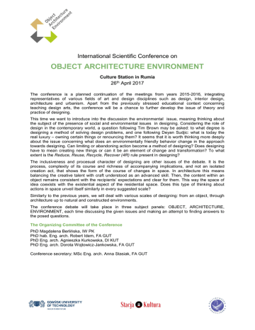 International Scientific Conference on OBJECT ARCHITECTURE ENVIRONMENT Culture Station in Rumia 26th April 2017 The conference is a planned continuation of the meetings from years 2015-2016, integrating representatives of various fields of art and design disciplines such as design, interior design, architecture and urbanism. Apart from the previously stressed educational context concerning teaching design arts, the conference will be a chance to further develop the issue of theory and practice of designing. This time we want to introduce into the discussion the environmental issue, meaning thinking about the subject of the presence of social and environmental issues in designing. Considering the role of design in the contemporary world, a question following Tim Brown may be asked: to what degree is designing a method of solving design problems, and one following Deyan Sudjic: what is today the real luxury – owning certain things or renouncing them? It seems that it is worth thinking more deeply about the issue concerning what does an environmentally friendly behavior change in the approach towards designing. Can limiting or abandoning action become a method of designing? Does designing have to mean creating new things or can it be an element of change and transformation? To what extent is the Reduce, Reuse, Recycle, Recover (4R) rule present in designing? The inclusiveness and procesual character of designing are other issues of the debate. It is the process, complexity of its course and richness of accompanying implications, and not an isolated creation act, that shows the form of the course of changes in space. In architecture this means balancing the creative talent with craft understood as an advanced skill. Then, the content within an object remains consistent with the recipients’ expectations and clear for them. This way the space of idea coexists with the existential aspect of the residential space. Does this type of thinking about actions in space unveil itself similarly in every suggested scale? Similarly to the previous years, we will deal with various scales of designing: from an object, through architecture up to natural and constructed environments. The conference debate will take place in three subject panels: OBJECT, ARCHITECTURE, ENVIRONMENT, each time discussing the given issues and making an attempt to finding answers to the posed questions. The Organizing Committee of the Conference PhD Magdalena Berlińska, IW PK PhD hab. Eng. arch. Robert Idem, FA GUT PhD Eng. arch. Agnieszka Kurkowska, DI KUT PhD Eng. arch. Dorota Wojtowicz-Jankowska, FA GUT Conference secretary: MSc Eng. arch. Anna Stasiak, FA GUT Scientific Committee Chairman: prof. PhD hab. Eng. Arch. Andrzej Baranowski, Faculty of Architecture Sopot University of Applied Science, Poland, Faculty of Architecture Gdańsk University of Technology Members: PhD hab. Eng. arch. Agata Bonenberg, Dipartimento di Architettura e Studi Urbani, Politecnico di Milano, Italy PhD hab. Anna Frąckowicz, The Higher School of Art and Design, Poland PhD hab. Eng. arch. Robert Idem, Faculty of Architecture Gdansk University of Technology, Poland PhD Eng. arch. Marcin Kołakowski, School of Architecture & Design, University of Lincoln, United Kingdom assoc. prof. PhD hab. Monika Kostrzewa, Faculty of Pedagogy and Fine Arts of Adam Mickiewicz University in Kalisz, Poland prof. Anton Leshchinsky, Faculty of Arts and Design, Yanka Kupala State University of Grodno, Belarus PhD hab. Izabela Łapińska, Lodz Film School, Poland assoc. prof. PhD hab. Marek Średniawa, Academy of Fine Arts in Gdansk, Poland prof. PhD hab. Andrzej Wielgosz, Design Institute at Koszalin University of Technology, Poland PhD hab. Eng. arch. Marek Wysocki, Universal Design Center, Faculty of Architecture Gdansk University of Technology, Poland Curator of the OBJECT panel: PhD Magdalena Berlińska, an expert on industrial design, Design Institute at Koszalin University of Technology, Poland Curator of the ARCHITECTURE panel: PhD Eng. arch. Agnieszka Kurkowska, Design Institute at Koszalin University of Technology, Poland Curators of the ENVIRONMENT panel: PhD Eng. arch. Bogusława Konarzewska, Faculty of Architecture. Gdansk University of Technology, Poland PhD Eng. arch. Dorota Wojtowicz-Jankowska, Faculty of Architecture. Gdansk University of Technology, Poland IMPORTANT INFORMATION Conference Venue: Culture Station, Starowiejska Street 2, 84-230 Rumia, Poland Application deadline: Deadline for abstracts acceptance: Conference date: Deadline of full paper submission: 28.02.2017 07.03.2017 26.04.2017 15.05.2017 Conference languages: Polish, English and Russian. Languages of publication: Polish and English. Send your registration form and articles to: [email protected] Conference participants do not bear the costs of participation in the Conference and costs of publication. Those articles that receive positive reviews will be published in the monograph. Editorial guidelines, and basic program of the Conference will be published in the Announcement no 2. Conference organizers do not provide accommodation. More information at: http://arch.pg.edu.pl/katedra-projektowania-srodowiskowego/-/przedmiot-architektura-srodowisko Contact: [email protected] To participate in the Conference invite: Design Institute Koszalin University of Technology Faculty of Architecture Gdańsk University of Technology The Public Library ul. Racławicka 15-17 75-620 Koszalin http://wzornictwo.tu.koszalin.pl ul. Gabriela Narutowicza 11/12 80-233 Gdańsk http://arch.pg.edu.pl ul. Starowiejska 2 84-230 Rumia http://bibliotekarumia.pl