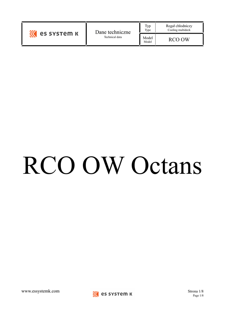 Typ Regał chłodniczy Dane techniczne Type Cooling multideck Technical data Model RCO OW Model RCO OW Octans www.essystemk.com Strona 1/8 Page 1/8 Typ Regał chłodniczy Dane techniczne Type Cooling multideck Technical data Model RCO OW Model SPIS TREŚCI: 1. Informacje ogólne ..................................................................................................................3 General information 2. Informacje elektryczne............................................................................................................4 Electrical information 3. Informacje chłodnicze ...........................................................................................................5 Cooling information 4. Wymiary ................................................................................................................................6 Dimmensions 5. Uwagi .....................................................................................................................................8 Points www.essystemk.com Strona 2/8 Page 2/8 Dane techniczne Typ Regał chłodniczy Technical data Type Cooling multideck Informacje ogólne Model General information Model RCO OW Moduł 2,50 3,75 [mm] 2500 3750 [mm] 2600 3850 [mm] 2080 2080 [mm] 1255 1255 [m2] 4,35 6,52 [dm3] 1100 1650 [kg] 400 690 Module Długość całkowita (bez boków) Total length (without end walls) Długość całkowita (z bokami) Total length (with end walls) Wysokość Height Szerokość Width Powierzchnia eksploatacyjna (półki 500 mm) Max. display area Pojemność użytkowa pojemniki 620x400x185) Total useful capacity Masa Net weight Typ chłodniczy Type cooling Klasa temperaturowa H1 Temperature class Zakres temperatur Temperature range [oC] +4 ÷ +10 *) Czynnik chłodniczy R404A (R507) Refrigerant Typ odmrażania naturalne (elektryczne) **) Defrosting natural (electrical) **) Grubość boków Thickness of bumper Max. dopuszczalne obciążenie półek Max. shelf load *) [mm] 50 [kg/m2] 200 dla warunków otoczenia: temperatura +25 [oC], wilgotność względna 60 [%], operating features are based on ambient conditions of 25 [°C] temperature and 60 [%] relative humidity, **) odmrażanie elektryczne w opcji, electrical defrosting in option, www.essystemk.com Strona 3/8 Page 3/8 Dane techniczne Typ Regał chłodniczy Technical data Type Cooling multideck Informacje elektryczne Model Electrical information Model RCO OW Napięcie zasilania 230 [V] 50 [Hz] 2,50 3,75 [W] 1100 *) 1675 *) [W] 61 91 Ilość 2 3 [W] 2x36 3x36 4 6 Ø200 Ø200 34 34 M4Q045 M4Q045 4x36 6x36 ESM M1G055 ESM M1G055 4x10 6x10 2,50 3,75 [W] 277 / 1377 *) 415 / 2090 *) [kWh/24h] 5,93 8,88 Power supply Moduł Module Moc grzałek odmrażania Power of defrosting heater Moc grzałki antykondensacyjnej Power of antidew heater Moc oświetlenia Power of lighting Ilość Quanitity Średnica [mm] Typ śmigła Diameter Type of blade Kąt Pitch Wentylatory parownika Evaporator fans [ o] Typ Type Standardowe Standard Moc Power [W] Typ Type Energooszczędne High efficiency Moc Power [W] Moduł Module Nominalny pobór mocy elektrycznej Nominal power consumption Nominalne zużycie energii elektrycznej Nominal electric energy consumption *) elektryczne odmrażnianie w opcji electrical defrosting in optional version www.essystemk.com Strona 4/8 Page 4/8 Temperatura skraplania Condensing temperature Regał chłodniczy Type Cooling multideck Informacje chłodnicze Model Cooling information Model RCO OW Klasa klimatyczna [oC] -10 Temperatura otoczenia [oC] +35 Wilgotność względna Refrigerant Evaporating temperature Typ Technical data R404A, (R507) Czynnik chłodniczy Temperatura odparowania Dane techniczne Ambient temperature Relative humadity Prędkość powietrza Air speed Oświetlenie Lighting Moduł 25 [%] 60 [m/s] 0,15 [lx] 600 3,75 H1 H1 +4 ÷ +10 *) +4 ÷ +10 *) - - [W] 3800 5800 [mm] Ø10 Ø10 [mm] Ø16 Ø16 Klasa temperaturowa Temperature class [oC] Temperature range [oC] 2,50 Module Zakres temperatur 3 Climatic class Agregat chłodniczy Condensing unit Zapotrzebowanie mocy chłodniczej Cooling power demand dla /for t0= -8 [oC] Cieczowy Przyłącza Liquid Connectors Gazowy Gas Typ Zawór rozprężny Type Expansion valve Dysza TISE-SW lub/or TIE-SW TIO-003 Orifice Nastawa temperatury Setting of temperature Dyferencjał sterowania Differential of temperature [oC] +4 Ilość odmrażań na dobę [oC] 2 Maksymalny czas odmrażania 6 Number of defrost per 24h Maximum defrost duration Czas ociekania Dripping time Temperatura końca odmrażania End of defrosting temperature *) TIO-003 [min] 45 [min] 10 [oC] +8 dla warunków otoczenia: temperatura +25 [oC], wilgotność względna 60 [%], operating features are based on ambient conditions of 25 [°C] temperature and 60 [%] relative humidity, www.essystemk.com Strona 5/8 Page 5/8 Dane techniczne Typ Regał chłodniczy Technical data Type Cooling multideck Wymiary Model Dimensions Model RCO OW Przekrój urządzenia www.essystemk.com Strona 6/8 Page 6/8 www.essystemk.com Dane techniczne Typ Regał chłodniczy Technical data Type Cooling multideck Wymiary Model Dimensions Model RCO OW Strona 7/8 Page 7/8 www.essystemk.com Dane techniczne Typ Regał chłodniczy Technical data Type Cooling multideck Uwagi Model Points Model RCO OW Strona 8/8 Page 8/8
