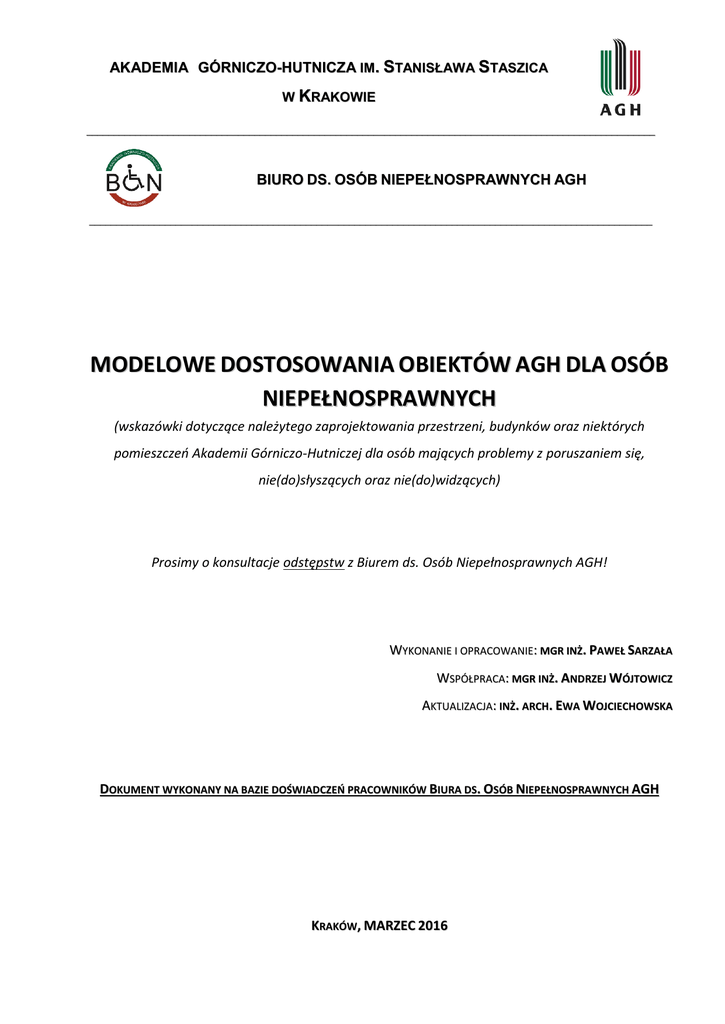 AKADEMIA GÓRNICZO-HUTNICZA IM. STANISŁAWA STASZICA W KRAKOWIE _________________________________________________________________________________________________________ BIURO DS. OSÓB NIEPEŁNOSPRAWNYCH AGH ________________________________________________________________________________________________________ MODELOWE DOSTOSOWANIA OBIEKTÓW AGH DLA OSÓB NIEPEŁNOSPRAWNYCH (wskazówki dotyczące należytego zaprojektowania przestrzeni, budynków oraz niektórych pomieszczeń Akademii Górniczo-Hutniczej dla osób mających problemy z poruszaniem się, nie(do)słyszących oraz nie(do)widzących) Prosimy o konsultacje odstępstw z Biurem ds. Osób Niepełnosprawnych AGH! WYKONANIE I OPRACOWANIE: MGR INŻ. PAWEŁ SARZAŁA WSPÓŁPRACA: MGR INŻ. ANDRZEJ WÓJTOWICZ AKTUALIZACJA: INŻ. ARCH. EWA WOJCIECHOWSKA DOKUMENT WYKONANY NA BAZIE DOŚWIADCZEŃ PRACOWNIKÓW BIURA DS. OSÓB NIEPEŁNOSPRAWNYCH AGH KRAKÓW, MARZEC 2016 Modelowe dostosowania obiektów AGH dla osób niepełnosprawnych Spis Treści 1. PODSTAWY PRAWNE.......................................................................................................... 3 1.1 USTAWA Z DNIA 7 LIPCA 1994 R. – „PRAWO BUDOWLANE” ................................................ 3 Przepisy ogólne (Rozdział 1) ........................................................................................................3 Postępowanie poprzedzające rozpoczęcie robót budowlanych (Rozdział 4) ...............................3 Budowa i oddawanie do użytku obiektów budowlanych (Rozdział 5) .........................................3 1.2 ROZPORZĄDZENIE MINISTRA INFRASTRUKTURY Z DNIA 12 KWIETNIA 2002 ROKU W SPRAWIE WARUNKÓW JAKIM POWINNY ODPOWIADAĆ BUDYNKI I ICH USYTUOWANIE ........ 4 Dojścia i dojazdy (Rozdział 2) .......................................................................................................4 Miejsca postojowe dla samochodów osobowych (Rozdział 3).....................................................4 Ogrodzenia (Rozdział 9)................................................................................................................4 Wejścia do budynków i mieszkań (Rozdział 3) .............................................................................5 Schody i pochylnie (Rozdział 4) .....................................................................................................5 Pomieszczenia przeznaczone na pobyt ludzi (Rozdział 5) ............................................................6 Pomieszczenia higieniczno-sanitarne (Rozdział 6) .......................................................................6 Garaże dla samochodów osobowych (Rozdział 10) .....................................................................6 Wentylacja i klimatyzacja (Rozdział 6) .........................................................................................7 Urządzenia dźwigowe (Rozdział 9) ...............................................................................................7 2. MODELOWE DOSTOSOWANIA ............................................................................................ 9 2.1 ŚRODOWISKO ZEWNĘTRZNE .............................................................................................. 9 2.1.1 2.1.2 Ulice i chodniki .........................................................................................................................9 Schody zewnętrzne ................................................................................................................10 2.2 BUDYNEK DOSTĘPNY ........................................................................................................ 11 2.2.1 Rampy i podjazdy ...................................................................................................................11 2.3 WEJŚCIA, DOJŚCIA DO POCHYLNI ORAZ DRZWI I OKNA ..................................................... 13 2.4 WINDY ............................................................................................................................. 14 2.5 SCHODY WEWNĘTRZNE .................................................................................................... 15 2.6 PODNOŚNIKI I PLATFORMY............................................................................................... 16 2.7 TOALETA/ŁAZIENKA ......................................................................................................... 17 2.8 KUCHNIA .......................................................................................................................... 20 2.9 POKÓJ DZIENNY ORAZ SYPIALNIA ..................................................................................... 22 2.10 ELEKTRYKA ................................................................................................................... 23 2.11 MIEJSCE NAUKI ............................................................................................................. 23 2.12 BUDYNEK DYDAKTYCZNY .............................................................................................. 24 SPIS TABEL ............................................................................................................................... 25 SPIS RYSUNKÓW ...................................................................................................................... 25 2 Modelowe dostosowania obiektów AGH dla osób niepełnosprawnych Ustawa z dnia 7 lipca 1994 roku – „Prawo Budowlane”, powinna dostatecznie regulować wszystkie kwestie związane z dostępnością budynków do osób niepełnosprawnych. Przepisy wyraźnie nakazują, że należy zapewnić niezbędne warunki do korzystania z obiektów użyteczności publicznej przez osoby niepełnosprawne, w szczególności poruszające się na wózkach inwalidzkich. Tymczasem rzeczywistość pokazuje, że nie wszystko jest tak jak być powinno. 1. PODSTAWY PRAWNE 1.1 USTAWA Z DNIA 7 LIPCA 1994 R. – „PR