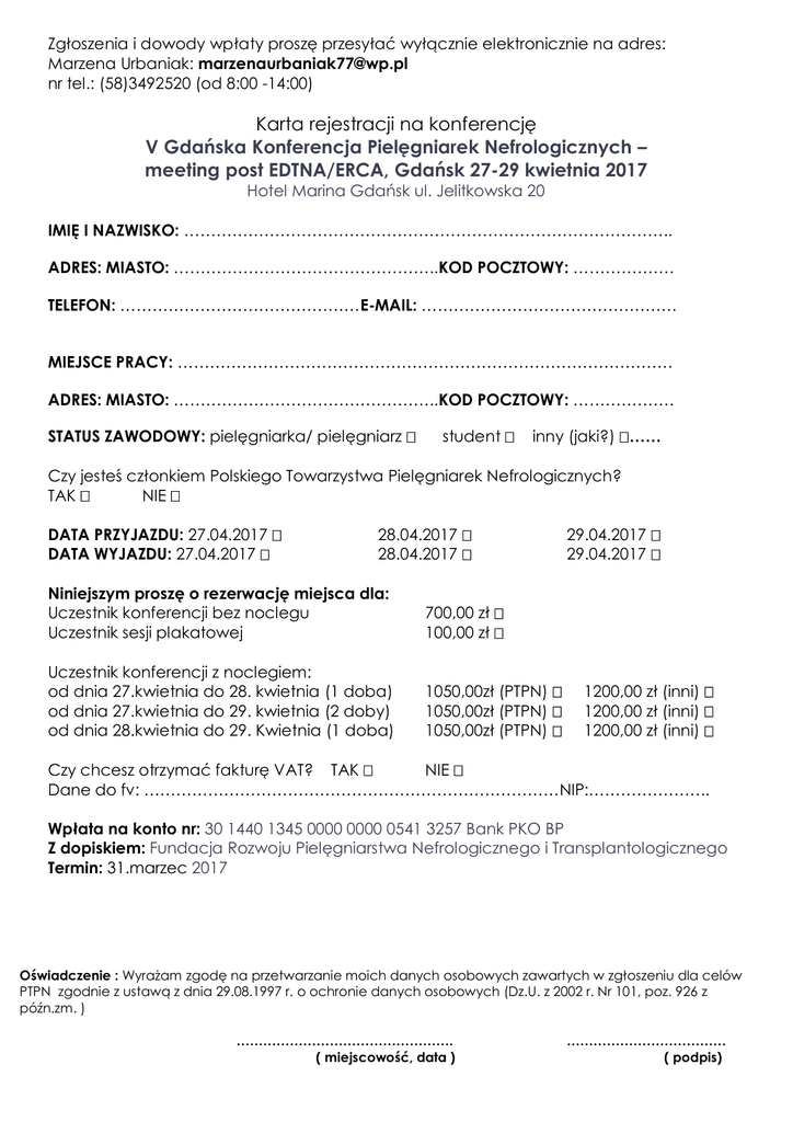 Zgłoszenia i dowody wpłaty proszę przesyłać wyłącznie elektronicznie na adres: Marzena Urbaniak: [email protected] nr tel.: (58)3492520 (od 8:00 -14:00) Karta rejestracji na konferencję V Gdańska Konferencja Pielęgniarek Nefrologicznych – meeting post EDTNA/ERCA, Gdańsk 27-29 kwietnia 2017 Hotel Marina Gdańsk ul. Jelitkowska 20 IMIĘ I NAZWISKO: ……………………………………………………………………………….. ADRES: MIASTO: …………………………………………..KOD POCZTOWY: ………………. TELEFON: ………………………………………E-MAIL: ………………………………………… MIEJSCE PRACY: ………………………………………………………………………………… ADRES: MIASTO: …………………………………………..KOD POCZTOWY: ………………. STATUS ZAWODOWY: pielęgniarka/ pielęgniarz student inny (jaki?) …… Czy jesteś członkiem Polskiego Towarzystwa Pielęgniarek Nefrologicznych? TAK NIE DATA PRZYJAZDU: 27.04.2017 DATA WYJAZDU: 27.04.2017 28.04.2017 28.04.2017 Niniejszym proszę o rezerwację miejsca dla: Uczestnik konferencji bez noclegu Uczestnik sesji plakatowej 700,00 zł 100,00 zł Uczestnik konferencji z noclegiem: od dnia 27.kwietnia do 28. kwietnia (1 doba) od dnia 27.kwietnia do 29. kwietnia (2 doby) od dnia 28.kwietnia do 29. Kwietnia (1 doba) 1050,00zł (PTPN) 1050,00zł (PTPN) 1050,00zł (PTPN) 29.04.2017 29.04.2017 1200,00 zł (inni) 1200,00 zł (inni) 1200,00 zł (inni) Czy chcesz otrzymać fakturę VAT? TAK NIE Dane do fv: ……………………………………………………………………NIP:………………….. Wpłata na konto nr: 30 1440 1345 0000 0000 0541 3257 Bank PKO BP Z dopiskiem: Fundacja Rozwoju Pielęgniarstwa Nefrologicznego i Transplantologicznego Termin: 31.marzec 2017 Oświadczenie : Wyrażam zgodę na przetwarzanie moich danych osobowych zawartych w zgłoszeniu dla celów PTPN zgodnie z ustawą z dnia 29.08.1997 r. o ochronie danych osobowych (Dz.U. z 2002 r. Nr 101, poz. 926 z późn.zm. ) …………………………………………. ( miejscowość, data ) ……………………………… ( podpis)