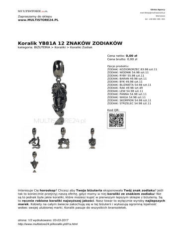 Glinka Agency mail;[email protected] Zapraszamy do sklepu www.MULTISTORE24.PL Warszawa tel. +48 602 395 051 Koralik YB81A 12 ZNAKÓW ZODIAKÓW kategoria: BIŻUTERIA > Koraliki > Koraliki Zodiak Cena netto: 0,00 zł Cena brutto: 0,00 zł Opcje produktu: ZODIAK: KOZIORORZEC 83.98 szt.11 ZODIAK: WODNIK 54.98 szt.11 ZODIAK: RYBY 55.98 szt.11 ZODIAK: BARAN 49.98 szt.11 ZODIAK: BYK 49.98 szt.11 ZODIAK: BLIZNIETA 54.98 szt.11 ZODIAK: RAK 49.98 szt.49 ZODIAK: LEW 54.98 szt.11 ZODIAK: PANNA 54.98 szt.11 ZODIAK: WAGA 54.98 szt.11 ZODIAK: SKORPION 54.98 szt.11 ZODIAK: STRZELEC 54.98 szt.11 Kod QR: Interesuje Cię horoskop? Chcesz aby Twoja biżuteria eksponowała Twój znak zodiaku? Jeśli tak to koniecznie przejrzyj naszą ofertę, gdyż mamy w niej koraliki ze znakiem zodiaku! Nie są to jednak byle jakie koraliki, które możesz kupić w pierwszym lepszym sklepie z biżuterią. Są to ręcznie robione koraliki najwyższej jakości. Nasz towar to wyłącznie wyroby najlepszych marek. Kobiety na całym świecie zakochują się w tej biżuterii i wykazują ogromną lojalność wobec swojej ulubionej marki. Koralik pasuje do wszystkich bransoletek. strona: 1/2 wydrukowano: 03-03-2017 http://www.multistore24.pl/koralik-yb81a.html Wzór Materiał Koraliki Wykończenie zodiak srebro 925 charms Oxyda Tego Produktu nie wysyłamy paczkomatami !!! strona: 2/2 wydrukowano: 03-03-2017 http://www.multistore24.pl/koralik-yb81a.html