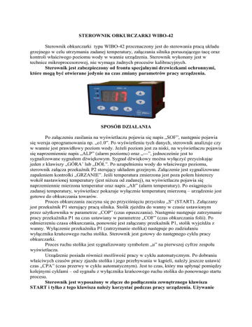 STEROWNIK OBKURCZARKI WIBO-42 Sterownik obkurczarki typu WIBO-42 przeznaczony jest do sterowania pracą układu grzejnego w celu utrzymania zadanej temperatury, załączania silnika poruszającego tacę oraz kontroli właściwego poziomu wody w wannie urządzenia. Sterownik wykonany jest w technice mikroprocesorowej, nie wymaga żadnych procesów kalibracyjnych. Sterownik jest zabezpieczony od frontu specjalnymi drzwiczkami ochronnymi, które mogą być otwierane jedynie na czas zmiany parametrów pracy urządzenia. SPOSÓB DZIAŁANIA Po załączeniu zasilania na wyświetlaczu pojawia się napis „SOF”, następnie pojawia się wersja oprogramowania np. „o1.0”. Po wyświetleniu tych danych, sterownik analizuje czy w wannie jest prawidłowy poziom wody. Jeżeli poziom jest za niski, na wyświetlaczu pojawia się naprzemiennie napis „ALP” (alarm poziomu) oraz „---”, jednocześnie jest to sygnalizowane sygnałem dźwiękowym. Sygnał dźwiękowy można wyłączyć przyciskając jeden z klawiszy „GÓRA’ lub „DÓŁ”. Po uzupełnieniu wody do właściwego poziomu, sterownik załącza przekaźnik P2 sterujący układem grzejnym. Załączenie jest sygnalizowane zapaleniem kontrolki „GRZANIE”. Jeśli temperatura zmierzona jest poza polem histerezy wokół nastawionej temperatury (jest niższa od zadanej), na wyświetlaczu pojawia się naprzemiennie mierzona temperatur oraz napis „Alt” (alarm temperatury). Po osiągnięciu zadanej temperatury, wyświetlacz pokazuje wyłącznie temperaturę mierzoną – urządzenie jest gotowe do obkurczania towarów. Proces obkurczania zaczyna się po przyciśnięciu przycisku „S” (START). Załączany jest przekaźnik P1 sterujący pracą silnika. Stolik zjeżdża do wanny w czasie ustawionym przez użytkownika w parametrze „COP” (czas opuszczania). Następnie następuje zatrzymanie pracy przekaźnika P1 na czas ustawiany w parametrze „COF” (czas obkurczania folii). Po odmierzeniu czasu obkurczania, ponownie jest załączany przekaźnik P1, stolik wyjeżdża z wanny. Wyłączenie przekaźnika P1 (zatrzymanie stolika) następuje po zadziałaniu wyłącznika krańcowego ruchu stolika. Sterownik jest gotowy do następnego cyklu pracy obkurczarki. Proces ruchu stolika jest sygnalizowany symbolem „u” na pierwszej cyfrze zespołu wyświetlacza. Urządzenie posiada również możliwość pracy w cyklu automatycznym. Po dobraniu właściwych czasów pracy zjazdu stolika i jego przebywania w kąpieli, należy jeszcze ustawić czas „CPA” (czas przerwy w cyklu automatycznym). Jest to czas, który ma upłynąć pomiędzy kolejnymi cyklami – od sygnału z wyłącznika krańcowego ruchu stolika do ponownego startu procesu. Sterownik jest wyposażony w złącze do podłączenia zewnętrznego klawisza START i tylko z tego klawisza należy korzystać podczas pracy urządzenia. Używanie klawisza „S” (START) z klawiatury urządzenia jest możliwe tylko w celach serwisowych lub testowych. PROGRAMOWANIE PARAMETRÓW STEROWNIKA Aby rozpocząć programowanie parametrów pracy dla sterownika należy przycisnąć i przytrzymać (ok.0.5 sek) przycisk „P”. Na wyświetlaczu pojawi się napis „COP”(czas opuszczania), jednocześnie pojawi się krótki sygnał dźwiękowy i zapali się kontrolka Alarm (urządzenie nie pracuje). Ponowne przyciśnięcie klawisza „P” , pojawi się wartość cyfrowa czasu opuszczania, którą ustawiamy wg potrzeb, używając klawiszy strzałek „GÓRA” i „DÓŁ”. Po ustawieniu właściwej wartości czasu, przyciskamy klawisz „A” (akceptacja). Na wyświetlaczu pojawi się ponownie napis „COP”. Klawiszami strzałek przesuwamy menu na następną pozycję np. „COF” (czas obkurczania folii). Ponownie przyciskamy klawisz „P”, ustawiamy żądaną wartość czasu, akceptujemy klawiszem „A”. Ponownie przesuwamy menu klawiszem strzałki na parametr „CPA” (czas przerwy w cyklu automatycznym ) i jeżeli urządzenie ma sterować pracą w cyklu automatycznym, to klawiszem „P” wchodzimy w ten parametr i ustawiamy żądaną wartość czasu przerwy. Akceptujemy dokonaną nastawę klawiszem „A”. Przesuwamy menu na następny parametr „tEn” (temperatura nastawiona), przyciskamy „P”, ustawiamy żądaną wartość temperatury, którą sterownik ma utrzymywać, zatwierdzamy „A”, strzałką przechodzimy do parametru „HIS” (histereza), klawiszem „P” wchodzimy w ustawianie wartości histerezy. Po ustawieniu, zatwierdzamy klawiszem „A” i przechodzimy do następnego parametru „OFS” (offset), klawiszem „P” wchodzimy w ustawianie jego wartości, zatwierdzamy klawiszem „A”. W menu jest dostępny jeszcze jeden parametr „FAb” (nastawy fabryczne). Przyciśnięcie klawisza „P” spowoduje ustawienie wartości wszystkich parametrów sterownika na wartości fabryczne, jest to sygnalizowane zapaleniem się na wyświetlaczu napisu „Set”. Jest zalecane użycie tej opcji w przypadku pojawienia się przypadkowych lub błędnych wpisów wartości parametrów sterownika. W celu sygnalizacji użytkownikowi właściwego działania podczas programowania, każdorazowe przyciśnięcie klawisza „P” jest sygnalizowane krótki sygnałem dźwiękowym. Po zaprogramowaniu wszystkich parametrów, zalecane jest wyłączenie zasilania na ok. 5 sek. Po ponownym włączeniu zasilania urządzenie jest gotowe do pracy. Przycisk zewnętrzny „START” rozpoczyna cykl pracy obkurczarki. Załączenie cyklu pracy automatycznej jest dokonywane przez przyciśnięcie klawisza strzałki „GÓRA” lub „DÓŁ”. Zapala się kontrolka „AUTO”, urządzenie czeka na wystartowanie klawiszem START. Po przyciśnięciu klawisza START, rozpoczyna się praca sterownika, na wyświetlaczu jest pokazywana aktualna temperatura wody w wannie, sygnalizowane jest załączenie grzałek (kontrolka GRZANIE) oraz pokazywane jest położenie stolika. Odliczanie czasu przerwy pomiędzy poszcze