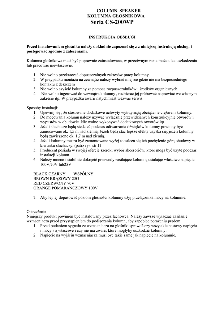 COLUMN SPEAKER KOLUMNA GŁOSNIKOWA Seria CS-200WP INSTRUKCJA OBSŁUGI Przed instalowaniem głośnika należy dokładnie zapoznać się z z niniejszą instrukcją obsługi i postępować zgodnie z zaleceniami. Kolumna głośnikowa musi być poprawnie zainstalowana, w przeciwnym razie może ulec uszkodzeniu lub pracować niewłaściwie. 1. Nie wolno przekraczać dopuszczalnych zakresów pracy kolumny. 2. W przypadku montażu na zewnątrz należy wybrać miejsce gdzie nie ma bezpośredniego kontaktu z deszczem 3. Nie wolno czyścić kolumny za pomocą rozpuszczalników i środków organicznych. 4. Nie wolno ingerować do wewnątrz kolumny , rozbierać jej próbować naprawiać we własnym zakresie itp. W przypadku awarii natychmiast wezwać serwis. Sposoby instalacji: 1. Upewnij się , że stosowane dodatkowe uchwyty wytrzymają obciążenie ciężarem kolumny. 2. Do mocowania kolumn należy używać wyłącznie przewidzianych konstrukcyjnie otworów i wypustów w obudowie. Nie wolno wykonywać dodatkowych otworów itp. 3. Jeżeli słuchacze będą siedzieć podczas odtwarzania dźwięków kolumny powinny być zamocowane ok. 1,5 m nad ziemią. Jeżeli będą stać lepsze efekty uzyska się, jeżeli kolumny będą zawieszone ok. 1,7 m nad ziemią. 4. Jeżeli kolumny musza być zamontowane wyżej to zaleca się ich pochylenie górą obudowy w kierunku słuchaczy. (patrz rys. str.1) 5. Producent posiada w swojej ofercie szeroki wybór akcesoriów, które mogą być użyte podczas instalacji kolumn. 6. Należy mocno i stabilnie dokręcić przewody zasilające kolumnę ustalając właściwe napięcie 100V,70V lub25V BLACK CZARNY WSPÓLNY BROWN BRĄZOWY 25Ω RED CZERWONY 70V ORANGE POMARAŃCZOWY 100V 7. Aby lepiej dopasować poziom głośności kolumny użyj przełącznika mocy na kolumnie. Ostrzeżenie Niniejszy produkt powinien być instalowany przez fachowca. Należy zawsze wyłączać zasilanie wzmacniacza przed przystąpieniem do podłączania kolumn, aby zapobiec porażeniu prądem. 1. Przed podaniem sygnału ze wzmacniacza na głośniki sprawdź czy wszystkie nastawy napięcia i mocy s ą właściwe i czy nie ma zwarć, które mogłyby uszkodzić kolumny. 2. Napięcie na wyjściu wzmacniacza musi być takie same jak napięcie na kolumnie. Dane techniczne Model Głośnik wewnętrzny Moc wejściowa Moc wyjściowa Impedancje wejściowe Napięcie wejściowe Pasmo przenoszenia Skuteczność Wymiary tuby Waga CS-212WP 4szt. 2,5” szerokopasmowy CS-320WP 4szt. 5”x7” szerokopasmowy 12W rated /24W maks. CS-220WP 7szt. 2,5” szerokopasmowy 20W rated /40W maks. 1,5W /3W/6W/12W 2,5W/5W/10W/20W 1,25W/2,5W/5W/10W/20W 20W rated /40W maks. 100V:6,6kΩ/3,3kΩ/1,66kΩ/ 100V:4kΩ/2kΩ/1kΩ/ 833Ω 500Ω 70V:3,26kΩ/1,63kΩ/816Ω/408Ω 70V:2kΩ/1kΩ/500Ω/ 250Ω 25V:416Ω/208Ω/104Ω/52Ω 25V:250Ω/125Ω/62Ω/ 31Ω 25V/70V/100V 25V/70V/100V 100V:8kΩ/4kΩ/2kΩ/1kΩ/500Ω 250Hz-16000Hz 250Hz-16000Hz 100Hz-16000Hz 94dB(1W/1m) 106x405x75mm 94dB(1W/1m) 169x868x113 98dB(1W/1m) 287 mm x 208 mm 2,2kg 3,6kg 6,6kg 70V:3,9kΩ/2kΩ/1kΩ/490Ω/245Ω 25V:500Ω/250Ω/125Ω/62Ω/ 31,3Ω 25V/70V/100V