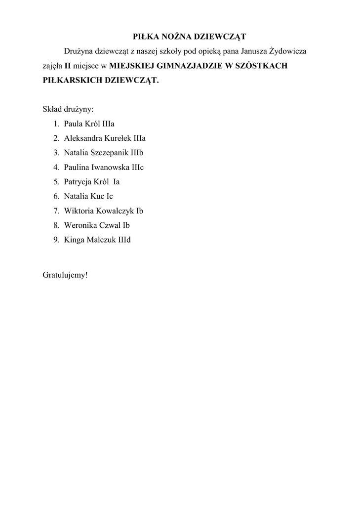 PIŁKA NOŻNA DZIEWCZĄT Drużyna dziewcząt z naszej szkoły pod opieką pana Janusza Żydowicza zajęła II miejsce w MIEJSKIEJ GIMNAZJADZIE W SZÓSTKACH PIŁKARSKICH DZIEWCZĄT. Skład drużyny: 1. Paula Król IIIa 2. Aleksandra Kurełek IIIa 3. Natalia Szczepanik IIIb 4. Paulina Iwanowska IIIc 5. Patrycja Król Ia 6. Natalia Kuc Ic 7. Wiktoria Kowalczyk Ib 8. Weronika Czwal Ib 9. Kinga Małczuk IIId Gratulujemy!