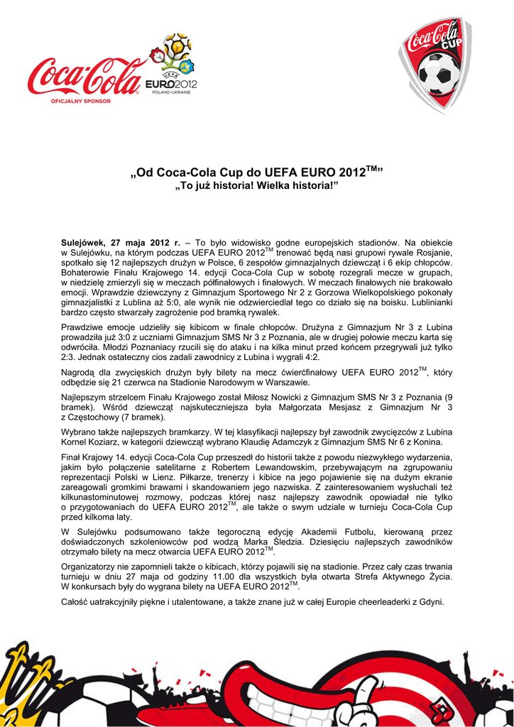 „Od Coca-Cola Cup do UEFA EURO 2012TM” „To już historia! Wielka historia!” Sulejówek, 27 maja 2012 r. – To było widowisko godne europejskich stadionów. Na obiekcie w Sulejówku, na którym podczas UEFA EURO 2012TM trenować będą nasi grupowi rywale Rosjanie, spotkało się 12 najlepszych drużyn w Polsce, 6 zespołów gimnazjalnych dziewcząt i 6 ekip chłopców. Bohaterowie Finału Krajowego 14. edycji Coca-Cola Cup w sobotę rozegrali mecze w grupach, w niedzielę zmierzyli się w meczach półfinałowych i finałowych. W meczach finałowych nie brakowało emocji. Wprawdzie dziewczyny z Gimnazjum Sportowego Nr 2 z Gorzowa Wielkopolskiego pokonały gimnazjalistki z Lublina aż 5:0, ale wynik nie odzwierciedlał tego co działo się na boisku. Lublinianki bardzo często stwarzały zagrożenie pod bramką rywalek. Prawdziwe emocje udzieliły się kibicom w finale chłopców. Drużyna z Gimnazjum Nr 3 z Lubina prowadziła już 3:0 z uczniami Gimnazjum SMS Nr 3 z Poznania, ale w drugiej połowie meczu karta się odwróciła. Młodzi Poznaniacy rzucili się do ataku i na kilka minut przed końcem przegrywali już tylko 2:3. Jednak ostateczny cios zadali zawodnicy z Lubina i wygrali 4:2. Nagrodą dla zwycięskich drużyn były bilety na mecz ćwierćfinałowy UEFA EURO 2012TM, który odbędzie się 21 czerwca na Stadionie Narodowym w Warszawie. Najlepszym strzelcem Finału Krajowego został Miłosz Nowicki z Gimnazjum SMS Nr 3 z Poznania (9 bramek). Wśród dziewcząt najskuteczniejsza była Małgorzata Mesjasz z Gimnazjum Nr 3 z Częstochowy (7 bramek). Wybrano także najlepszych bramkarzy. W tej klasyfikacji najlepszy był zawodnik zwycięzców z Lubina Kornel Koziarz, w kategorii dziewcząt wybrano Klaudię Adamczyk z Gimnazjum SMS Nr 6 z Konina. Finał Krajowy 14. edycji Coca-Cola Cup przeszedł do historii także z powodu niezwykłego wydarzenia, jakim było połączenie satelitarne z Robertem Lewandowskim, przebywającym na zgrupowaniu reprezentacji Polski w Lienz. Piłkarze, trenerzy i kibice na jego pojawienie się na dużym ekranie zareagowali gromkimi brawami i skandowaniem jego nazwiska. Z zainteresowaniem wysłuchali też kilkunastominutowej rozmowy, podczas której nasz najlepszy zawodnik opowiadał nie tylko o przygotowaniach do UEFA EURO 2012TM, ale także o swym udziale w turnieju Coca-Cola Cup przed kilkoma laty. W Sulejówku podsumowano także tegoroczną edycję Akademii Futbolu, kierowaną przez doświadczonych szkoleniowców pod wodzą Marka Śledzia. Dziesięciu najlepszych zawodników otrzymało bilety na mecz otwarcia UEFA EURO 2012TM. Organizatorzy nie zapomnieli także o kibicach, którzy pojawili się na stadionie. Przez cały czas trwania turnieju w dniu 27 maja od godziny 11.00 dla wszystkich była otwarta Strefa Aktywnego Życia. W konkursach były do wygrana bilety na UEFA EURO 2012TM. Całość uatrakcyjniły piękne i utalentowane, a także znane już w całej Europie cheerleaderki z Gdyni. Turniej Coca-Cola Cup 2012 był objęty honorowym patronatem przez Ministerstwo Sportu i Turystyki, Ministerstwo Edukacji Narodowej oraz Szkolny Związek Sportowy. Partnerem technicznym turnieju była firma adidas. Partnerem mediowym turnieju była telewizja TVN, radio Eska, dziennik Gazeta Wyborcza, portal sport.pl oraz magazyn BravoSport. WYNIKI FINAŁÓW: - kategoria dziewcząt Gimnazjum Nr 5 Lublin – Gimnazjum Sportowe Nr 2 Gorzów Wielkopolski 0:5 - kategoria chłopców Gimnazjum Nr 3 Lubin – Gimnazjum SMS Nr 3 Poznań 4:2 ZWYCIĘZCY AKADEMII FUTBOLU: 1. 2. 3. 4. 5. 6. 7. 8. 9. 10. Przemysław Kucharski (Gimnazjum Oleśnica) Damian Roszczyk (Gimnazjum Nr 3 Poznań) Oktawian Skrzecz (Gimnazjum Nr 29 Gdańsk) Daniel Miler (Gimnazjum Nr 2 Siedlce) Jakub Kosior (Gimnazjum Nowogrodziec) Jakub Łukowski (Gimnazjum Nr 10 Bydgoszcz) Michał Kozik (Gimnazjum Nr 1 Skawina) Adam Zawierucha (Gimnazjum Nr 10 Kielce) Damian Osiak (Gimnazjum Nr 16 Lublin) Kornel Koziarz (Gimnazjum Nr 3 Lubin) - bramkarz Więcej o 14 edycji turnieju Coca-Cola Cup na stronie www.cocacolacup.pl. O zaangażowaniu Coca-Cola w futbol: Firmy z systemu Coca-Cola są związane z piłką nożną od ponad 80 lat, a dokładniej od Mistrzostw Świata FIFA w Urugwaju w 1930 r. Coca-Cola jest też najstarszym partnerem korporacyjnym FIFA, z którą współpracuje od 1974. Od 1988 roku Coca-Cola współpracuje też UEFA jako Oficjalny Sponsor Mistrzostw Europy. Coca-Cola angażuje się w futbol na każdym poziomie. Poza TM sponsorowaniem największych imprez piłkarskich, jak Mistrzostwa Świata czy UEFA EURO , Coca-Cola realizuje w ponad 100 krajach liczne turnieje piłkarskie dla młodzieży, w tym Coca-Cola Cup. O firmach systemu Coca-Cola w Polsce: System Coca-Cola w Polsce reprezentują firmy Coca-Cola Poland Services Spółka z o.o. oraz Coca-Cola HBC Polska. CocaCola Poland Services to spółka-córka The Coca-Cola Company, właściciela wiodących marek napojów bezalkoholowych, obecnych w ponad 200 krajach świata. Coca-Cola HBC Polska to oddział Coca-Cola Hellenic Bottling Company, będącej pod względem sprzedaży drugim na świecie rozlewcą napojów The Coca-Cola Company, docierającym do ponad 560 milionów konsumentów. Wśród marek firm dostępnych na naszym rynku figurują: Coca-Cola, Coca-Cola light, Coca-Cola Zero, Cherry Coke, Fanta, Sprite, Lift, Kinley Tonic, napój izotoniczny Powerade, Powerade Zero, soki, nektary i napoje owocowe Cappy, wody mineralne Kropla Beskidu i Multivita z ujęcia Kropla Minerałów, napój energetyzujący Burn oraz herbaty mrożone Nestea. Firmy z systemu Coca-Cola są liderem na polskim rynku napojów bezalkoholowych i zatrudniają prawie 3 tysiące osób. Od 1991 r. firmy te zainwestowały w Polsce ponad 500 milionów dolarów. Więcej informacji udzielają: Anna Solarek Starszy specjalista ds. komunikacji i kontaktów zewnętrznych Coca-Cola Poland Services Sp. z o. o tel. (22) 579 68 87 email: [email protected] Dorota Kuligowska Biuro Praso