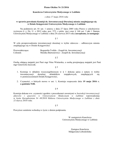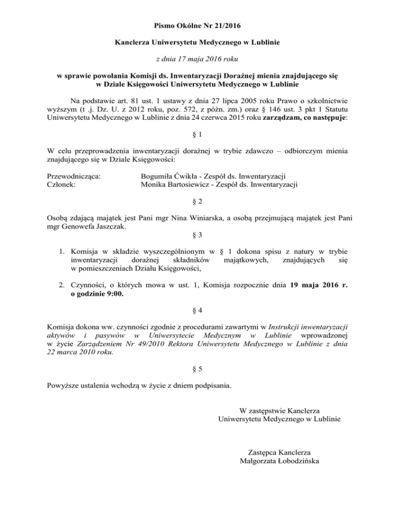 Pismo Okólne Nr 21/2016 Kanclerza Uniwersytetu Medycznego w Lublinie z dnia 17 maja 2016 roku w sprawie powołania Komisji ds. Inwentaryzacji Doraźnej mienia znajdującego się w Dziale Księgowości Uniwersytetu Medycznego w Lublinie Na podstawie art. 81 ust. 1 ustawy z dnia 27 lipca 2005 roku Prawo o szkolnictwie wyższym (t .j. Dz. U. z 2012 roku, poz. 572, z późn. zm.) oraz § 146 ust. 3 pkt 1 Statutu Uniwersytetu Medycznego w Lublinie z dnia 24 czerwca 2015 roku zarządzam, co następuje: §1 W celu przeprowadzenia inwentaryzacji doraźnej w trybie zdawczo – odbiorczym mienia znajdującego się w Dziale Księgowości: Przewodnicząca: Członek: Bogumiła Ćwikła - Zespół ds. Inwentaryzacji Monika Bartosiewicz - Zespół ds. Inwentaryzacji §2 Osobą zdającą majątek jest Pani mgr Nina Winiarska, a osobą przejmującą majątek jest Pani mgr Genowefa Jaszczak. §3 1. Komisja w składzie wyszczególnionym w § 1 dokona spisu z natury w trybie inwentaryzacji doraźnej składników majątkowych, znajdujących się w pomieszczeniach Działu Księgowości, 2. Czynności, o których mowa w ust. 1, Komisja rozpocznie dnia 19 maja 2016 r. o godzinie 9:00. §4 Komisja dokona ww. czynności zgodnie z procedurami zawartymi w Instrukcji inwentaryzacji aktywów i pasywów w Uniwersytecie Medycznym w Lublinie wprowadzonej w życie Zarządzeniem Nr 49/2010 Rektora Uniwersytetu Medycznego w Lublinie z dnia 22 marca 2010 roku. §5 Powyższe ustalenia wchodzą w życie z dniem podpisania. W zastępstwie Kanclerza Uniwersytetu Medycznego w Lublinie Zastępca Kanclerza Małgorzata Łobodzińska
