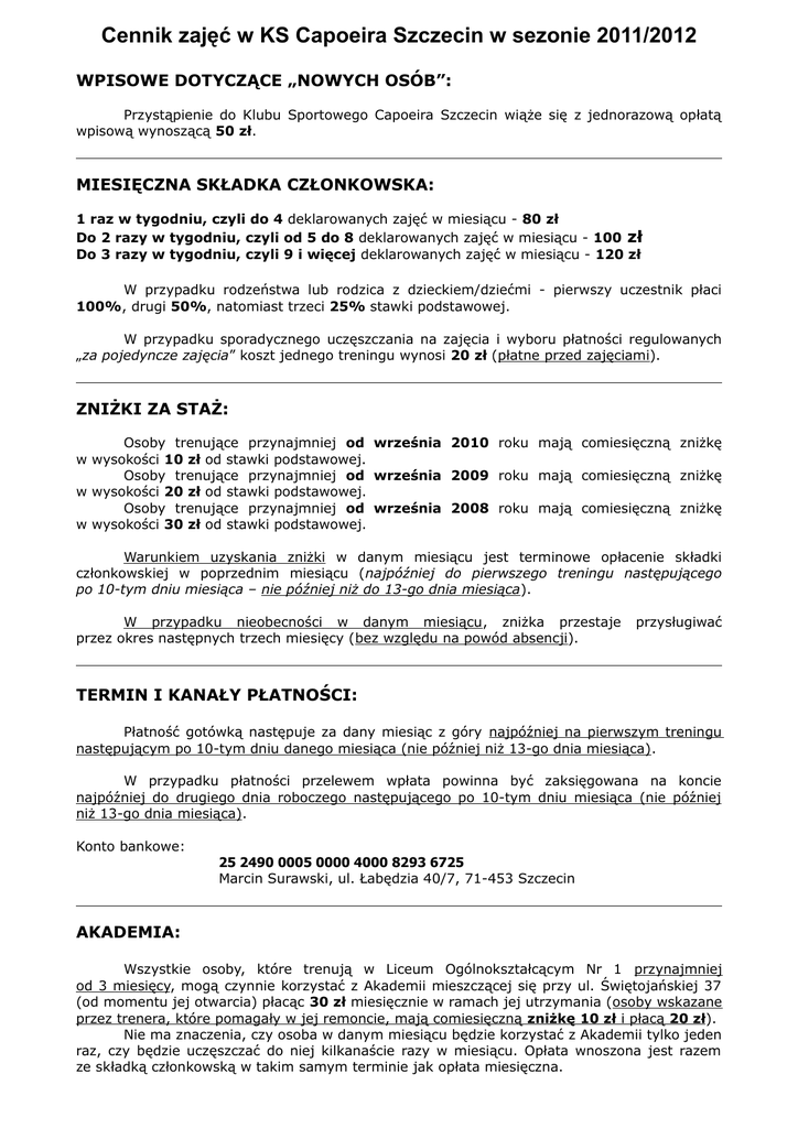 Cennik zajęć w KS Capoeira Szczecin w sezonie 2011/2012 WPISOWE DOTYCZĄCE „NOWYCH OSÓB”: Przystąpienie do Klubu Sportowego Capoeira Szczecin wiąże się z jednorazową opłatą wpisową wynoszącą 50 zł. MIESIĘCZNA SKŁADKA CZŁONKOWSKA: 1 raz w tygodniu, czyli do 4 deklarowanych zajęć w miesiącu - 80 zł Do 2 razy w tygodniu, czyli od 5 do 8 deklarowanych zajęć w miesiącu - 100 zł Do 3 razy w tygodniu, czyli 9 i więcej deklarowanych zajęć w miesiącu - 120 zł W przypadku rodzeństwa lub rodzica z dzieckiem/dziećmi - pierwszy uczestnik płaci 100%, drugi 50%, natomiast trzeci 25% stawki podstawowej. W przypadku sporadycznego uczęszczania na zajęcia i wyboru płatności regulowanych „za pojedyncze zajęcia” koszt jednego treningu wynosi 20 zł (płatne przed zajęciami). ZNIŻKI ZA STAŻ: Osoby trenujące przynajmniej od września 2010 roku mają comiesięczną zniżkę w wysokości 10 zł od stawki podstawowej. Osoby trenujące przynajmniej od września 2009 roku mają comiesięczną zniżkę w wysokości 20 zł od stawki podstawowej. Osoby trenujące przynajmniej od września 2008 roku mają comiesięczną zniżkę w wysokości 30 zł od stawki podstawowej. Warunkiem uzyskania zniżki w danym miesiącu jest terminowe opłacenie składki członkowskiej w poprzednim miesiącu (najpóźniej do pierwszego treningu następującego po 10-tym dniu miesiąca – nie później niż do 13-go dnia miesiąca). W przypadku nieobecności w danym miesiącu, zniżka przestaje przez okres następnych trzech miesięcy (bez względu na powód absencji). przysługiwać TERMIN I KANAŁY PŁATNOŚCI: Płatność gotówką następuje za dany miesiąc z góry najpóźniej na pierwszym treningu następującym po 10-tym dniu danego miesiąca (nie później niż 13-go dnia miesiąca). W przypadku płatności przelewem wpłata powinna być zaksięgowana na koncie najpóźniej do drugiego dnia roboczego następującego po 10-tym dniu miesiąca (nie później niż 13-go dnia miesiąca). Konto bankowe: 25 2490 0005 0000 4000 8293 6725 Marcin Surawski, ul. Łabędzia 40/7, 71-453 Szczecin AKADEMIA: Wszystkie osoby, które trenują w Liceum Ogólnokształcącym Nr 1 przynajmniej od 3 miesięcy, mogą czynnie korzystać z Akademii mieszczącej się przy ul. Świętojańskiej 37 (od momentu jej otwarcia) płacąc 30 zł miesięcznie w ramach jej utrzymania (osoby wskazane przez trenera, które pomagały w jej remoncie, mają comiesięczną zniżkę 10 zł i płacą 20 zł). Nie ma znaczenia, czy osoba w danym miesiącu będzie korzystać z Akademii tylko jeden raz, czy będzie uczęszczać do niej kilkanaście razy w miesiącu. Opłata wnoszona jest razem ze składką członkowską w takim samym terminie jak opłata miesięczna.