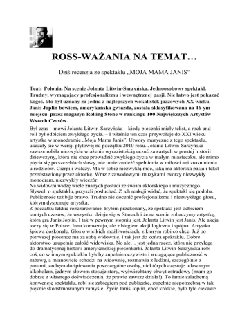 ROSS-WAŻANIA NA TEMAT… Dziś recenzja ze spektaklu „MOJA MAMA JANIS” Teatr Polonia. Na scenie Jolanta Litwin-Sarzyńska. Jednoosobowy spektakl. Trudny, wymagający profesjonalizmu i wewnętrznej pasji. Nie łatwo jest pokazać kogoś, kto był uznany za jedną z najlepszych wokalistek jazzowych XX wieku. Janis Joplin bowiem, amerykańska gwiazda, została sklasyfikowana na 46-ym miejscu przez magazyn Rolling Stone w rankingu 100 Największych Artystów Wszech Czasów. Był czas – mówi Jolanta Litwin-Sarzyńska – kiedy piosenki miały tekst, a rock and roll był odbiciem zwykłego życia. – I właśnie ten czas przywołuje do XXI wieku artystka w monodramie „Moja Mama Janis”. Utwory muzyczne z tego spektaklu, ukazały się w wersji płytowej na początku 2010 roku. Jolanta Litwin-Sarzyńska zawsze robiła niezwykłe wrażenie wyrazistością uczuć zawartych w prostej historii dziewczyny, która nie chce prowadzić zwykłego życia w małym miasteczku, ale mimo pięcia się po szczeblach sławy, nie umie znaleźć spełnienia w miłości ani zrozumienia u rodziców. Cierpi i walczy. Ma w sobie niezwykłą moc, jaką ma aktorska pasja i tekst przedstawiony przez aktorkę. Wraz z zawodowymi muzykami tworzy niezwykły monodram, niezwykły wieczór. Na widowni widzę wiele znanych postaci ze świata aktorskiego i muzycznego. Słyszeli o spektaklu, przyszli posłuchać. Z ich reakcji widać, że spektakl się podoba. Publiczność też bije brawo. Trudno nie docenić profesjonalizmu i niezwykłego głosu, którym dysponuje artystka. Z początku lekkie rozczarowanie. Byłem przekonany, że spektakl jest odbiciem tamtych czasów, że wszystko dzieje się w Stanach i że na scenie zobaczymy artystkę, która gra Janis Joplin. I tak w pewnym stopniu jest. Jolanta Litwin jest Janis. Ale akcja toczy się w Polsce. Inna konwencja, ale z biegiem akcji logiczna i spójna. Artystka śpiewa doskonale. Głos o wielkich możliwościach, z którym robi co chce. Już po pierwszej piosence ma za sobą widownię. I tak jest do końca spektaklu. Dobre aktorstwo uzupełnia całość widowiska. No ale… jest jedna rzecz, która nie przylega do dramatycznej historii amerykańskiej piosenkarki. Jolanta Litwin-Sarzyńska robi coś, co w innym spektaklu byłoby zupełnie oczywiste i wciągające publiczność w zabawę, a mianowicie schodzi na widownię, rozmawia z ludźmi, szczególnie z panami, zachęca do śpiewania poszczególne osoby, niektórych częstuje udawanym alkoholem, jednym słowem stosuje stary, wyświechtany chwyt estradowy (znam go dobrze z własnego doświadczenia, że prawie zawsze działa!). To łamie szlachetną konwencję spektaklu, robi się zabiegiem pod publiczkę, zupełnie niepotrzebną w tak pięknie skonstruowanym zamyśle. Życie Janis Joplin, choć krótkie, było tyle ciekawe co dramatyczne. Spektakl o tak wielkim ładunku prawdziwej emocji i szczerego zaangażowania, powinien być spójny od początku do końca. Bieganie po widowni jest w tym wypadku czymś sztucznym i tanim. Ale być może to tylko czepianie się starego wygi, któremu marzy się ideał. Tak czy inaczej, jeśli ktoś chce jeszcze zobaczyć dobre rzemiosło, warto iść. Nawet dwa razy.
