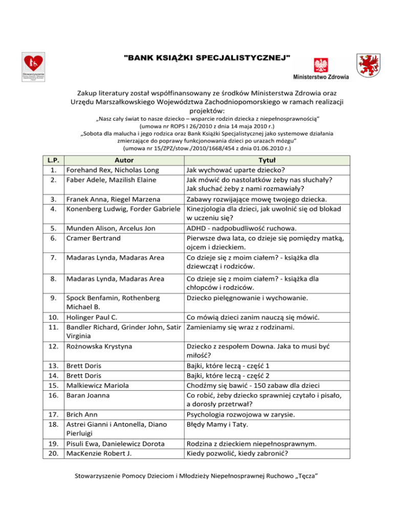 "BANK KSIĄśKI SPECJALISTYCZNEJ" Zakup literatury został współfinansowany ze środków Ministerstwa Zdrowia oraz Urzędu Marszałkowskiego Województwa Zachodniopomorskiego w ramach realizacji projektów: „Nasz cały świat to nasze dziecko – wsparcie rodzin dziecka z niepełnosprawnością” (umowa nr ROPS I 26/2010 z dnia 14 maja 2010 r.) „Sobota dla malucha i jego rodzica oraz Bank Książki Specjalistycznej jako systemowe działania zmierzające do poprawy funkcjonowania dzieci po urazach mózgu” (umowa nr 15/ZPZ/stow./2010/1668/454 z dnia 01.06.2010 r.) L.P. Autor 1. Forehand Rex, Nicholas Long 2. Faber Adele, Mazilish Elaine 3. 4. 5. 6. 7. 8. 9. Tytuł Jak wychować uparte dziecko? Jak mówić do nastolatków żeby nas słuchały? Jak słuchać żeby z nami rozmawiały? Franek Anna, Riegel Marzena Zabawy rozwijające mowę twojego dziecka. Konenberg Ludwig, Forder Gabriele Kinezjologia dla dzieci, jak uwolnić się od blokad w uczeniu się? Munden Alison, Arcelus Jon ADHD - nadpobudliwość ruchowa. Cramer Bertrand Pierwsze dwa lata, co dzieje się pomiędzy matką, ojcem i dzieckiem. Madaras Lynda, Madaras Area Co dzieje się z moim ciałem? - książka dla dziewcząt i rodziców. Madaras Lynda, Madaras Area Co dzieje się z moim ciałem? - książka dla chłopców i rodziców. Dziecko pielęgnowanie i wychowanie. Spock Benfamin, Rothenberg Michael B. 10. Holinger Paul C. Co mówią dzieci zanim nauczą się mówić. 11. Bandler Richard, Grinder John, Satir Zamieniamy się wraz z rodzinami. Virginia 12. Rożnowska Krystyna Dziecko z zespołem Downa. Jaka to musi być miłość? 13. Brett Doris Bajki, które leczą - część 1 14. Brett Doris Bajki, które leczą - część 2 15. Malkiewicz Mariola Chodźmy się bawić - 150 zabaw dla dzieci 16. Baran Joanna Co robić, żeby dziecko sprawniej czytało i pisało, a dorosły przetrwał? 17. Brich Ann Psychologia rozwojowa w zarysie. 18. Astrei Gianni i Antonella, Diano Błędy Mamy i Taty. Pierluigi 19. Pisuli Ewa, Danielewicz Dorota Rodzina z dzieckiem niepełnosprawnym. 20. MacKenzie Robert J. Kiedy pozwolić, kiedy zabronić? Stowarzyszenie Pomocy Dzieciom i Młodzieży Niepełnosprawnej Ruchowo „Tęcza” 21. MacGregor 22. Portmann Rosemarie 23. Koneberg Ludwig, Forder Gabriele 24. Pawlak Piotr 25. Podolska Beatrix 26. Zasępa Ewa 27. Groński Ryszard Marek 28. Orenstein Julian 29. Emmons Polly Edwin, Andreson Liz MacKendry 30. Sobolewska Anna 31. Konstanty Ignaciuk Barbara 32. 34. 35. 36. 37. 38. 39. 40. 41. 42. 43. 44. 45. 46. 47. 48. 49. Dobrej zabawy! Gry i zabawy dla pomysłowych rodzin. Gry i zabawy przeciwko agresji. Kinezjologia dla dzieci jak uwolnić się od blokad uczeniu się. Program profilaktyczno-terapeutyczny dla dzieci z zespołem nadpobudliwości psychoruchowej. Dźwięczne wiersze. Psychospołeczne funkcjonowanie osób z zespołem Downa. Po co właściwie trzymać psa? 365 porad dla rodziców Jak zapanować nad urwisem? Dzieci z zaburzeniami integracji sensorycznej. Cela - odpowiedź na zespół Downa. Dziecko z zespołem nadpobudliwości psychoruchowej ADHA i ADD. Cytowska Beata, Winczury Barbara, Dzieci chore, niepełnosprawne i z utrudnieniami Stawarski Andrzej w rozwoju. Maurer Alicja, Bołtuć Iwona Dzieci z zespołem Williamsa - diagnoza i terapia. Molicka Maria Bajkoterapia - o lękach dzieci i nowej metodzie terapii. Herbert Martin Kiedy dziecko i jego rodzice potrzebują pomocy. Pisula Ewa Małe dziecko z autyzmem. Kaczmarek Bogusława Beata Wspomaganie rozwoju dziecka z zespołem Downa - teoria i praktyka. Karaskova Vlasta Ćwiczymy w domu - ja i moje niepełnosprawne dziecko. Bakiera Lucyna Czy dorastanie musi być trudne? Obuchowska Irena Dzieci małe i duże - jak je kochać i rozumieć. Eisenberg Arlene, Murkoff Heidi E., Drugi i trzeci rok życia dziecka. Hathaway B.S.N. Sandee E. Kast-Zahn Annette, Morgenroth Każde dziecko może nauczyć się spać. Hartmut Kast-Zahn Annette Każde dziecko może nauczyć się reguł. Kast-Zahn Annette, Morgenroth Każde dziecko może jeść właściwie. Hartmut Skorek Ewa Małgorzata 100 tekstów do ćwiczeń logopedycznych. Renz-Polster Herbert, Menche Encyklopedia zdrowia dziecka. Nicloe, Schaffler Arne Silberg Jackie Gry i zabawy z maluchami. Silberg Jackie Gry i zabawy z niemowlakami. Stowarzyszenie Pomocy Dzieciom i Młodzieży Niepełnosprawnej Ruchowo „Tęcza” 50. Odowska-Szlachcic Bożenna 51. Obuchowska Irena 52. Włoch Agnieszka, Włoch Stanisław 53. 54. 55. 56. 57. 58. 59. 60. 61. 62. 63. 64. 65. 66. 67. 68. 69. 70. 71. 72. 73. 74. 75. 76. 77. 78. 79. 80. 81. Metoda integracji sensorycznej. Dzieci małe i duże - jak je kochać i rozumieć? Diagnoza całościowa w edukacji przedszkolnej i wczesnoszkolnej. Jegier Aneta Moje dziecko w przedszkolu. Koneberg Ludwig, Forder Gabriele Kinezjologia edukacyjna. Tarkowski Zbiegniew Jąkanie. Zajdel Krzysztof Wychowanie dziecka. Odowska-Szlachcic Bożenna Terapia integracji sensorycznej. Jankowiak-Siuda Kamila, Ciekawość świata o pamięci i twórczości małego Komorowska Marta dziecka. Kulczycika Ewa Wychowanie słuchowo-werbalne dziecka z wadą słuchu w wieku przedszkolnym. Jąder Mariola Krok… w kierunku kreatywności. Jegier Aneta Mądrze się bawię, dobrze się uczę. Pisuli Ewa, Danielewicz Dorota Rodzina z dzieckiem z niepełnosprawnością. Zakrzewska Barbara 3,2,1,0 … start czytanie treningowe. Jaroch-Połom Lucyna Bajeczki logopedyczne. Tońska-Mrowiec Anna Językowe przygody i inne bajeczki logopedyczne. Dąbrowska Regina Bezpiecznie przez życie czyli jak uczyć dziecko unikania zagrożeń. Tryzno Ewa Diagnoza edukacyjna dzieci 6-, 7- letnich rozpoczynających naukę. Faściszewska Maria Cienie logopedyczne. Tomczak Joanna Maluję, czytam i piszę. Kwiatkowska Małgorzata Zwyczajne towarzyszenie zamiast specjalnej troski. Kurcza-Wawrowska Ewa Zabawy na co dzień. Rudek Iwona Od niechęci do akceptacji. Stankowski Adam, Balukiewicz O trudnej sztuce bycia razem, czyli ró