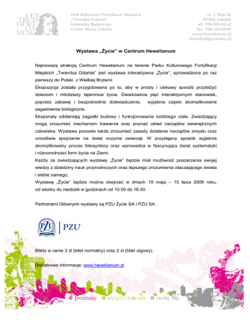 Wystawa „śycie” w Centrum Hewelianum Najnowszą atrakcją Centrum Hewelianum na terenie Parku Kulturowego Fortyfikacji Miejskich „Twierdza Gdańsk” jest wystawa interaktywna „śycie”, sprowadzona po raz pierwszy do Polski z Wielkiej Brytanii. Ekspozycja została przygotowana po to, aby w prosty i ciekawy sposób przybliŜyć dzieciom i młodzieŜy tajemnice Ŝycia. Dwadzieścia pięć interaktywnych stanowisk, poprzez zabawę i bezpośrednie doświadczenie, wyjaśnia często skomplikowane zagadnienia biologiczne. Eksponaty odsłaniają zagadki budowy i funkcjonowania ludzkiego ciała. Zwiedzający mogą zrozumieć mechanizm trawienia oraz poznać układ narządów wewnętrznych człowieka. Wystawa pozwala takŜe zrozumieć zasady działania narządów zmysłu oraz umoŜliwia spojrzenie na świat oczyma zwierząt. W przystępny sposób wyjaśnia skomplikowany proces fotosyntezy oraz wprowadza w fascynujący świat systematyki i róŜnorodności form Ŝycia na Ziemi. KaŜdy ze zwiedzających wystawę „śycie” będzie miał moŜliwość poszerzenia swojej wiedzy z dziedziny nauk przyrodniczych oraz lepszego zrozumienia otaczającego świata i siebie samego. Wystawę „śycie” będzie moŜna obejrzeć w dniach 19 maja – 15 lipca 2009 roku, od wtorku do niedzieli w godzinach od 10.00 do 18.00. Partnerami Głównymi wystawy są PZU śycie SA i PZU SA. Bilety w cenie 3 zł (bilet normalny) oraz 2 zł (bilet ulgowy). Dodatkowe informacje: www.hewelianum.pl