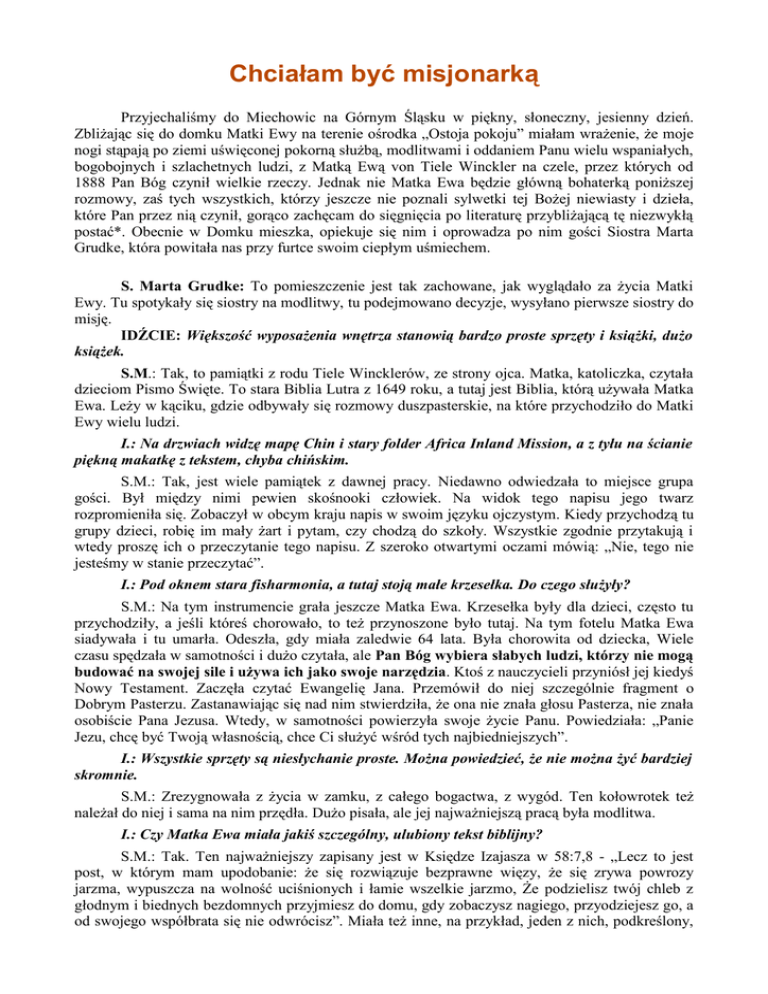 Chciałam być misjonarką Przyjechaliśmy do Miechowic na Górnym Śląsku w piękny, słoneczny, jesienny dzień. ZbliŜając się do domku Matki Ewy na terenie ośrodka „Ostoja pokoju” miałam wraŜenie, Ŝe moje nogi stąpają po ziemi uświęconej pokorną słuŜbą, modlitwami i oddaniem Panu wielu wspaniałych, bogobojnych i szlachetnych ludzi, z Matką Ewą von Tiele Winckler na czele, przez których od 1888 Pan Bóg czynił wielkie rzeczy. Jednak nie Matka Ewa będzie główną bohaterką poniŜszej rozmowy, zaś tych wszystkich, którzy jeszcze nie poznali sylwetki tej BoŜej niewiasty i dzieła, które Pan przez nią czynił, gorąco zachęcam do sięgnięcia po literaturę przybliŜającą tę niezwykłą postać*. Obecnie w Domku mieszka, opiekuje się nim i oprowadza po nim gości Siostra Marta Grudke, która powitała nas przy furtce swoim ciepłym uśmiechem. S. Marta Grudke: To pomieszczenie jest tak zachowane, jak wyglądało za Ŝycia Matki Ewy. Tu spotykały się siostry na modlitwy, tu podejmowano decyzje, wysyłano pierwsze siostry do misję. IDŹCIE: Większość wyposaŜenia wnętrza stanowią bardzo proste sprzęty i ksiąŜki, duŜo ksiąŜek. S.M.: Tak, to pamiątki z rodu Tiele Wincklerów, ze strony ojca. Matka, katoliczka, czytała dzieciom Pismo Święte. To stara Biblia Lutra z 1649 roku, a tutaj jest Biblia, którą uŜywała Matka Ewa. LeŜy w kąciku, gdzie odbywały się rozmowy duszpasterskie, na które przychodziło do Matki Ewy wielu ludzi. I.: Na drzwiach widzę mapę Chin i stary folder Africa Inland Mission, a z tyłu na ścianie piękną makatkę z tekstem, chyba chińskim. S.M.: Tak, jest wiele pamiątek z dawnej pracy. Niedawno odwiedzała to miejsce grupa gości. Był między nimi pewien skośnooki człowiek. Na widok tego napisu jego twarz rozpromieniła się. Zobaczył w obcym kraju napis w swoim języku ojczystym. Kiedy przychodzą tu grupy dzieci, robię im mały Ŝart i pytam, czy chodzą do szkoły. Wszystkie zgodnie przytakują i wtedy proszę ich o przeczytanie tego napisu. Z szeroko otwartymi oczami mówią: „Nie, tego nie jesteśmy w stanie przeczytać”. I.: Pod oknem stara fisharmonia, a tutaj stoją małe krzesełka. Do czego słuŜyły? S.M.: Na tym instrumencie grała jeszcze Matka Ewa. Krzesełka były dla dzieci, często tu przychodziły, a jeśli któreś chorowało, to teŜ przynoszone było tutaj. Na tym fotelu Matka Ewa siadywała i tu umarła. Odeszła, gdy miała zaledwie 64 lata. Była chorowita od dziecka, Wiele czasu spędzała w samotności i duŜo czytała, ale Pan Bóg wybiera słabych ludzi, którzy nie mogą budować na swojej sile i uŜywa ich jako swoje narzędzia. Ktoś z nauczycieli przyniósł jej kiedyś Nowy Testament. Zaczęła czytać Ewangelię Jana. Przemówił do niej szczególnie fragment o Dobrym Pasterzu. Zastanawiając się nad nim stwierdziła, Ŝe ona nie znała głosu Pasterza, nie znała osobiście Pana Jezusa. Wtedy, w samotności powierzyła swoje Ŝycie Panu. Powiedziała: „Panie Jezu, chcę być Twoją własnością, chce Ci słuŜyć wśród tych najbiedniejszych”. I.: Wszystkie sprzęty są niesłychanie proste. MoŜna powiedzieć, Ŝe nie moŜna Ŝyć bardziej skromnie. S.M.: Zrezygnowała z Ŝycia w zamku, z całego bogactwa, z wygód. Ten kołowrotek teŜ naleŜał do niej i sama na nim przędła. DuŜo pisała, ale jej najwaŜniejszą pracą była modlitwa. I.: Czy Matka Ewa miała jakiś szczególny, ulubiony tekst biblijny? S.M.: Tak. Ten najwaŜniejszy zapisany jest w Księdze Izajasza w 58:7,8 - „Lecz to jest post, w którym mam upodobanie: Ŝe się rozwiązuje bezprawne więzy, Ŝe się zrywa powrozy jarzma, wypuszcza na wolność uciśnionych i łamie wszelkie jarzmo, śe podzielisz twój chleb z głodnym i biednych bezdomnych przyjmiesz do domu, gdy zobaczysz nagiego, przyodziejesz go, a od swojego współbrata się nie odwrócisz”. Miała teŜ inne, na przykład, jeden z nich, podkreślony, odkryłam przypadkiem przeglądając niedawno jej Biblię. Posiadała kilka Biblii, jedną ktoś z bliskich wziął, ta leŜy tutaj, a jeszcze inna, to taka mała, którą otrzymała od pewnego misjonarza pracującego w Rosji. I.: Siostro Marto, cieszymy się, Ŝe w końcu mogliśmy zrealizować nasze marzenie i odwiedzić siostrę oraz to wyjątkowe miejsce. S.M.: JuŜ się z Panem targowałam, mówiłam Mu, Ŝe juŜ jestem do niczego, dlaczego mnie nie zabiera do Siebie, ale On ma, jak zawsze, swój plan. Ostatnio, w związku z obchodami rocznicowymi Bytomia zaczęli szukać ludzi, którzy się dla miasta zasłuŜyli. W związku z tym miałam tu tyle wycieczek, Ŝe nieraz nie miałam czasu zjeść obiadu. I.: Pozwolę sobie zadać bardziej osobiste pytanie. Co Siostrę skłoniło do osobistego poświęcenia się tej „pełnoetatowej” słuŜbie? S.M.: Ja jestem dzieckiem wojny. Urodziłam się 77 lat temu. (Dokładnie dzień wcześniej Siostra Marta świętowała swój jubileusz, od red.). Widziałam to wszystko, co się działo, choć miałam dopiero 10 lat. Po wojnie wiele kościołów ewangelickich zostało pozabieranych, a my zaczęliśmy tracić nasze poczucie przynaleŜności. Znalazłam pracę w szpitalu w Tomaszowie. Pracujące tam zakonnice próbowały mnie nawracać, głosząc, Ŝe jedynie zbawiającym kościołem jest kościół katolicki. Wtedy zaczęłam się pytać, gdzie jest prawda. W kuchni szpitalnej byłyśmy tylko we czwórkę i pracowałyśmy cięŜko od szóstej rano do dziesiątej wieczorem. Tylko jedną niedzielę w miesiącu miałyśmy wolną. Moi rodzice mieszkali koło Koluszek, a kościół był w Łodzi. Musiałam wybierać. Jak jechałam do kościoła, to zwykle zostawałam jeszcze na popołudniowe spotkanie młodzieŜowe. W szpitalu, przez naszą kuchnię przechodzili franciszkańscy zakonnicy. Jeden z nich często pytał mnie, kiedy przyjdę do spowiedzi. W końcu powiedziałam mu, Ŝe ja tam nie chodzę. „To masz sumienie czarne jak ko