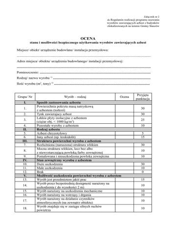 Załącznik nr 2 do Regulamin realizacji programu usuwania wyrobów zawierających azbest z budynków zlokalizowanych na terenie Gminy Staszów OCENA stanu i możliwości bezpiecznego użytkowania wyrobów zawierających azbest Miejsce/ obiekt/ urządzenie budowlane/ instalacja przemysłowa: ....................................................................................................................................................... Adres miejsca/ obiektu/ urządzenia budowlanego/ instalacji przemysłowej: ....................................................................................................................................................... Pomieszczenie: ............................................................................................................................. Rodzaj/ nazwa wyrobu 1) .............................................................................................................. Ilość wyrobu (m2, tony) 2) ............................................................................................................ Grupa/ Nr I. 1. 2. 3. 4. II. 5. 6. III. 7. 8. 9. IV. 10. 11. 12. V. 13. 14. 15. 16. 17. 18. Wyrób – rodzaj Ocena Sposób zastosowania azbestu Powierzchnia pokryta masą natryskową z azbestem (torkret) Tynk zawierajacy azbest Lekkie płyty izolacyjne z azbestem (ciężar obj. < 1000 kg/m3) Pozostałe wyroby z azbestem Rodzaj azbestu Azbest chryzotylowy Inny azbest (np. krokidolit) Struktura powierzchni wyrobu z azbestem Rozluźniona (naruszona) struktura włókien Mocna struktura włókien, lecz bez albo z niewystarczającą powłoką farby zewnętrznej Pomalowana i nieuszkodzona powłoka zewnętrzna Stan zewnętrzny wyrobu z azbestem Duże uszkodzenia Małe uszkodzenia Brak Możliwość uszkodzenia powierzchni wyrobu z azbestem Wyrób jest przedmiotem jakiś prac Wyrób przez bezpośrednią dostępność narażony na uszkodzenia ( do wysokości 2 m) Wyrób narażony na uszkodzenia mechaniczne Wyrób narażony na wstrząsy i drgania Wyrób narażony na działanie czynników atmosferycznych (na zewnątrz obiektu) Wyrób znajduje się w zasięgu silnych ruchów powietrza Przyjęta punktacja 30 30 25 10 5 15 30 10 10 30 10 0 15 10 10 10 10 10 19. Wyrób nie jest narażony na wpływy zewnętrzne VI. 20. Wykorzystanie pomieszczenia Regularnie przez dzieci, młodzież lub sportowców Trwałe lub częste przebywanie w pomieszczeniu innych osób Czasowo wykorzystywane pomieszczenie Rzadko wykorzystywane pomieszczenie Usytuowanie wyrobu Bezpośrednie w pomieszczeniu Za zawieszonym, nieszczelnym sufitem lub innym pokryciem W systemie wywietrzenia pomieszczenia (kanały wentylacyjne) Za zawieszonym szczelnym sufitem lub innym pokryciem, ponad pyłoszczelną powierzchnią lub poza szczelnym kanałem wentylacyjnym 21. 22. 23. VII. 24. 25. 26. 27. 0 Suma punktów z oceny 35 30 20 10 30 25 25 10 455 Stopień pilności ............... Stopień pilności I 65 i więcej punktów (wymiana lub naprawa wymagana bezzwłocznie) Stopień pilności II (ponowna ocena w czasie do I roku) powyżej 35 do 60 punktów Stopień pilności III (ponowna ocena w terminie do 5 lat) do 35 punktów …………………………….. Oceniający nazwisko i imię ……………………………………………. Właściciel / Zarządca Data ........................................ 1) Według klasyfikacji wyrobów przyjętych w sprawozdaniu rocznym - załącznik nr 2 do rozporządzenia Ministra Gospodarki, Pracy i Polityki Społecznej z dnia 23 października w sprawie wymagań w zakresie wykorzystania i przemieszczania azbestu oraz wykorzystania i oczyszczana instalacji lub urządzeń, w których był lub jest wykorzystywany azbest (Dz.U. Nr 192, poz. 1876) 2) Zgodnie z inwentaryzacją i sprawozdaniem rocznym - § 7 wymienionego w odnośniku 1 rozporządzenia 3) Duża uszkodzenia – widoczne pęknięcia lub ubytki na powierzchni równej lub większej niż 3% powierzchni wyrobu 4) Małe uszkodzenia – brak widocznych pęknięć, a ubytki na powierzchni mniejszej niż 3 % powierzchni wyrobu Przy określaniu rodzaju wyrobu zawierającego azbest należy stosować następującą klasyfikację: - płyty azbestowo-cementowe płaskie stosowane w budownictwie, - płyty faliste azbestowo-cementowe dla budownictwa, - rury i złącza azbestowo-cementowe, - izolacje natryskowe środkami zawierającymi w swoim składzie azbest, - wyroby cierne azbestowo-kauczukowe, - szczeliwa azbestowe, - wyroby azbestowo-kauczukowe, z wyjątkiem wyrobów ciernych, - inne wyroby zawierające azbest, oddzielnie niewymienione, w tym papier i tektura