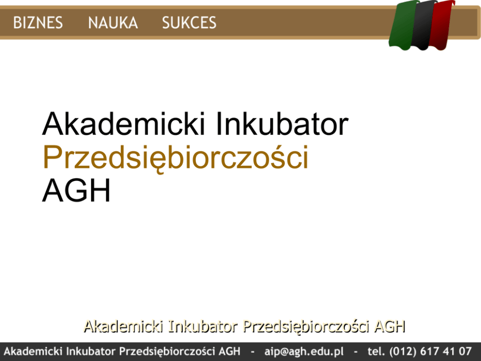 Akademicki Inkubator Przedsiębiorczości AGH Akademicki Inkubator Przedsiębiorczości AGH Cele działania • pomoc w tworzeniu przedsiębiorstw przez studentów, doktorantów, pracowników i absolwentów uczelni wyższych, w tym w oparciu o powstające innowacyjne technologie • wsparcie funkcjonowania tworzonych przedsiębiorstw do czasu stabilizacji ich pozycji rynkowej • promowanie przedsiębiorczości w środowisku akademickim • doradztwo i szkolenia dla potencjalnych przedsiębiorców Oferta Podstawowa forma wsparcia – inkubacja Adres siedziby firmy Udostępnienie skrytki adresowej Oferta • • • • • porady prawne prowadzenie księgowości wynajem pomieszczeń biurowych obsługa sekretarska dostęp do sprzętu biurowego (komputer, telefon, faks, ksero, rzutnik) • dostęp do sieci internetowej • w planach – wsparcie finansowe na starcie Uzasadnienie konieczności działania AIP • Wysokie koszty samodzielnego prowadzenia firmy • Zawiłe procedury związane z powołaniem i prowadzeniem działalności gospodarczej • Brak doświadczenia i wiedzy praktycznej jak prowadzić własna firmę. Jak do nas dołączyć Dziękujemy za uwagę Akademicki Inkubator Przedsiębiorczości AGH ul. Reymonta 17 30-059 Kraków Tel. 12 617 41 07 [email protected] Akademicki Inkubator Przedsiębiorczości AGH