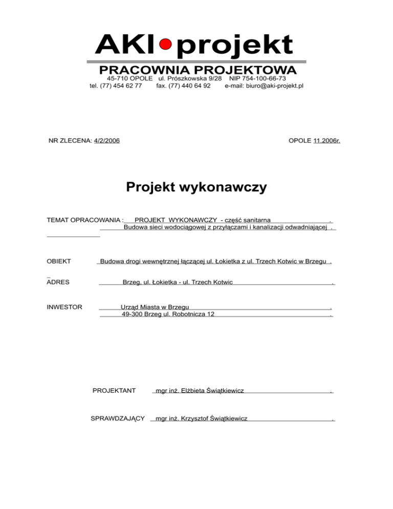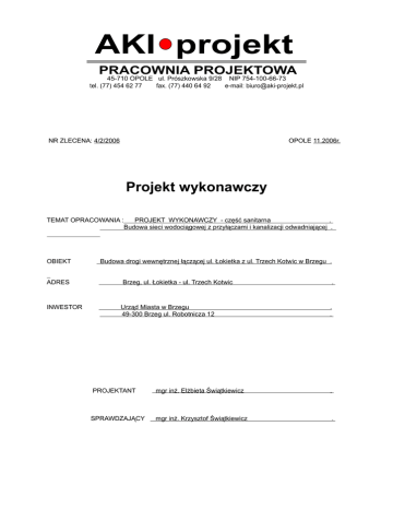 NR ZLECENA: 4/2/2006 OPOLE 11.2006r. Projekt wykonawczy TEMAT OPRACOWANIA : OBIEKT ADRES INWESTOR PROJEKT WYKONAWCZY - część sanitarna . Budowa sieci wodociągowej z przyłączami i kanalizacji odwadniającej . Budowa drogi wewnętrznej łączącej ul. Łokietka z ul. Trzech Kotwic w Brzegu . Brzeg, ul. Łokietka - ul. Trzech Kotwic Urząd Miasta w Brzegu 49-300 Brzeg ul. Robotnicza 12 . . . PROJEKTANT mgr inż. Elżbieta Świątkiewicz . SPRAWDZAJĄCY mgr inż. Krzysztof Świątkiewicz . Budowa drogi wewnętrznej łączącej ul. Łokietka z ul. Trzech Kotwic w Brzegu - budowa sieci wodociągowej z przyłączami i kanalizacji odwadniającej SPIS ZAWARTOŚCI OPRACOWANIA A. OPIS TECHNICZNY 1. Podstawa opracowania 2. Cel i zakres opracowania 3. Dane ogólne 4. Sieć wodociągowa z przyłączami 5. Kanalizacja odwadniająca 6. Regulacja istniejącego uzbrojenia 7. Zabezpieczenie sieci cieplnej 8. Technologia i organizacja robót 8.1. Kolejność robót 8.2. Roboty ziemne 8.3. Roboty montażowe 8.4. Obsypka przewodów i zasypka wykopów 8.5. Roboty zabezpieczające i pomocnicze 9. Uwagi końcowe Tabela nr 1 - zestawienie elementów wodociągu z przyłączami Tabela nr 2 -Zestawienie odbiorców wody-projektowana sieć wodociągowa z przyłączami B. UZGODNIENIA 1. Warunki techniczne podłączenia i zapewnienie odbioru ścieków deszczowych – pismo Przedsiębiorstwa Wodociągów i Kanalizacji w Brzegu sp. z o.o. nr TT/63/7223/2006 z dn. 26.10.2006 r. 2. Pismo Brzeskiego Przedsiębiorstwa Energetyki Cieplnej Sp. z o.o. w Brzegu nr TU/3601/11/2006 z dn. 08.11.2006 r. 3. Pismo Przedsiębiorstwa Wodociągów i Kanalizacji w Brzegu Sp. z o.o. nr TT/53/5852/06 z dn. 04.09.2006 r. 4. Pismo Górnośląskiej Spółki Gazownictwa Sp. z o.o. w Zabrzu, Oddział Gazowniczy w Opolu, Rozdzielnia Gazu w Brzegu nr TR2/502-873/2006 z dn. 02.11.2006 r 5. Uzgodnienie projektu przez Przedsiębiorstwo Wodociągów i Kanalizacji w Brzegu Sp. z o.o. nr TT/68/79872006 z dn. 24.11.2006 r 6. Opinia koordynacyjna G.I.7442-280/2006 Powiatowego Zespołu Uzgadniania Dokumentacji Projektowej w Brzegu z dn. 27.11.2006 r C. CZĘŚĆ RYSUNKOWA 1. Plan sytuacyjny – uzbrojenie zewnętrzne w skali 1: 500 2. Profil podłużny sieci wodociągowej Φ160 skala 1:100/500 3. Profil podłużny sieci wodociągowej Φ110 skala 1:100/500 4. Profil podłużny kanalizacji deszczowej skala 1:100/500 5. Schemat włączenia wpustów ulicznych 6. Schemat montażowy sieci wodociągowej z przyłączami 7. Blok oporowy łuk 11’ 8. Blok oporowy łuk 22’ 9. Blok oporowy łuk 45’ 10. Blok oporowy łuk 90’ 11. Blok oporowy hydrant 12. Blok oporowy trójnik 13. Blok oporowy zasuwa 14. Studzienka wodomierzowa Budowa drogi wewnętrznej łączącej ul. Łokietka z ul. Trzech Kotwic w Brzegu - budowa sieci wodociągowej z przyłączami i kanalizacji odwadniającej OPIS TECHNICZNY DO PROJEKTU WYKONAWCZEGO budowy SIECI WODOCIĄGOWEJ Z PRZYŁACZAMI i KANALIZACJI ODWADNIAJĄCEJ BUDOWA DROGI WEWNĘTRZNEJ łączącej ul. ŁOKIETKA i ul. TRZECH KOTWIC W BRZEGU 1. PODSTAWA OPRACOWANIA - Zlecenie Inwestora - Plan sytuacyjno-wysokościowy w skali 1:500 - Projekt budowy drogi wewnętrznej łączącej ul. Łokietka i ul. Trzech Kotwic w Brzegu opracowanie PROTOR Opole - Opis warunków geotechnicznych - opracowanie Usługi Geologiczne J. Gola Opole - Warunki techniczne podłączenia i zapewnienie dostawy wody i odbioru ścieków deszczowych wydane przez Przedsiębiorstwo Wodociągów i Kanalizacji w Brzegu sp. z o.o. nr .TT/63/7223/2006 z dn. 26.10.2006 r. - Wizja lokalna w terenie i uzgodnienie z odbiorcami wody - Obowiązujące przepisy i normy 2. CEL I ZAKRES OPRACOWANIA Celem opracowania jest sporządzenie projektu budowlano-wykonawczego część sanitarna budowy drogi wewnętrznej łączącej ul. Łokietka z ul. Trzech Kotwic w Brzegu. Zakres niniejszego opracowania obejmuje projekt sieci wodociągowej w pasie drogowym projektowanej drogi wraz z przyłączami, odprowadzenia wód deszczowych z jezdni i miejsc parkingowych do projektowanej kanalizacji opadowej, oraz zabezpieczenie sieci cieplnej i regulację rzędnych istniejącego uzbrojenia sieci wod-kan. 3. DANE OGÓLNE Projektowana droga wewnętrzna zlokalizowana jest w centrum miasta Brzeg na terenie dawnej Fabryki Silników Elektrycznych „BESEL” pomiędzy ulicami Łokietka i Trzech Kotwic. Ulice Łokietka, Trzech Kotwic oraz drogi wewnętrzne na terenie dawnego zakładu posiadają pełne uzbrojenie podziemne: sieć kanalizacji ogólnospławnej i deszczowej, lokalne sieci wodociągowe, gazowe i cieplne oraz uzbrojenie energetyczne i telekomunikacyjne. Z warunków geotechnicznych wynika, że podłoże stanowi warstwa nasypów niekontrolowanych o zróżnicowanej miąższości od ok. 0,8 do 2,5 m p.p.terenu. Z materiałów archiwalnych wynika, że pod gruntem nasypowym w tym rejonie miasta zalegają utwory czwartorzędowe ( gliny piaszczyste i pylaste oraz piaski grube i średnie ). Do wysokości wykonanych wierceń -2,5 m p.p.terenu nie stwierdzono występowania wody gruntowej. 4. SIEĆ WODOCIĄGOWA Z PRZYŁĄCZAMI Zgodnie z warunkami technicznymi zaprojektowano sieć wodociągową o średnicy Φ 160 PVC w pasie projektowanej drogi .Podłączenie do istniejącej miejskiej sieci wodociągowej Φ 150 żel-wod w ul. Trzech Kotwic zaprojektowano w formie trójnika zabudowanego na sieci wodociągowej z zastosowaniem złączy kołnierzowych ULTRA RANGE Φ 150. Powiązanie z siecią wodociągową w ul. Łokietka zaprojektowano do końcówki sieci Φ 160 PVC zaprojektowanej w ramach przebudowy stacji paliw PKN Orlen. Istniejący korek odciąć i przewód połączyć z projektowanym odcinkiem za pomocą nasuwki Φ 160. Projektowaną sieć prowadzić w projektowanej jezdni z uwagi na brak możliwości lokalizacji poza jezdnią. Dodatkowo wykonać odcinek spinający o średnicy Φ 110 PVC pomiędzy istniejącymi budynkami. Budowa drogi wewnętrznej łączącej ul. Łokietka z ul. Trzech Kotwic w Brzegu - bud