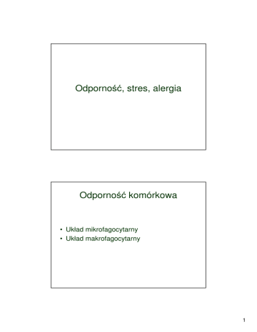 Odporność, stres, alergia Odporność komórkowa • Układ mikrofagocytarny • Układ makrofagocytarny 1 Układ mikrofagocytarny • Granulocyty obojętnochłonne • Granulocyty kwasochłonne • Granulocyty zasadochłonne Układ makrofagocytarny • Śródbłonek naczyń krwionośnych i chłonnych • Komórki splatające się miąższu śledziony i grudek chłonnych • Komórki welonowate węzłów chłonnych • Splenocyty (kom. miąższu śledziony) • Komórki dendrytyczne (Browicz-Kupfera) • Komórki naczyń zatokowych szpiku kostnego • Histiocyty • Monocyty/makrofagi • Komórki Langerhansa naskórka i nabłonków 2 Układ makrofagocytarny (siateczkowo-śródbłonkowy) Mikroglej Makrofagi węzłów chłonnych Makrofagi płucne Makrofagi tkankowe histiocyty Osteoklasty kości długich Makrofagi śledziony Komórki Kupfera Układ siateczkowośródbłonkowy • Komórki Browicz-Kupfera zabarwione drobinkami sfagocytowaneg o tuszu chińskiego 3 Układ siateczkowośródbłonkowy • Histiocyty (wolne makrofagi błon śluzowych i płuc) zabarwione sfagocytowanymi pyłami Układ siateczkowośródbłonkowy • Monocyty 4 Rola układu siateczkowośródbłonkowego • Hemosyderoza – nagromadzenie złogów żelaza w makrofagach wątroby po wielokrotnych przetoczeniach krwi Hemochromatoza • Hemochromatoza – choroba genetyczna powodująca ok. 50-krotne zwiększenie zapasów żelaza (wątroba, trzustka). Prowadzi do uszkodzenia narządów. 5 Rola układu makrofagocytarnego • Fagocytoza obumarłych komórek (własnych i obcych) • Wychwytywanie żelaza z obumarłych krwinek czerwonych • Tworzenie białek krwi • Udział w odporności przeciwzakaźnej • Neutralizacja toksyn Stres • Stan nacisku, obciążenia pod wpływem czynników środowiska • Jest warunkiem adaptacji. Głównym układem odpowiedzi stresowej u zwierząt jest układ limbiczny. Analizuje on rodzaj i siłę stresora uruchamiając mechanizmy adaptacyjne • Działanie korzystne – jeśli czas i siła działania nie przekracza możliwości fizjologicznej regulacji 6 Stres psychogenny • Aktywacja układu współczulnordzeniowonadnerczowego z wydzielaniam katecholamin (ok. 20s) pod wpływem obciążenia o charakterze psychicznym • Reakcja „walcz, lub uciekaj” • Trwa do 30 min. Stres somatyczny (fizjologiczny) • Uaktywnienie układu podwzgórzowoprzysadkowo-korowonadnerczowego (ACTH, kortykoidy – ok. 45-50 s) • Powstaje głównie pod wpływem czynników o charakterze fizycznym (zimno, zmęczenie) • Trwa od 30 min. do 4-5 h 7 Następstwa stresu • Natychmiastowe – Przekrwienie nadnerczy – Wzrost poziomu hormonów rdzenia nadnerczy – Wzrost poziomu glukozy i wolnych kwasów tłuszczowych – Zmiany w enzymatyce krwi – Przekrwienie i wybroczyny w części dennej żołądka Następstwa stresu • Oddalone w czasie – – – – – – – – – – – – – Przerost nadnerczy Owrzodzenia żołądka i dwunastnicy Spadek odporności Zanik grasicy i węzłów chłonnych Eozynopenia Nadciśnienie krwi Choroba niedokrwienna serca Zawał serca Cukrzyca Zaburzenia w rozrodzie Spadek poziomu gonadotropin Wzrost poziomu TSH i tyroksyny Nerwice i stereotypie 8 Alergia • Nadmierna wrażliwość układu immunologicznego na czynniki zewnętrzne i wewnętrzne o charakterze antygenowym • Jest reakcją immunologiczną i jest wywoływana czynnikami swoistymi • W alergii reakcja immunologiczna przebiega zawsze nieprawidłowo • Antygeny odpowiedzialne za wywoływanie alergii nazywa się alergenami Alergia • Dawka uczulająca alergenu – powoduje powstanie swoistych przeciwciał • Dawka wyzwalająca alergenu – powoduje reakcję alergiczną w wyniku nieprawidłowego wiązania przeciwciał z antygenem (alergenem) • Dochodzi do uwolnienia czynników o działaniu miejscowym lub ogólnym 9 Odczyn Arthusa • Kilkakrotne podanie podskórne lub sródskórne antygenu w odstępach kilkudniowych • Gromadzące się precypityny prowadzą do powstawania zakrzepów • Powstaje miejscowe, martwicowokrwotoczne zapalenie skóry Choroba posurowicza • Powstaje po podaniu dużej dawki surowicy odpornościowej • Przeciwciała pojawiają się kiedy w organizmie występują jeszcze resztki surowicy • Dawka uczulająca jest jednocześnie dawką wyzwalającą • Objawy powstają po 10-12 dniach od iniekcji surowicy • Zaczerwienienie skóry, wysypka, świąd, gorączka, zapalenie stawów, uszkodzenie kłębków nerkowych 10 Atopia • Spontaniczna nadwrażliwość o podłożu dziedzicznym • Reakcja alergiczna na pospolite substancje w otaczającym środowisku • Astma oskrzelowa, katar sienny, alergie pokarmowe, obrzęk Quinckego Anafilaksja • Uogólniona nadwrażliwość typu wczesnego pojawiająca się w krótkim czasie po dostaniu się antygenu (alergenu) do krwi uczulonego zwierzęcia. • Przebiega w postaci wstrząsu anafilaktycznego 11 Anafilaksja • Układ oddechowy – skurcz mm. oskrzelików i krtani powoduje duszność, rozedmę pęcherzyków płucnych, śmierć – Świnka morska, bydło, koń, człowiek • Układ krążenia – spadek ciśnienia krwi, zapaść – Świnia, królik • Układ pokarmowy – obrzęk wątroby, wyrzut żółci, przekrwienie bierne jelit, biegunki, zapaść – Pies Leczenie anafilaksji • Adrenalina – podnosi ciśnienie krwi, hamuje uwalnianie mediatorów, uszczelnia naczynia, hamuje skurcz oskrzeli, kurczy naczynia obwodowe • Glikokortykosterydy – działają przeciwobrzękowo • Płyny krwiozastępcze – zwiększaja objętość krwi 12 Odczulanie • Metoda Besredki – podanie małej dawki (0,1-0,5 ml) alergenu podskórnie • Metoda kroplówkowa – podanie pełnej dawki dożylnie bardzo powoli we wlewie kroplowym • Obie metody wywołują tzw. wstrząs poronny (mikrowstrząs) • Odczulenie trwa od kilku tygodni do kilku miesięcy Alergia 13 Anafilaksja • Obrzęk języka u człowieka we wstrząsie anafilaktyczn ym Anafilaksja
