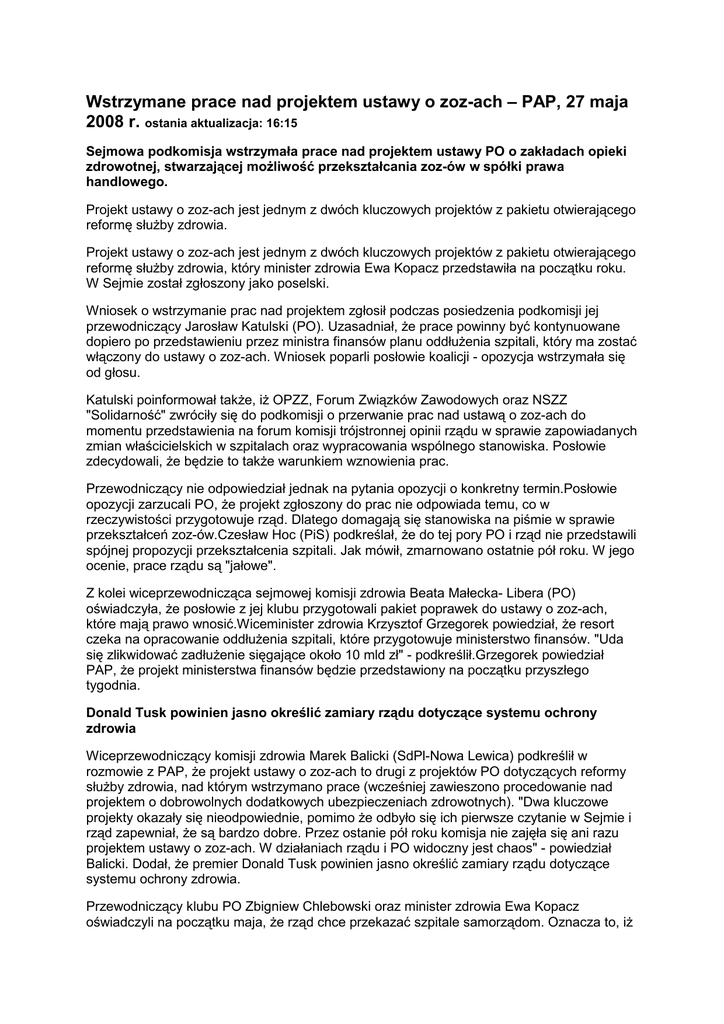 Wstrzymane prace nad projektem ustawy o zoz-ach – PAP, 27 maja 2008 r. ostania aktualizacja: 16:15 Sejmowa podkomisja wstrzymała prace nad projektem ustawy PO o zakładach opieki zdrowotnej, stwarzającej moŜliwość przekształcania zoz-ów w spółki prawa handlowego. Projekt ustawy o zoz-ach jest jednym z dwóch kluczowych projektów z pakietu otwierającego reformę słuŜby zdrowia. Projekt ustawy o zoz-ach jest jednym z dwóch kluczowych projektów z pakietu otwierającego reformę słuŜby zdrowia, który minister zdrowia Ewa Kopacz przedstawiła na początku roku. W Sejmie został zgłoszony jako poselski. Wniosek o wstrzymanie prac nad projektem zgłosił podczas posiedzenia podkomisji jej przewodniczący Jarosław Katulski (PO). Uzasadniał, Ŝe prace powinny być kontynuowane dopiero po przedstawieniu przez ministra finansów planu oddłuŜenia szpitali, który ma zostać włączony do ustawy o zoz-ach. Wniosek poparli posłowie koalicji - opozycja wstrzymała się od głosu. Katulski poinformował takŜe, iŜ OPZZ, Forum Związków Zawodowych oraz NSZZ "Solidarność" zwróciły się do podkomisji o przerwanie prac nad ustawą o zoz-ach do momentu przedstawienia na forum komisji trójstronnej opinii rządu w sprawie zapowiadanych zmian właścicielskich w szpitalach oraz wypracowania wspólnego stanowiska. Posłowie zdecydowali, Ŝe będzie to takŜe warunkiem wznowienia prac. Przewodniczący nie odpowiedział jednak na pytania opozycji o konkretny termin.Posłowie opozycji zarzucali PO, Ŝe projekt zgłoszony do prac nie odpowiada temu, co w rzeczywistości przygotowuje rząd. Dlatego domagają się stanowiska na piśmie w sprawie przekształceń zoz-ów.Czesław Hoc (PiS) podkreślał, Ŝe do tej pory PO i rząd nie przedstawili spójnej propozycji przekształcenia szpitali. Jak mówił, zmarnowano ostatnie pół roku. W jego ocenie, prace rządu są "jałowe". Z kolei wiceprzewodnicząca sejmowej komisji zdrowia Beata Małecka- Libera (PO) oświadczyła, Ŝe posłowie z jej klubu przygotowali pakiet poprawek do ustawy o zoz-ach, które mają prawo wnosić.Wiceminister zdrowia Krzysztof Grzegorek powiedział, Ŝe resort czeka na opracowanie oddłuŜenia szpitali, które przygotowuje ministerstwo finansów. "Uda się zlikwidować zadłuŜenie sięgające około 10 mld zł" - podkreślił.Grzegorek powiedział PAP, Ŝe projekt ministerstwa finansów będzie przedstawiony na początku przyszłego tygodnia. Donald Tusk powinien jasno określić zamiary rządu dotyczące systemu ochrony zdrowia Wiceprzewodniczący komisji zdrowia Marek Balicki (SdPl-Nowa Lewica) podkreślił w rozmowie z PAP, Ŝe projekt ustawy o zoz-ach to drugi z projektów PO dotyczących reformy słuŜby zdrowia, nad którym wstrzymano prace (wcześniej zawieszono procedowanie nad projektem o dobrowolnych dodatkowych ubezpieczeniach zdrowotnych). "Dwa kluczowe projekty okazały się nieodpowiednie, pomimo Ŝe odbyło się ich pierwsze czytanie w Sejmie i rząd zapewniał, Ŝe są bardzo dobre. Przez ostanie pół roku komisja nie zajęła się ani razu projektem ustawy o zoz-ach. W działaniach rządu i PO widoczny jest chaos" - powiedział Balicki. Dodał, Ŝe premier Donald Tusk powinien jasno określić zamiary rządu dotyczące systemu ochrony zdrowia. Przewodniczący klubu PO Zbigniew Chlebowski oraz minister zdrowia Ewa Kopacz oświadczyli na początku maja, Ŝe rząd chce przekazać szpitale samorządom. Oznacza to, iŜ samorządy otrzymają 100 proc. kapitału zakładowego. W projekcie ustawy, który trafił do komisji zdrowia, była mowa o 51 proc.Projekt ustawy o zoz-ach stwarza moŜliwość przekształcana ich w spółki prawa handlowego z ograniczoną odpowiedzialnością, bądź spółkę akcyjną (do tej pory było to moŜliwe, ale dopiero po likwidacji placówki).Warunki przekształcenia to m.in. kapitał zakładowy spółki- szpitala w wysokości co najmniej 5 mln zł oraz odpowiedzialność organu załoŜycielskiego spółki za jej długi. Projekt zawiera zapisy mówiące o odpowiedzialności zoz-ów za szkody wyrządzone przy udzielaniu świadczeń zdrowotnych Projekt zawiera zapisy mówiące o odpowiedzialności zoz-ów za szkody wyrządzone przy udzielaniu świadczeń zdrowotnych i nakłada na placówki obowiązek ubezpieczenia się od takich przypadków.Podstawy gospodarki zoz-u to plan finansowy i załoŜenie, Ŝe ujemny wynik finansowy placówki pokrywa jej organ załoŜycielski. W takiej sytuacji załoŜyciel moŜe teŜ zdecydować o zmianie formy zakładu lub jego likwidacji. Źródło: PAP Za oddłuŜenie szpitali zapłaci budŜet państwa – Gazeta Prawna, 28 maja 2008 r. Ministerstwo Finansów nie zgadza się na przekształcenie długów szpitali w długoletnie obligacje. Rząd rezygnuje z ograniczeń dotyczących udziałów samorządów terytorialnych w szpitalach-spółkach. Samorządy będą mogły samodzielnie decydować o sprzedaŜy udziałów w spółkach prawa handlowego. Gwarancją skutecznego oddłuŜenia szpitali ma być wprowadzenie obowiązkowego przekształcania szpitali w spółki prawa handlowego NOWOŚĆ W przyszłym tygodniu rząd ma przedstawić zasady oddłuŜenia publicznych szpitali. Jak dowiedziała się GP, Ministerstwo Finansów rozwaŜa kilka wariantów. Jednym z nich jest wykupienie długów szpitali przez wybrany bank i obciąŜenie tym budŜetu państwa. Wcześniejsza propozycja resortu zdrowia zakładająca zamianę długów szpitali na obligacje Skarbu Państwa nie zyskała akceptacji. Gwarancją skutecznego oddłuŜenia szpitali ma być wprowadzenie obowiązkowego przekształcania szpitali w spółki prawa handlowego. Taką poprawkę do projektu ustawy o zakładach opieki zdrowotnej złoŜą posłowie PO. Z projektu ustawy zostanie teŜ usunięty przepis określający limity udziałów samorządów w spółkach. Dzięki temu samorządy będą miały zielone światło na prywatyzację podległych im placówek. Obligacje czy kredyt - Ministerstwo 