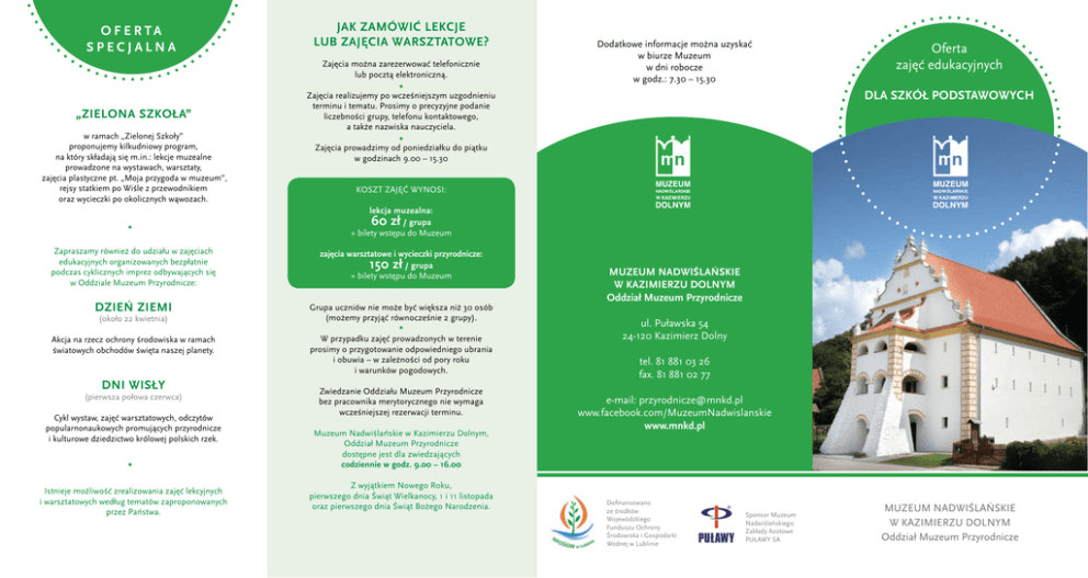 O F E R TA SPEC J ALNA JAK ZAMÓWIĆ LEKCJE LUB ZAJĘCIA WARSZTATOWE? Zajęcia można zarezerwować telefonicznie lub pocztą elektroniczną. „Zielona Szkoła” w ramach „Zielonej Szkoły” proponujemy kilkudniowy program, na który składają się m.in.: lekcje muzealne prowadzone na wystawach, warsztaty, zajęcia plastyczne pt. „Moja przygoda w muzeum”, rejsy statkiem po Wiśle z przewodnikiem oraz wycieczki po okolicznych wąwozach. Dodatkowe informacje można uzyskać w biurze Muzeum w dni robocze w godz.: 7.30 – 15.30 Oferta zajęć edukacyjnych dla szkół podstawowych Zajęcia realizujemy po wcześniejszym uzgodnieniu terminu i tematu. Prosimy o precyzyjne podanie liczebności grupy, telefonu kontaktowego, a także nazwiska nauczyciela. Zajęcia prowadzimy od poniedziałku do piątku w godzinach 9.00 – 15.30 Koszt zajęć wynosi: lekcja muzealna: 60 zł / grupa + bilety wstępu do Muzeum Zapraszamy również do udziału w zajęciach edukacyjnych organizowanych bezpłatnie podczas cyklicznych imprez odbywających się w Oddziale Muzeum Przyrodnicze: zajęcia warsztatowe i wycieczki przyrodnicze: 150 zł / grupa + bilety wstępu do Muzeum Dzień Ziemi Grupa uczniów nie może być większa niż 30 osób (możemy przyjąć równocześnie 2 grupy). (około 22 kwietnia) Akcja na rzecz ochrony środowiska w ramach światowych obchodów święta naszej planety. Dni Wisły (pierwsza połowa czerwca) Cykl wystaw, zajęć warsztatowych, odczytów popularnonaukowych promujących przyrodnicze i kulturowe dziedzictwo królowej polskich rzek. Istnieje możliwość zrealizowania zajęć lekcyjnych i warsztatowych według tematów zaproponowanych przez Państwa. W przypadku zajęć prowadzonych w terenie prosimy o przygotowanie odpowiedniego ubrania i obuwia – w zależności od pory roku i warunków pogodowych. Zwiedzanie Oddziału Muzeum Przyrodnicze bez pracownika merytorycznego nie wymaga wcześniejszej rezerwacji terminu. Muzeum Nadwiślańskie w Kazimierzu Dolnym, Oddział Muzeum Przyrodnicze dostępne jest dla zwiedzających codziennie w godz. 9.00 – 16.00 Z wyjątkiem Nowego Roku, pierwszego dnia Świąt Wielkanocy, 1 i 11 listopada oraz pierwszego dnia Świąt Bożego Narodzenia. Muzeum Nadwiślańskie w Kazimierzu Dolnym Oddział Muzeum Przyrodnicze ul. Puławska 54 24-120 Kazimierz Dolny tel. 81 881 03 26 fax. 81 881 02 77 e-mail: [email protected] www.facebook.com/MuzeumNadwislanskie www.mnkd.pl Dofinansowano ze środków Wojewódzkiego Funduszu Ochrony Środowiska i Gospodarki Wodnej w Lublinie Sponsor Muzeum Nadwiślańskiego: Zakłady Azotowe PUŁAWY SA Muzeum Nadwiślańskie w Kazimierzu Dolnym Oddział Muzeum Przyrodnicze Lekcje muzealne Zajęcia warsztatowe Moja przygoda w muzeum – zajęcia przeznaczone dla dzieci, które po raz pierwszy odwiedzających nasze muzeum. Uczniowie poznają historię Spichlerza, a następnie z przewodnikiem zwiedzają prezentowane ekspozycje. Połów wiślanych ryb – wybieramy się na wędkowanie, ale nie każdy może złowić rybę. Najpierw trzeba wykazać się wiedzą, potem zręcznością, a na koniec, po udanym wędkowaniu, uruchomić zdolności plastyczne. Tematyka zajęć dotyczy ogólnych wiadomości na temat Wisły oraz rozpoznawania podstawowych gatunków ryb żyjących w tej rzece. czas trwania ok. 1 godz. W Kazimierskim Parku Krajobrazowym – uczniowie zapoznają się z formami ochrony przyrody w Polsce, poznają walory przyrodnicze, krajobrazowe i kulturowe Kazimierskiego Parku Krajobrazowego. Jak powstały wąwozy? – zajęcia przeznaczone dla klas IV-VI szkół podstawowych. Uczniowie dowiadują się, co to takiego less, wąwóz naturalny i głębocznica, a także wykonują proste doświadczenia. Tajemnice wymarłego świata – zajęcia poświęcone organizmom żyjącym w kredowym morzu 65 mln lat temu. Uczniowie dowiadują się, w jaki sposób powstają skamieniałości, uczą się rozpoznawać poszczególne grupy organizmów. Nasze drzewa i krzewy – uczniowie poznają różne formy roślinności (drzewiaste, krzewiaste, zielne). Zaznajamiają się z podstawowymi gatunkami drzew i krzewów spotykanymi na terenie Kazimierskiego Parku Krajobrazowego, ich biologią i znaczeniem gospodarczym. Płynie Wisła, płynie… – zajęcia na temat naszej największej rzeki. Uczniowie poznają budowę doliny rzecznej, a także bogactwo przyrodnicze Małopolskiego Przełomu Wisły. Istnieje możliwość przygotowania kart pracy z zadaniami dla uczniów do każdego tematu proponowanych zajęć. Wycieczki przyrodnicze czas trwania ok. 2,5 godz. – 4 godz. W poszukiwaniu skarbu Mikołaja Przybyły – zabawa w podchody połączona z zajęciami plastycznymi. Warsztaty rozpoczynają się od zwiedzenia z przewodnikiem Muzeum. Tematyka warsztatów może dotyczyć fauny, flory a także osobliwości przyrodniczych Kazimierskiego Parku Krajobrazowego. W Kazimierskim Parku Krajobrazowym – zajęcia połączone z prezentacją multimedialną. Dzieci wykonują różne zadania zdobywając kolejne karty, które tworzą „Księgę osobliwości Kazimierskiego Parku Krajobrazowego”. Jak powstają skamieniałości? – podczas zajęć uczniowie odtwarzają proces powstawania skamieniałości przy pomocy wody, gipsu i współczesnych muszli. Warsztaty urozmaicone są dodatkowymi zajęciami plastycznymi. Jak mnie widzą, tak mnie piszą – warsztaty poświęcone krajobrazowi. Uczniowie podczas wycieczki, zwiedzania Muzeum i samodzielnej pracy poznają definicje i typy krajobrazu oraz czynniki go kształtujące. Warsztaty kończą zajęcia plastyczne. czas trwania ok. 2,5 godz. – 4 godz. W kazimierskich dołach… – wycieczka przyrodnicza wąwozami. Uczniowie poznają genezę powstawania wąwozów, faunę i florę grądu, a także obserwują zmieniający się podczas wędrówki krajobraz. Otrzymują karty pracy, które z pomocą przewodnika wypełniają i wykonują zawarte w nich zadania. Jesienne zwyczaje ptaków – na zajęcia skł