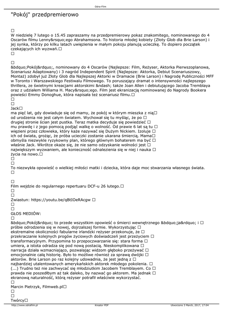 Odra-Film "Pokój" przedpremierowo W niedzielę 7 lutego o 15.45 zapraszamy na przedpremierowy pokaz znakomitego, nominowanego do 4 Oscarów filmu Lenny’ego Abrahamsona. To historia młodej kobiety (Złoty Glob dla Brie Larson) i jej synka, którzy po kilku latach uwięzienia w małym pokoju planują ucieczkę. To dopiero początek czekających ich wyzwań. „Pokój”, nominowany do 4 Oscarów (Najlepsze: Film, Reżyser, Aktorka Pierwszoplanowa, Scenariusz Adaptowany) i 3 nagród Independent Spirit (Najlepsze: Aktorka, Debiut Scenariuszowy, Montaż) zdobył już Złoty Glob dla Najlepszej Aktorki w Dramacie (Brie Larson) i Nagrodę Publiczności MFF w Toronto i Warszawskiego Festiwalu Filmowego. To poruszający dramat o intensywności najlepszego thrillera, ze świetnymi kreacjami aktorskimi – także Joan Allen i debiutującego Jacoba Tremblaya oraz z udziałem Williama H. Macy’ego. Film jest ekranizacją nominowanej do Nagrody Bookera powieści Emmy Donoghue, która napisała też scenariusz filmu. Jack ma pięć lat, gdy dowiaduje się od mamy, że pokój w którym mieszka z nią od urodzenia nie jest całym światem. Wychował się tu myśląc, że po drugiej stronie ścian jest pustka. Teraz matka decyduje się powiedzieć mu prawdę i z jego pomocą podjąć walkę o wolność. Od prawie 6 lat są tu więzieni przez człowieka, który każe nazywać się Dużym Nickiem. Izoluje ich od świata, grożąc, że próba ucieczki zostanie ukarana śmiercią. Mama obmyśla niezwykle ryzykowny plan, którego głównym bohaterem ma być właśnie Jack. Wkrótce okaże się, że nie samo odzyskanie wolności jest największym wyzwaniem, ale konieczność odnalezienia się w niej i nauka życia na nowo. To niezwykła opowieść o wielkiej miłości matki i dziecka, która daje moc stwarzania własnego świata. Film wejdzie do regularnego repertuaru DCF-u 26 lutego. Zwiastun: https://youtu.be/qBtIOeRAcgw GŁOS MEDIÓW: „Pokój” to przede wszystkim opowieść o śmierci wewnętrznego „ja” i próbie odrodzenia się w nowej, dojrzalszej formie. Wykorzystując ekstremalne okoliczności fabularne irlandzki reżyser przekonuje, że przekraczanie kolejnych progów życiowych doświadczeń jest przeżyciem transformacyjnym. Przypomina to przepoczwarzanie się: stara forma umiera, a istota odradza się pod nową postacią. Nieskomplikowana narracja działa wzmacniająco, pozwalając widzom głęboko przeżywać emocjonalnie całą historię. Było to możliwe również za sprawą dwójki aktorów. Brie Larson po raz kolejny udowadnia, że jest jedną z najbardziej utalentowanych amerykańskich aktorek młodego pokolenia. (...) Trudno też nie zachwycać się młodziutkim Jacobem Tremblayem. Co prawda nie poszedłbym aż tak daleko, by nazwać go aktorem. Ma jednak ekranową naturalność, którą reżyser potrafił właściwie wykorzystać. Marcin Pietrzyk, Filmweb.pl Twórcy http://www.odrafilm.pl Kreator PDF Utworzono 3 March, 2017, 17:04 Odra-Film unikają jednak pułapki, w którą „Pokój” mógłby tak łatwo, przy takim temacie, wpaść. W tle pobrzmiewa, oczywiście, historia Elisabeth Fritzl, przez niemal ćwierć wieku więzionej i gwałconej przez ojca w piwnicznym lochu bez okien. Ani na chwilę jednak film nie przemienia się w publicystykę czy sensację, ani tym bardziej w ckliwą obyczajówkę rodem z telewizyjnej ramówki „prawdziwe historie”. Padają pytania głębsze, bardziej uniwersalne i metaforyczne. Pojawia się więcej interpretacji, odniesień nawet filozoficznych (filozofem z wykształcenia jest reżyser). Emocje są o niebo szczersze. Historia porwania i ucieczki daje temu filmowi swoje ramy, punkty zwrotne, napięcie, ale jego prawdziwą siłą jest relacja pomiędzy chłopcem i matką, a także pomiędzy uprowadzonymi, a światem zewnętrznym. Ciekawy, mądry, bardzo przemyślany film. Znakomicie, przede wszystkim wiarygodnie zagrany przez Brie Larson, wschodzącą gwiazdę kina niezależnego, jak i Jacoba Tremblaya, chłopca z długimi, dziewczęcymi lokami. Ich naturalność, ich ekranowa więź są tak mocne, że wierzymy w nadzieję, z którą pod koniec filmu pozostawia nas Lenny Abrahamson. Dagmara Romanowska, OnetFilm Abrahamson bezbłędnie przekłada język powieści na obraz filmowy. Eric Kohn, indieWIRE Znakomity „Pokój” to film dający do myślenia i poruszający zarazem, a czasami wręcz obezwładniający. Jason Gorber, TwitchFilm Pokój / Room (Irlandia, Kanada 2015) reżyseria: Lenny Abrahamson scenariusz: Emma Donoghue obsada: Brie Larson, Jacob Tremblay, Joan Allen, William H. Macy zdjęcia: Danny Cohen muzyka: Stephen Rennicks dystrybutor: Monolith Films czas: 118' http://www.odrafilm.pl Kreator PDF Utworzono 3 March, 2017, 17:04