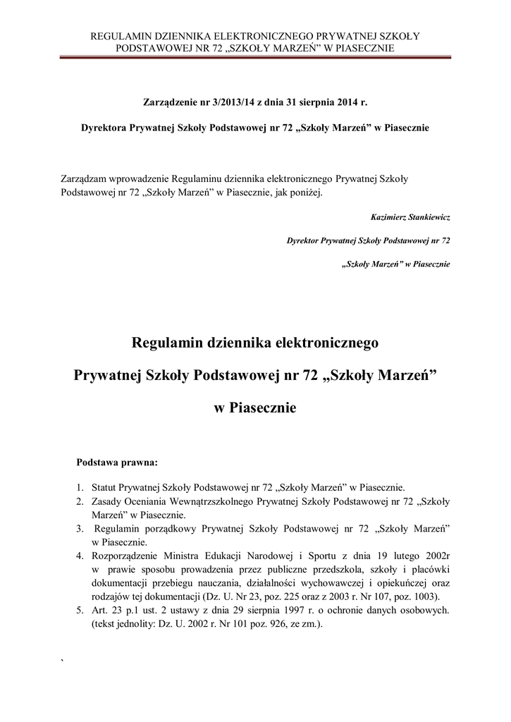 REGULAMIN DZIENNIKA ELEKTRONICZNEGO PRYWATNEJ SZKOŁY PODSTAWOWEJ NR 72 „SZKOŁY MARZEŃ” W PIASECZNIE Zarządzenie nr 3/2013/14 z dnia 31 sierpnia 2014 r. Dyrektora Prywatnej Szkoły Podstawowej nr 72 „Szkoły Marzeń” w Piasecznie Zarządzam wprowadzenie Regulaminu dziennika elektronicznego Prywatnej Szkoły Podstawowej nr 72 „Szkoły Marzeń” w Piasecznie, jak poniżej. Kazimierz Stankiewicz Dyrektor Prywatnej Szkoły Podstawowej nr 72 „Szkoły Marzeń” w Piasecznie Regulamin dziennika elektronicznego Prywatnej Szkoły Podstawowej nr 72 „Szkoły Marzeń” w Piasecznie Podstawa prawna: 1. Statut Prywatnej Szkoły Podstawowej nr 72 „Szkoły Marzeń” w Piasecznie. 2. Zasady Oceniania Wewnątrzszkolnego Prywatnej Szkoły Podstawowej nr 72 „Szkoły Marzeń” w Piasecznie. 3. Regulamin porządkowy Prywatnej Szkoły Podstawowej nr 72 „Szkoły Marzeń” w Piasecznie. 4. Rozporządzenie Ministra Edukacji Narodowej i Sportu z dnia 19 lutego 2002r w prawie sposobu prowadzenia przez publiczne przedszkola, szkoły i placówki dokumentacji przebiegu nauczania, działalności wychowawczej i opiekuńczej oraz rodzajów tej dokumentacji (Dz. U. Nr 23, poz. 225 oraz z 2003 r. Nr 107, poz. 1003). 5. Art. 23 p.1 ust. 2 ustawy z dnia 29 sierpnia 1997 r. o ochronie danych osobowych. (tekst jednolity: Dz. U. 2002 r. Nr 101 poz. 926, ze zm.). ` REGULAMIN DZIENNIKA ELEKTRONICZNEGO PRYWATNEJ SZKOŁY PODSTAWOWEJ NR 72 „SZKOŁY MARZEŃ” W PIASECZNIE I Postanowienia ogólne 6. Obowiązującym w szkole dziennikiem lekcyjnym jest dziennik elektroniczny (dalej: e-dziennik) prowadzony za pośrednictwem strony internetowej: www.dziennik.librus.pl 7. Podmiotami odpowiedzialnymi za niezawodność działania e-dziennika, ochronę danych osobowych umieszczonych na serwerach oraz tworzenie kopii zapasowych są – odpowiednio: - przedsiębiorstwo świadczące usługę dostarczenia szkole e-dziennika, - pracownicy szkoły uprawnieni do dostępu do e-dziennika (w tym edycji danych) - rodzice uczniów w zakresie im przysługującym. 8. Administratorem danych osobowych zawartych w e-dzienniku jest Prywatna Szkoła Podstawowa nr 72 „Szkoła Marzeń” w Piasecznie. 9. Podmiot świadczący usługę dostarczenia e-dziennika wyznacza „superadministratora”, tj. osobę odpowiedzialną za współpracę ze szkołę, której zakres określa umowa zawarta pomiędzy ww. podmiotem a Dyrektorem Szkoły. 10. E-dziennik umożliwia realizację zapisów zawartych w Zasadach Oceniania Wewnątrzszkolnego szkoły. II Konta w e-dzienniku 11. Każdy użytkownik, posiadający własne konto w e-dzienniku, odpowiada osobiście za ochronę danych osobowych w zakresie dla niego przewidzianym, zgodnie za zasadami zawartymi niniejszym regulaminie oraz w zakładce „pomoc” dostępnej po zalogowaniu się w e-dzienniku (http://www.dziennik.librus.pl/help). 12. Każdy uprawniony użytkownik e-dziennika, tj. : szkolny administrator e-dziennika, zastępca szkolnego administratora e-dziennika, uczeń, rodzic/opiekun prawny ucznia, sekretarz szkoły, podmiot zewnętrzny świadczący usługi serwisowania sprzętu komputerowego, wicedyrektor szkoły, dyrektor szkoły są zobowiązani do zachowania w tajemnicy hasła umożliwiającego dostęp do kont e-dziennika, również po upływie jego ważności. 13. W przypadku utraty hasła lub podejrzenia, że zostało odczytane/wykradzione przez osobę nieuprawnioną, użytkownik uprawniony zobowiązany jest do osobistego poinformowania o tym fakcie szkolnego administratora e-dziennika lub jego zastępcy. III Szkolny administrator e-dziennika 1. Szkolny administrator e-dziennika, a podczas jego nieobecności lub w sytuacjach uzgodnionych z dyrekcją szkoły – jego zastępca odpowiadają za poprawne funkcjonowanie dziennika elektronicznego. 2. Szkolnego administratora oraz jego zastępcę wyznacza dyrektor szkoły. REGULAMIN DZIENNIKA ELEKTRONICZNEGO PRYWATNEJ SZKOŁY PODSTAWOWEJ NR 72 „SZKOŁY MARZEŃ” W PIASECZNIE 3. Szkolny Administrator Dziennika Elektronicznego ma obowiązek: 3.1 Pobierania i archiwizowania całego dziennika szkoły w formacie XML do10 dnia następnego miesiąca. 3.2 Wykonania kopii każdej bazy i zapisania na płycie CD lub DVD oraz przenośnej pamięci (pen drivie). 3.3 Płyta powinna być opisana z podaniem zawartości i daty utworzenia archiwum. 3.4 Do pamięci przenośnej musi być załączona lista z informacją o zawartości urządzenia oraz daty archiwizacji. 3.5 Kopia na płycie przechowywana jest w szkolnym sejfie, na pamięci przenośnej zaś - w gabinecie dyrektora szkoły. IV Archiwizowanie dziennika 1. W terminie 10 dni od dnia zakończenia roku szkolnego, dane stanowiące dziennik elektroniczny zapisuje się na informatycznym nośniku danych, według stanu na dzień zakończenia roku szkolnego, w sposób zapewniający możliwość: 1) sprawdzenia integralności danych stanowiących dziennik elektroniczny przez zastosowanie podpisu elektronicznego, 2) weryfikacji podpisu elektronicznego lub danych identyfikujących, 3) odczytania danych stanowiących dziennik elektroniczny. 2. Dyrektor Szkoły stosuje podpis elektroniczny podczas archiwizowania edziennika. 3. W terminie 15 dni od dnia zakończenia roku szkolnego szkolny administrator edziennika przekazuje wydruk danych stanowiących dziennik elektroniczny do szkolnego archiwum. V Uczniowie 4. Na początku roku szkolnego nauczyciel odpowiedzialny za edukację z zakresu informatyki zapoznaje uczniów z zasadami korzystania z e-dziennika. 5. Uczeń osobiście odpowiada za swoje konto w dzienniku elektronicznym szkoły i ma obowiązek nieudostępniania go innym nieupoważnionym osobom. VI Rodzice/opiekunowie prawni uczniów 14. Rodzicowi/opiekunowi prawnemu ucznia przysługuje prawo bezpłatnego wglądu do informacji o swoim dziecku w e-dzienniku. 15. Rodzice/opiekunowie prawni ucznia mają swoje konto w e-dzienniku, umożliwiające podgląd postępów dziecka w nauce oraz informacji dot. jego za