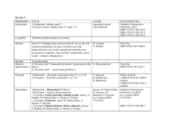 KLASA V PRZEDMIOT Język polski TYTUŁ 1) Podręcznik „Między nami 5” 2) Zeszyt ćwiczeń „Między nami 5”, część 1 i 2 j. angielski Informacja będzie podana we wrześniu Muzyka klasy IV-VI (kupują tylko uczniowie klas IV na trzy lata, lub uczniowie dochodzący do klasy 5-tej lub 6-tej). Jeśli podręcznik lub zeszyt ucznia zaginęły lub dochodzi nowy uczeń proszę o kupienie „I gra muzyka!” podręcznik i zeszyt ucznia - wydanie z ubiegłych lat. Plastyka Historia i społeczeństwo bez podręcznika 1)„Wczoraj i dziś”, Podręcznik do historii i społeczeństwa dla G. Wojciechowski klasy 5, 2) „Wczoraj i dziś” – zeszyt ucznia dla klasy 5 Przyroda 1.Podręcznik – „Przyroda z pomysłem, klasa V”, cz. I i II 2.Ćwiczenia – „Przyroda z pomysłem”, cz. I i II U. Depczyk, B. Sienkiewicz, H. Binkiewicz WSiP, od 2014r. 1-ISBN 978-83-02-13488-3 (całość) 2-ISBN 978-83-02-13491-3 (całość) Matematyka 1)Podręcznik „Matematyka 5” klasa V 2)Ćwiczenia – wersja A (trzyzeszytowa): - Ćwiczenia. Liczby naturalne i ułamki zwykłe, autorzy: Z. Bolałek, M. Dobrowolska, A. Mysior, S. Wojtan - Ćwiczenia. Geometria, autor: M. Dobrowolska, A. Mysior, P. Zarzycki - Ćwiczenia. Ułamki dziesiętne i liczby całkowite, autorzy: Z. Bolałek, M. Dobrowolska, A. Mysior, S. Wojtan autorzy: M. Dobrowolska, M. Jucewicz, M. Karpiński, P. Zarzycki nr w wykazie MEN: 773/2/2016 Gdańskie Wydawnictwo Oświatowe, od 2016r. nr w wykazie MEN: 773/2/2016 AUTOR Agnieszka Łuczak, Anna Murdzek WYDAWNICTWO Gdańskie Wydawnictwo Oświatowe, 2015 ISBN: 978-83-7420-128-5 ISBN: 978-83-7420-707-2 ISBN: 978-83-7420-708-9 M. Gromek, G. Kilbach Nowa Era ISBN-978-83-267-1940-0 Nowa Era ISBN 978-83-267-1282-1 ISBN: 978-83-7420-588-7 3) Matematyka 5. Zbiór zadań, autorzy: K. Zarzycka, P. Zarzycki Zajęcia komputerowe Język hiszpański E-book Informatyka Europejczyka (podręczniki zostaną zakupione przez nauczyciela we wrześniu) Kontynuacja - Clave de Sol 1 1)Podręcznik 2)zeszyt ćwiczeń Książki do nabycia w księgarniach internetowych, ale należy zamawiać je jak najszybciej, ponieważ okres oczekiwania jest długi. http://ksiegarniahiszpanska.pl/pl/dzieci/1214-clave-de-sol-1cwiczenia-9788496942196.html Danuta Kiałka, Katarzyna Kiałka Monica Caso, Helion (wydanie II) religia „Wierzę w Jednego Boga” M. Czyżewski, M. Polny, D. Kornacka Wydawnictwo Katechetyczne AZ-22-01/10-WA-3/14 etyka bez podręcznika Zajęcia techniczne “Jak to działa” dla klasy 5 Lech Łabecki, Marta Łabecka En Clave Nowa Era ISBN 978-83-267-2403-9