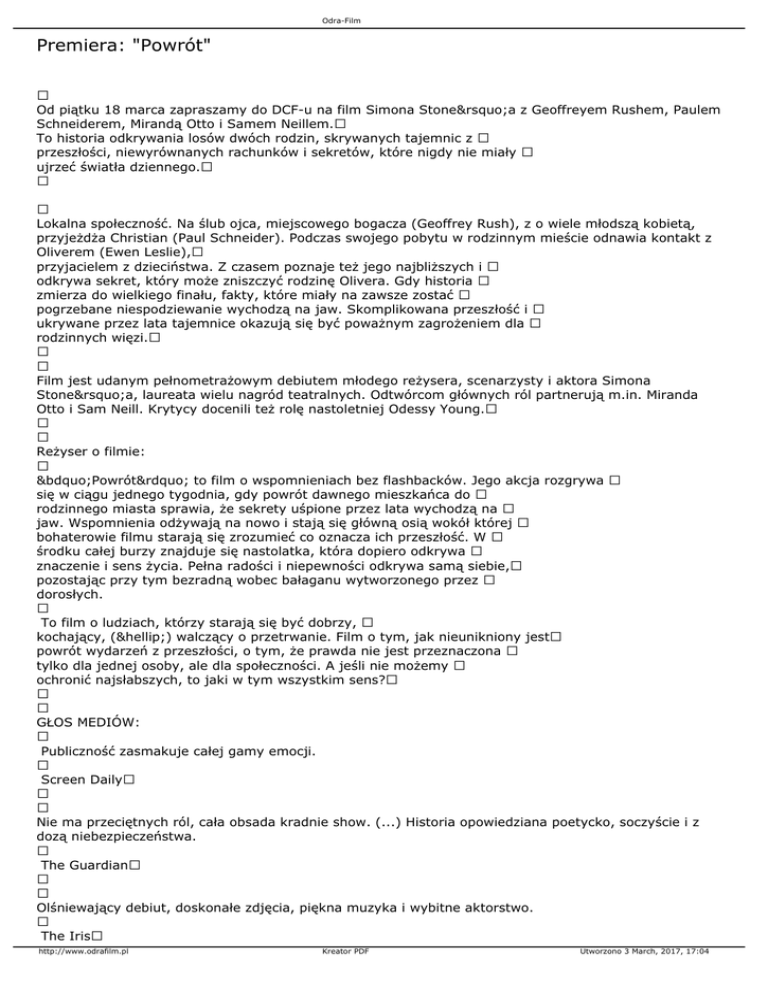 Odra-Film Premiera: "Powrót" Od piątku 18 marca zapraszamy do DCF-u na film Simona Stone’a z Geoffreyem Rushem, Paulem Schneiderem, Mirandą Otto i Samem Neillem. To historia odkrywania losów dwóch rodzin, skrywanych tajemnic z przeszłości, niewyrównanych rachunków i sekretów, które nigdy nie miały ujrzeć światła dziennego. Lokalna społeczność. Na ślub ojca, miejscowego bogacza (Geoffrey Rush), z o wiele młodszą kobietą, przyjeżdża Christian (Paul Schneider). Podczas swojego pobytu w rodzinnym mieście odnawia kontakt z Oliverem (Ewen Leslie), przyjacielem z dzieciństwa. Z czasem poznaje też jego najbliższych i odkrywa sekret, który może zniszczyć rodzinę Olivera. Gdy historia zmierza do wielkiego finału, fakty, które miały na zawsze zostać pogrzebane niespodziewanie wychodzą na jaw. Skomplikowana przeszłość i ukrywane przez lata tajemnice okazują się być poważnym zagrożeniem dla rodzinnych więzi. Film jest udanym pełnometrażowym debiutem młodego reżysera, scenarzysty i aktora Simona Stone’a, laureata wielu nagród teatralnych. Odtwórcom głównych ról partnerują m.in. Miranda Otto i Sam Neill. Krytycy docenili też rolę nastoletniej Odessy Young. Reżyser o filmie: „Powrót” to film o wspomnieniach bez flashbacków. Jego akcja rozgrywa się w ciągu jednego tygodnia, gdy powrót dawnego mieszkańca do rodzinnego miasta sprawia, że sekrety uśpione przez lata wychodzą na jaw. Wspomnienia odżywają na nowo i stają się główną osią wokół której bohaterowie filmu starają się zrozumieć co oznacza ich przeszłość. W środku całej burzy znajduje się nastolatka, która dopiero odkrywa znaczenie i sens życia. Pełna radości i niepewności odkrywa samą siebie, pozostając przy tym bezradną wobec bałaganu wytworzonego przez dorosłych. To film o ludziach, którzy starają się być dobrzy, kochający, (…) walczący o przetrwanie. Film o tym, jak nieunikniony jest powrót wydarzeń z przeszłości, o tym, że prawda nie jest przeznaczona tylko dla jednej osoby, ale dla społeczności. A jeśli nie możemy ochronić najsłabszych, to jaki w tym wszystkim sens? GŁOS MEDIÓW: Publiczność zasmakuje całej gamy emocji. Screen Daily Nie ma przeciętnych ról, cała obsada kradnie show. (...) Historia opowiedziana poetycko, soczyście i z dozą niebezpieczeństwa. The Guardian Olśniewający debiut, doskonałe zdjęcia, piękna muzyka i wybitne aktorstwo. The Iris http://www.odrafilm.pl Kreator PDF Utworzono 3 March, 2017, 17:04 Odra-Film Młodziutka Odessa Young jest rewelacyjna. Sydney Morning Herald Zwiastun: https://youtu.be/AnzTsElbjWg Powrót / The Daughter (Australia 2015) scenariusz i reżyseria: Simon Stone obsada: Geoffrey Rush, Paul Schneider, Ewen Leslie, Miranda Otto, Anna Torv, Odessa Young, Sam Neill zdjęcia: Andrew Commis muzyka: Veronika Jenet dystrybutor: Hagi Film czas: 96' http://www.odrafilm.pl Kreator PDF Utworzono 3 March, 2017, 17:04