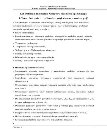 Uniwersytet Rolniczy w Krakowie Katedra Inżynierii i Aparatury Przemysłu Spożywczego Laboratorium Inżynierii i Aparatury Przemysłu Spożywczego 1. Temat ćwiczenia : „Charakterystyka komory nawilżającej” 2. Cel ćwiczenia: Wyznaczenie charakterystyki komory nawilżającej, która pozwala na określenie skuteczności procesów wymiany ciepła i masy w komorze przy określonych strumieniach powietrza i wody zraszającej. 3. Zakres wiadomości : Pojęcia podstawowe : wilgotność względna , wilgotność bezwzględna, stopień zwilżenia, skuteczność nawilżania, entalpia powietrza wilgotnego, procentowa zawartość wilgoci, Temperatura punktu rosy, Temperatura mokrego termometru, Wykres i,X oraz t,X dla powietrza wilgotnego, Metody nawilżania powietrza, Bilans cieplny i masowy procesu nawilżania, Metody i urządzenia do pomiaru wilgotności. 4. Metodyka wykonania ćwiczenia. Sporządzenie schematu stanowiska z naniesieniem punktów pomiarowych oraz przyrządów i sposobów pomiaru, Sprawdzenie ustawienia przyrządów pomiarowych oraz szczelności połączeń ciśnieniowych, Uruchomienie stanowiska poprzez włączenie zasilania głównego oraz uruchomienie wentylatora, Uruchomienie przepływu wody poprzez odblokowanie zaworu, nastawienie żądanej wartości natężenia zraszania Dla zmierzonych parametrów powietrza wlotowego ts1 , tm1, Pst, h wyznaczenie 1 , Y1, iG1 przy wykorzystaniu wykresu i,X, Dokonanie pomiarów parametrów wylotowych powietrza przy określonych stopniach zraszania, regulując natężenie przepływu wody Przeprowadzenie oceny stanu technicznego stanowiska po zakończeniu ćwiczenia, Obliczenie stopnia zraszania i skuteczności w poszczególnych punktach, Sporządzenie zależności skuteczności w funkcji stopnia zraszania. Ćwiczenie nr 1 Uniwersytet Rolniczy w Krakowie Katedra Inżynierii i Aparatury Przemysłu Spożywczego 5. Opracowanie sprawozdania Sprawozdanie powinno zawierać: schemat stanowiska pomiarowego obliczenia, zestawienie wyników pomiarów i obliczeń w tabeli, wykres zmian stanu powietrza w poszczególnych punktach naniesiony na wykres i-Y dla powietrza wilgotnego, wnioski. Ćwiczenie nr 2