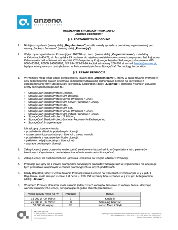 REGULAMIN SPRZEDAŻY PREMIOWEJ „Backup z Bonusem” § 1. POSTANOWIENIA OGÓLNE 1. Niniejszy regulamin (zwany dalej „Regulaminem”) określa zasady sprzedaży premiowej organizowanej pod nazwą „Backup z Bonusem” (zwanej dalej „Promocją”). 2. Wyłącznym organizatorem Promocji jest ANZENA sp. z o.o. (zwana dalej „Organizatorem”), z siedzibą w Katowicach 40-478, ul. Pszczyńska 15, wpisana do rejestru przedsiębiorców prowadzonego przez Sąd Rejonowy Katowice-Wschód w Katowicach Wydział VIII Gospodarczy Krajowego Rejestru Sadowego pod numerem KRS 0000433503, REGON 243039293, NIP 954-273-93-96, kapitał zakładowy 200 000 zł, e-mail: [email protected], będąca autoryzowanym dystrybutorem w Polsce rozwiązań firmy StorageCraft Technology Corporation. § 2. ZASADY PROMOCJI 1. W Promocji mogą wziąć udział przedsiębiorcy (zwani dalej „Uczestnikami”), którzy w czasie trwania Promocji w celu zabezpieczenia swoich systemów komputerowych zakupią jednorazowo licencje na korzystanie z oprogramowania firmy StorageCraft Technology Corporation (dalej: „Licencje”), dostępne w ramach aktualnej oferty rozwiązań StorageCraft tj.: • • • • • • • • • • • StorageCraft StorageCraft StorageCraft StorageCraft StorageCraft StorageCraft StorageCraft StorageCraft StorageCraft StorageCraft StorageCraft ShadowProtect Desktop, ShadowProtect SPX Desktop, ShadowProtect Server (Windows / Linux), ShadowProtect SPX Server (Windows / Linux), ShadowProtect SBS, ShadowProtect SPX SBS, ShadowProtect Virtual (Windows / Linux), ShadowProtect SPX Virtual (Windows / Linux), ShadowProtect IT Edition, ShadowProtect Granular Recovery for Exchange lub ImageManager lub zakupią Licencje w trybie: - przedłużenia aktualnie posiadanych Licencji, - rozszerzenia liczby posiadanych Licencji o zakup nowych, - przedłużenia z rozszerzeniem liczby Licencji, - pakietów i edycji specjalnych Licencji lub - upgrade posiadanych Licencji. 2. Zakup Licencji przez Uczestnika może zostać zrealizowany bezpośrednio u Organizatora lub u partnerów handlowych Organizatora, posiadających w ofercie rozwiązania StorageCraft. 3. Zakup Licencji dla osób trzecich nie uprawnia Uczestnika do wzięcia udziału w Promocji. 4. Promocja nie łączy się z innymi promocjami dotyczącymi produktów StorageCraft u Organizatora i nie obejmuje tych produktów zakupionych w cenach promocyjnych na innych podstawach. 5. Każdy Uczestnik, który w czasie trwania Promocji zakupi Licencje na warunkach wymienionych w § 2 pkt. 1 Regulaminu może zakupić w cenie 1 zł netto + 23% VAT wybrany bonus z tabeli w § 2 w pkt. 6 Regulaminu (dalej: „Bonus”). 6. W ramach Promocji Uczestnik może zakupić jeden z trzech rodzajów Bonusów. O rodzaju Bonusu decyduje wartość zakupionych Licencji, przypadająca na jeden z trzech przedziałów: Kwota zakupu netto na FV Przedział Bonus 15 000 zł - 24 999 zł 25 000 zł - 49 999 zł 50 000 zł i więcej I II III Kindle 8 Samsung Gear S2 Lenovo Moto X Style Przykład: kupując Licencje StorageCraft ShadowProtect SPX Desktop o wartości 15 000 zł netto Uczestnik może zakupić za 1 zł netto + 23% VAT Bonus z Przedziału I. 5. W razie niedostępności w sprzedaży danego modelu Bonusu, w szczególności w razie zakończenia sprzedaży bądź wycofania z rynku, Organizator zobowiązuje się do zaoferowania Uczestnikowi zakupu ekwiwalentnego Bonusu o podobnych parametrach. 6. Niezależnie od liczby dokonanych zakupów uprawniających do nabycia Bonusu, dany Uczestnik może zakupić Bonus tylko raz, po spełnieniu warunków zakupu w ramach Promocji. 7. W ciągu 14 dni od dnia zakupu Licencji, potwierdzonego otrzymaniem faktury, Uczestnik może skorzystać z oferty promocyjnej na zakup Bonusu. W tym celu Uczestnik powinien złożyć mailowe zamówienie na zakup Bonusu na adres: [email protected] z tematem „Backup z Bonusem”. W treści zamówienia Uczestnik powinien zawrzeć następujące potwierdzenie: Zamawiam Bonus z przedziału ... za 1 zł netto na warunkach określonych w regulaminie sprzedaży premiowej „Backup z Bonusem” oraz załączam fakturę z tytułu zakupu Licencji. 8. Organizator - po pozytywnej weryfikacji spełnienia przez Uczestnika warunków Promocji - zrealizuje zamówienie na zakup Bonusu, w terminie 30 dni od otrzymania tego zamówienia. Bonus wraz z fakturą zakupu zostanie dostarczony na koszt Organizatora przesyłką kurierską, adresowaną do Uczestnika, za potwierdzeniem odbioru i pobraniem kwoty 1 zł netto + 23% VAT. 9. Bonus może zostać odebrany osobiście w siedzibie Organizatora przez osobę wskazaną przez Uczestnika pod warunkiem posiadania przez tą osobę upoważnienia. 10. Uczestnikowi nie przysługuje prawo do zamiany Bonusu na ekwiwalent pieniężny. 11. Promocja trwa od 5 października 2016r. do 31 grudnia 2016r. § 3. TRYB POSTĘPOWANIA REKLAMACYJNEGO 1. Uczestnik może złożyć reklamację dotyczącą Promocji, w szczególności za pomocą e-maila na adres [email protected] z tematem „Backup z Bonusem”. Odpowiedź w sprawie reklamacji Organizator przekaże w sposób odpowiadający użytemu przez Uczestnika środkowi komunikacji. 2. Zgłoszone reklamacje będą rozpatrywane przez Organizatora w terminie 14 dni od dnia otrzymania reklamacji. § 4. POLITYKA PRYWATNOŚCI 1. Administratorem danych osobowych przetwarzanych w związku z uczestnictwem w Promocji jest Organizator. Dane osobowe Uczestników (imię, nazwisko, nazwa i adres firmy oraz stanowisko służbowe, telefon, adres mailowy) będą przetwarzanie wyłącznie w celu realizacji Promocji i nie są udostępniane osobom trzecim. Dane osobowe są przechowywane w systemie informatycznym Organizatora i są chronione zgodnie z ustawą z dnia 29 sierpnia 1997r. o ochronie danych osobowych (t.j. Dz.U.2016.922). 2. Podanie danych osobowych jest dobrowolne. Uczestnik ma w każdym czasie zapewniony dostęp do swoich danych osobowych i może żądać ich niezwłocznego 