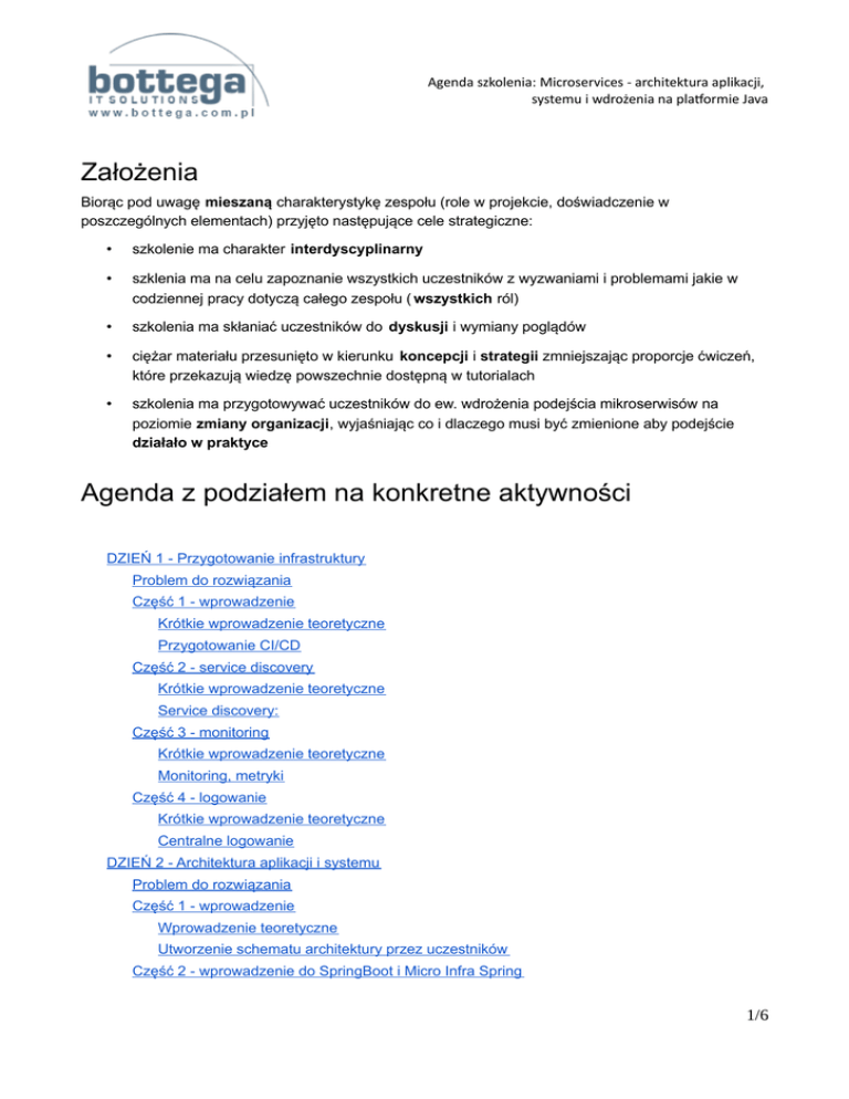 Agenda szkolenia: Microservices - architektura aplikacji, systemu i wdrożenia na platformie Java Założenia Biorąc pod uwagę mieszaną charakterystykę zespołu (role w projekcie, doświadczenie w poszczególnych elementach) przyjęto następujące cele strategiczne: • szkolenie ma charakter interdyscyplinarny • szklenia ma na celu zapoznanie wszystkich uczestników z wyzwaniami i problemami jakie w codziennej pracy dotyczą całego zespołu ( wszystkich ról) • szkolenia ma skłaniać uczestników do dyskusji i wymiany poglądów • ciężar materiału przesunięto w kierunku koncepcji i strategii zmniejszając proporcje ćwiczeń, które przekazują wiedzę powszechnie dostępną w tutorialach • szkolenia ma przygotowywać uczestników do ew. wdrożenia podejścia mikroserwisów na poziomie zmiany organizacji, wyjaśniając co i dlaczego musi być zmienione aby podejście działało w praktyce Agenda z podziałem na konkretne aktywności DZIEŃ 1 - Przygotowanie infrastruktury Problem do rozwiązania Część 1 - wprowadzenie Krótkie wprowadzenie teoretyczne Przygotowanie CI/CD Część 2 - service discovery Krótkie wprowadzenie teoretyczne Service discovery: Część 3 - monitoring Krótkie wprowadzenie teoretyczne Monitoring, metryki Część 4 - logowanie Krótkie wprowadzenie teoretyczne Centralne logowanie DZIEŃ 2 - Architektura aplikacji i systemu Problem do rozwiązania Część 1 - wprowadzenie Wprowadzenie teoretyczne Utworzenie schematu architektury przez uczestników Część 2 - wprowadzenie do SpringBoot i Micro Infra Spring 1/6 Agenda szkolenia: Microservices - architektura aplikacji, systemu i wdrożenia na platformie Java Krótkie wprowadzenie teoretyczne Tworzenie pierwszych serwisów przez uczestników Część 3 - wprowadzenie do testowania mikroserwisów Krótkie wprowadzenie teoretyczne AccuREST DZIEŃ 3 - hackathon Problem do rozwiązania DZIEŃ 1 - Przygotowanie infrastruktury Problem do rozwiązania W świecie mikroserwisów bardzo istotną rolą jest komunikacja. DevOpsi oraz Developerzy powinni bardzo mocno ze sobą współpracować. Usługi utworzone tego dnia przez uczestników będą wykorzystane przy hacakathonie zorganizowanym ostatniego dnia. Część 1 - wprowadzenie Krótkie wprowadzenie teoretyczne • Czym jest DevOps? • CI/CD • Infrastructure as a Code (Jenkins + Jenkins Job DSL) • Przedstawienie Vagrant i Ansible Przygotowanie CI/CD Warsztat, na którym uczestnicy będą tworzyć lokalne środowisko w kontenerze lub maszynie wirtualnej. Dobrani w pary (najlepiej DevOps + Developer) mają za zadanie postawić następujące części infrastruktury przy użyciu Ansible: • Jenkins • Rundeck • Nexus 2/6 Agenda szkolenia: Microservices - architektura aplikacji, systemu i wdrożenia na platformie Java Część 2 - service discovery Krótkie wprowadzenie teoretyczne • Co to jest service discovery Service discovery: Warsztat, na którym uczestniczy będą stawiać Ansiblem następujące usługi: • ZooKeeper • Exhibitor Część 3 - monitoring Krótkie wprowadzenie teoretyczne • Co to jest KPI? • Po co warto zbierać metryki? Monitoring, metryki Warsztat, na którym uczestniczy będą stawiać Ansiblem następujące usługi: • Graphite • Grafana • Collectd • Nagios Uczestnicy będą monitorować stan ich komputerów. Część 4 - logowanie Krótkie wprowadzenie teoretyczne • Jak zbierać logi w systemach rozproszonych 3/6 Agenda szkolenia: Microservices - architektura aplikacji, systemu i wdrożenia na platformie Java Centralne logowanie Warsztat, na którym uczestniczy będą stawiać Ansiblem następujące usługi: • Elasticsearch • Logstash • Kibana Uczestnicy będą zbierać logi z usług systemowych. DZIEŃ 2 - Architektura aplikacji i systemu Problem do rozwiązania Mikrousługi to coś więcej niż osobne repozytorium. Rzadko kiedy ktoś zadaje jedno z poniższych pytań jak chce wprowadzić mikroserwisy do organizacji: • Czy za wprowadzeniem architektury mikroserwisowej powinna pójść zmiana struktury organizacji • Jak deployować mikrousługi? (Każdy osobno, czy wszystko razem?) • Jak testować integrację mikrousług? (End to end czy w izolacji?) • Jak upewnić się, że nie złamano kompatybilnośći API? (Wersjonować API czy nie?) • Skąd użytkownik ma wiedzieć, kto ma jakie API? Warsztaty obejmować będą teoretyczne rozważania na wyżej wymienione pytania oraz ich praktyczną realizację przez uczestników. Celem będzie przekazanie informacji, iż nie ma jedynego słusznego podejścia - wszystko zależy od wielu czynników. Część 1 - wprowadzenie Wprowadzenie teoretyczne • Co to jest Prawo Conwaya i dlaczego jest ważne? • Zalety i wyzwania związane z użyciem mikroserwisów 4/6 Agenda szkolenia: Microservices - architektura aplikacji, systemu i wdrożenia na platformie Java • Kiedy warto myśleć o rozpoczęciu pracy z wykorzystaniem architektury opartej na mikroserwisach • Projektowanie z myślą o awariach • Decentralizacja zarządzania danymi • Smart endpoints, dump pipes • Strategie refaktoryzacji systemów monolitycznych • Jak określić granicę serwisów • Podejście Bounded Context z DDD • Antywzorce: Nanoservice • Debugowanie problemów na produkcji - CorrelationID w headerach Część teoretyczna odbędzie się w formie dyskusji z uczestnikami w celu wymiany doświadczeń. Utworzenie schematu architektury przez uczestników • Jak podzielić ludzi i zespoły? DB, QA, Developers, Ops • Jak obsłużyć awarie? • Jak trzymać konfigurację? • Jak podzielić części aplikacji? Część 2 - wprowadzenie do SpringBoot i Micro Infra Spring Krótkie wprowadzenie teoretyczne • SpringBoot - Jedna technologia, która pokrywa całość developmentu • Micro Infra Spring (Rozszerzenie SpringBoot i SpringCloud o brakujące ogniwa w architekturze mikroserwisowej) • Publikacja API przy pomocy Swaggera Tworzenie pierwszych serwisów przez u
