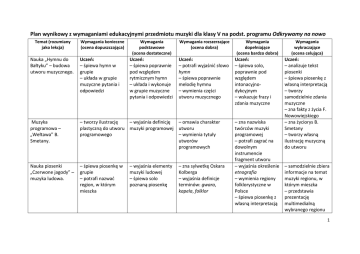 Plan wynikowy z wymaganiami edukacyjnymi przedmiotu muzyki dla klasy V na podst. programu Odkrywamy na nowo Temat (rozumiany jako lekcja) Wymagania konieczne (ocena dopuszczająca) Wymagania podstawowe (ocena dostateczne) Wymagania rozszerzające (ocena dobra) Uczeń: – śpiewa poprawnie pod względem rytmicznym hymn – układa i wykonuje w grupie muzyczne pytania i odpowiedzi Uczeń: – potrafi wyjaśnić słowo hymn – śpiewa poprawnie melodię hymnu – wymienia części utworu muzycznego Nauka „Hymnu do Bałtyku” – budowa utworu muzycznego. Uczeń: – śpiewa hymn w grupie – układa w grupie muzyczne pytania i odpowiedzi Muzyka programowa – „Wełtawa” B. Smetany. – tworzy ilustrację – wyjaśnia definicję – omawia charakter plastyczną do utworu muzyki programowej utworu programowego – wymienia tytuły utworów programowych Nauka piosenki „Czerwone jagody” – muzyka ludowa. – śpiewa piosenkę w grupie – potrafi nazwać region, w którym mieszka – wyjaśnia elementy muzyki ludowej – śpiewa solo poznaną piosenkę – zna sylwetkę Oskara Kolberga – wyjaśnia definicje terminów: gwara, kapela, folklor Wymagania dopełniające (ocena bardzo dobra) Uczeń: – śpiewa solo, poprawnie pod względem intonacyjnodykcyjnym – wskazuje frazy i zdania muzyczne – zna nazwiska twórców muzyki programowej – potrafi zagrać na dowolnym instrumencie fragment utworu – wyjaśnia określenie etnografia – wymienia regiony folklorystyczne w Polsce – śpiewa piosenkę z własną interpretacją Wymagania wykraczające (ocena celująca) Uczeń: – analizuje tekst piosenki – śpiewa piosenkę z własną interpretacją – tworzy samodzielnie zdania muzyczne – zna fakty z życia F. Nowowiejskiego – zna życiorys B. Smetany – tworzy własną ilustrację muzyczną do utworu – samodzielnie zbiera informacje na temat muzyki regionu, w którym mieszka – przedstawia prezentację multimedialną wybranego regionu 1 Poznajemy instrumenty strunowosmyczkowe. – wymienia instrumenty strunowesmyczkowe – zna podział instrumentów strunowych – rozpoznaje barwy dźwięków poszczególnych instrumentów – omawia budowę skrzypiec Pierwiastki narodowe w muzyce Fryderyka Chopina. – maluje ilustracje plastyczną do słuchanych utworów – wymienia tytuły słuchanych utworów Chopina – omawia charakter utworów – zna życiorys Fryderyka Chopina Zabawy z rondem. – rozumie pojęcie ronda muzycznego – wymienia elementy ronda – posługuje się schematem graficznym ronda – wyjaśnia określenie wirtuoz – wymienia nazwiska słynnych kompozytorów i wirtuozów instrumentów strunowosmyczkowych – określa nazwy polskich tańców narodowych w słuchanych utworach – wyjaśnia cytat: „Rodem warszawianin, sercem Polak, a talentem świata obywatel” – układa własne kuplety do podanej melodii – wyjaśnia określenie stylizacja – rozpoznaje tytuły i nazwiska kompozytorów słuchanych utworów na instrumenty strunowosmyczkowe – zauważa motyw piosenki ludowej w słuchanym utworze – rozpoznaje formy muzyczne – tworzy rondo rytmicznomelodyczne 2 Znaki chromatyczne w muzyce. – wymienia znaki chromatyczne – wymienia znaki chromatyczne i omawia ich funkcje – rozwiązuje krzyżówki i rebusy muzyczne – czyta pisownię muzyczną, uwzględniając znaki chromatyczne – omawia różnice pomiędzy znakami chromatycznymi a przykluczowymi – potrafi zagrać na dowolnym instrumencie utwory z dwoma znakami chromatycznymi – nazywa trójdźwięki dur-moll Nauka pieśni „Prząśniczka” Stanisława Moniuszki. – śpiewa piosenkę w grupie – wymienia tytuły słuchanych utworów Stanisława Moniuszki – wykazuje różnice pomiędzy śpiewem a cappella, a śpiewem z akompaniamentem – wyznacza kierunki melodii wznoszącej i opadającej Opera – widowisko muzyczne. – wyjaśnia określenie opera – zna zasady zachowania się w operze – wymienia elementy opery – analizuje tekst piosenki – śpiewa piosenkę z własną interpretacją – wie, co to jest melodia – wskazuje nazwisko twórcy opery narodowej oraz tytuły oper – wyjaśnia określenie uwertura „Cicha noc” – kolędy i pastorałki. – śpiewa piosenkę w grupie – wyjaśnia pojęcie kolędy – potrafi wskazać gmach opery najbliższy jego miejscu zamieszkania – wymienia nazwiska twórców oper i słynnych śpiewaków operowych – omawia różnicę – analizuje tekst pomiędzy kolędą a kolędy pastorałką – śpiewa kolędę z – wykonuje fragment własną interpretacją akompaniamentu do poprawnie pod kolędy „Gdy się Chrystus względem rodzi” intonacyjnorytmicznym – śpiewa fragmenty znanych oper S. Moniuszki – zna libretta oper: „Straszny dwór” i „Halka” – wykonuje akompaniament do kolędy „Gdy się Chrystus rodzi” 3 Nauka piosenki „Płonie ognisko” – rodzaje głosów ludzkich. Instrumentacja utworu „Dzwonki sań”. – śpiewa piosenkę w grupie – potrafi przyjąć właściwą pozę śpiewaczą – wyjaśnia znaczenie określeń: dykcja, intonacja – potrafi podzielić głosy wg klasyfikacji – rozpoznaje rodzaje głosów ludzkich – śpiewa piosenkę w grupie – śpiewa solo piosenkę poprawnie pod względem intonacyjnodykcyjnym – wykonuje w grupie akompaniament do utworu – opracowuje własny pomysł akompaniamentu do utworu „Marzenie” Roberta Schumanna – nastroje w muzyce. Poznajemy instrumenty strunowe-szarpane. – maluje obraz odpowiadający nastrojowi utworu – wymienia instrumenty strunowo-szarpane – wykonuje za nauczycielem prosty układ rytmiczny na instrumentach perkusyjnych – wyjaśnia, od czego zależy charakter i nastrój utworu – charakteryzuje poszczególne instrumenty strunowo-szarpane – wymienia elementy muzyki wpływające na nastrój utworu – rozpoznaje barwy dźwięków poszczególnych instrumentów – omawia budowę gitary – wymienia podstawowe znaki dynam