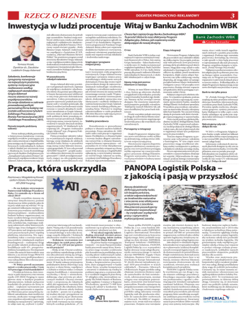 DODATEK PROMOCYJNO-REKLAMOWY RZECZ O BIZNESIE 3 Inwestycja w ludzi procentuje Witaj w Banku Zachodnim WBK Tomasz Krzak, Dyrektor ds. Zasobów Ludzkich Grupy Adamed Szkolenia, konferencje i programy rozwojowe na najwyższym poziomie, systemy motywacyjne realizowane według najlepszych standardów – Grupa Adamed mocno stawia na rozwój współpracowników. Za swoje działania w zakresie prowadzonej polityki personalnej firma kolejny raz została odznaczona tytułem Solidnego Pracodawcy Branży Farmaceutycznej 2015 i Solidnego Pracodawcy 2015. Rozwój zespołu podstawą sukcesu Firma realizuje politykę personalną, w której proces kształcenia i rozwoju współpracowników postrzegany jest jako ważna inwestycja w kapitał ludzki, przyczyniająca się do osiągania sukcesów firmowych i indywidualnych. Jednym z takich działań jest utworzenie wraz z Akademią im. Leona Koźmińskiego pierwszych Studiów Podyplomowych: „Zarządzanie Łańcuchem Dostaw”, dedykowanych współpracownikom Grupy Adamed. Zakres merytoryczny zajęć zo- stał całkowicie dostosowany do potrzeb jego uczestników. Studenci mają możliwość zdobywania wiedzy pod okiem najlepszych wykładowców akademickich, a także praktyków biznesu. Otworzony został również projekt: „Perły Biznesu Grupy Adamed”, realizowany we współpracy z Instytutem ICAN, wydawcą „Harvard Business Review Polska”, Ten prestiżowy program został stworzony dla talentów Grupy Adamed, a więc współpracowników dążących do doskonalenia świadomości biznesowej, umiejętności i kompetencji jako kluczowych czynników budujących przewagę konkurencyjną firmy. W poszukiwaniu młodych talentów Grupa Adamed aktywnie uczestniczy w programach stażowych. Zaprasza do współpracy studentów i absolwentów, którzy chcą poznać specyfikę pracy w branży farmaceutycznej i zdobywać w niej swoje pierwsze doświadczenia zawodowe. Celem prowadzenia programów stażowych i praktyk jest wyłanianie osób o wysokim potencjale, dla których możliwe jest budowanie ścieżki rozwoju w ramach aktualnych możliwości zatrudnienia w Grupie Adamed. Firmowe staże i praktyki to szansa dla osób ambitnych, które poszukują ciekawych wyzwań zawodowych. Najlepsi otrzymują szansę rozwoju kariery zawodowej w ramach obecnych struktur organizacyjnych. W działaniach tych wspierają ich: „Program Ambasador Grupy Adamed” oraz „Programy Praktyk Letnich i Staży”. Firma poszukuje talentów także na wcześniejszych etapach edukacji, kierując swoje działania do zdolnych młodych ludzi, którzy w przyszłości mają szansę zostać liderami innowacyjnej gospodarki. W tym celu powstał ADAMED SmartUP – projekt naukowo-edukacyjny skierowany do uczniów gimnazjów i szkół ponadgimnazjalnych, mający na celu popularyzację nauk ścisłych i przyrodniczych oraz wsparcie rozwoju pasji i zainteresowań szczególnie uzdolnionej młodzieży. Do pierwszej edycji programu zgłosiło się ponad 5,5 tys. kandydatów. Organizatorem programu jest Fundacja Grupy Adamed, której celem jest wspieranie działalności badawczo-rozwojowej, naukowej i oświatowej, popularyzacja nauki oraz wsparcie rozwoju młodzieży i środowiska naukowego. Inspirujące i przyjazne miejsce pracy Poza starannym procesem rekrutacji i tworzeniem wielu programów rozwojowych, Grupa Adamed tworzy inspirujące i przyjazne miejsce pracy, umożliwiające zdobywanie nowych doświadczeń. Firma daje swoim współpracownikom dostęp do najnowocześniejszych technologii i możliwości współpracy z ośrodkami naukowymi, jak również stwarza im szansę szeroko rozumianego rozwoju i nauki. Wzajemny szacunek, otwartość i innowacyjność, jakość, doskonałość operacyjna oraz elastyczność i szybkość działania to wartości korporacyjne Grupy Adamed, które istotnie kształtują politykę personalną firmy. Wartości te znajdują odzwierciedlenie w wielu projektach HR, które kluczowo wpływają na proces doskonalenia całego zespołu. Stabilny pracodawca Konsekwencja w prowadzonej polityce w obszarze zasobów ludzkich procentuje. Firma zatrudnia ok. 1600 osób i wiele z nich pracuje w organizacji latami. Przykładowo, w obszarze badań i rozwoju średnia długość zatrudnienia wynosi 8 lat, w obszarze finansów, wsparcia biznesu i operacyjnym – odpowiednio 10, 12 i 16 lat. Menedżerowie z obszaru sprzedaży związani są z firmą nawet 10 lat. Inwestycje w kapitał ludzki opłacają się, o czym świadczy nieustanny rozwój Grupy Adamed na rynku, a uzyskany tytuł Solidnego Pracodawcy Roku jest tego potwierdzeniem. Praca, która uskrzydla Rozmowa z Magdaleną Kowal, szefem Działu Personalnego ATI ZKM Forging. – Po raz kolejny otrzymujecie Państwo tytuł Solidnego Pracodawcy Roku. Co zmieniło się w firmie od edycji 2014? – Przede wszystkim staramy się utrzymać dotychczasowy poziom i kontynuować dobre praktyki, jakie do tej pory udało nam się wdrożyć. W ciągu ostatnich kilkunastu miesięcy intensywnie pracowaliśmy nad kilkoma dużymi projektami – zrealizowaliśmy badanie kultury organizacyjnej, na bazie wyników którego stworzyliśmy szczegółowy plan działania w obszarze ZZL na kolejne lata, wspierający realizację założonych celów biznesowych. Oprócz tego, wraz z kolegami z Grupy ATI pracujemy nad integracją systemu ocen pracowniczych przez wspólną platformę internetową. Nie zapomnieliśmy także o rozwoju naszych pracowników i działaniach employer brandingowych – realizujemy drugi już projekt szkoleń podnoszących kwalifikacje osób 45+, przeprowadziliśmy kompleksowy Development Centre dla naszych kierowników oraz liderów, a na stronie Grupy PRACUJ stworzyliśmy nowy profil pracodawcy oraz nakręciliśmy film rekrutacyjno-wizerunkowy. – W Polsce powoli zaczynamy mówić o rynku pracownika. Czym ATI przyciąga swoich kandydatów? – Produkcja lotnicza, duże inwestycje w park maszynowy oraz renoma marki ATI ZKM Forging to nasze g